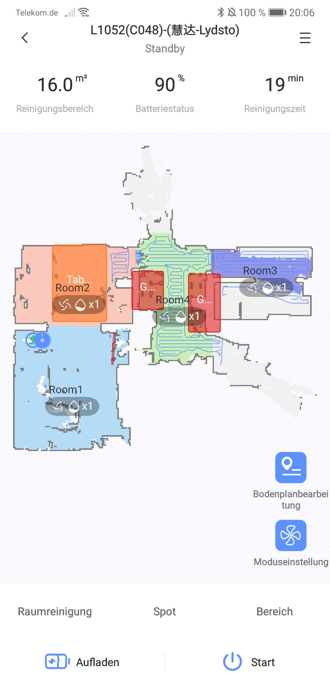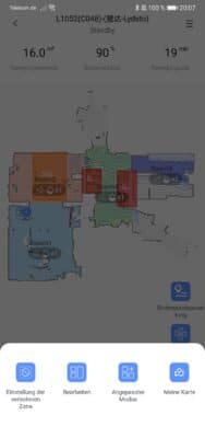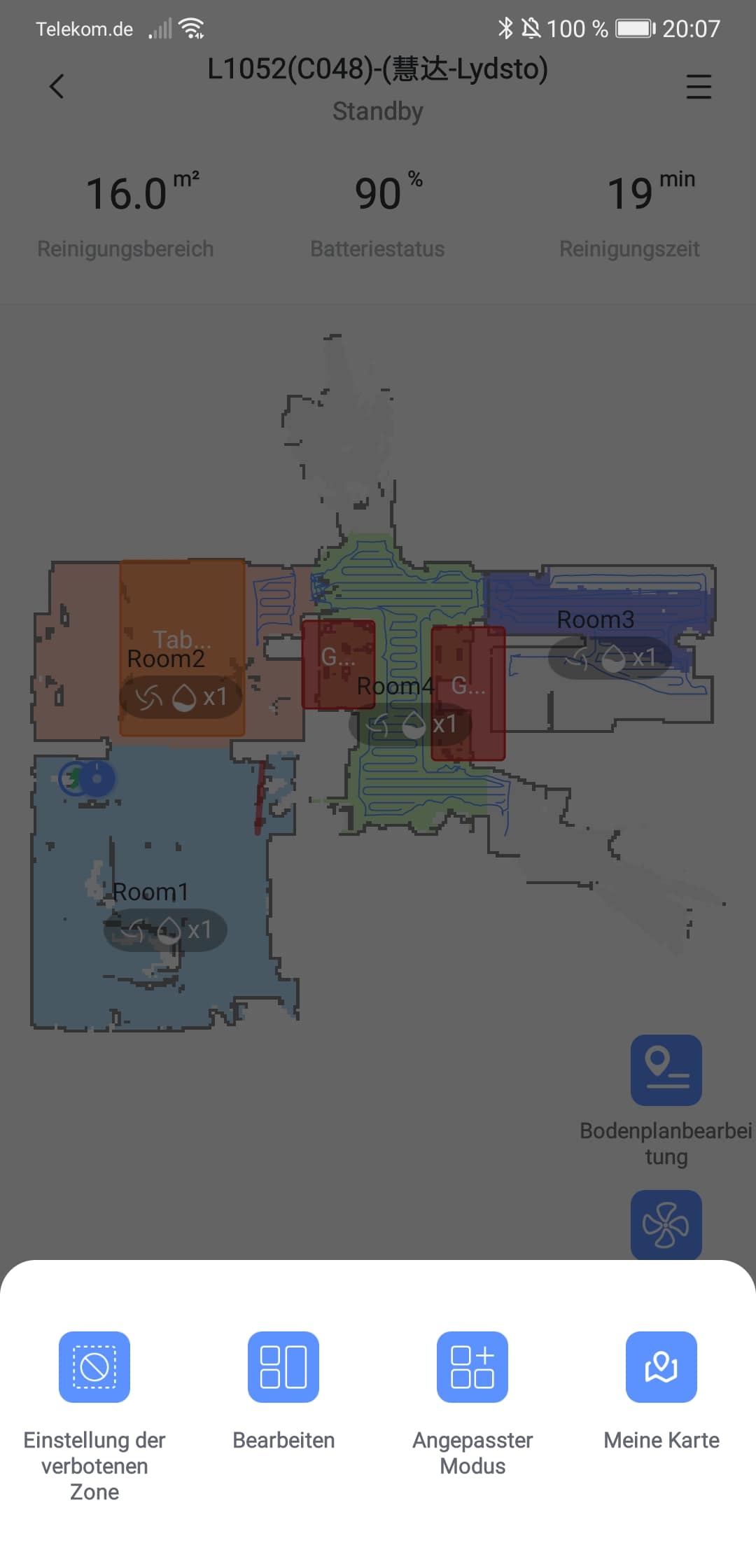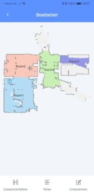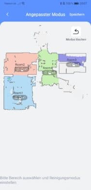 Die hauseigene Lydsto App bietet eine Vielzahl von nützlichen Funktionen und Einstellungen. Bereits auf der Startseite lässt sich der R1 bequem, auch von unterwegs, starten. Außerdem befindet sich hier unter „Bodenplanbearbeitung“ ein weiteres Menü, in dem das Verhalten des Saugroboters angepasst werden kann. Angefangen mit der Einstellung von verbotenen Zonen. Hier lassen sich sogenannte No-Go-Zonen erstellen, in denen nicht gesaugt werden darf. Auch lässt sich für die jeweiligen Zonen einstellen, ob das Wischen in der vorgegebenen Zone untersagt ist. Die Zonen lassen sich auf der Karte leider nur als Rechtecke bis zu einer bestimmten Größe erstellen, sodass verwinkelte Stellen nur mit mehreren Zonen unterschiedlicher Größe abgedeckt werden können. Außerdem lassen sich über die restlichen Reiter des Menüs, Räume trennen und die Saug- und Wischintensivität in den unterschiedlichen Räumen anpassen.