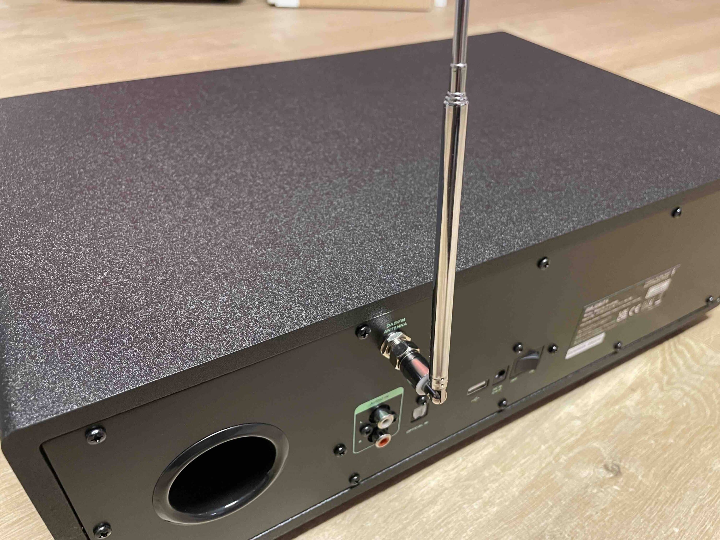 An der Rückseite sitzen wiederum die Eigänge des Systems. Weiterhin befindet sich hier die Antenne für den klassischen Empfang von Radiosignalen und ein Kippschalter. Zum System gibt es obendrein eine praktische Fernbedienung, die recht unauffällig daherkommt.