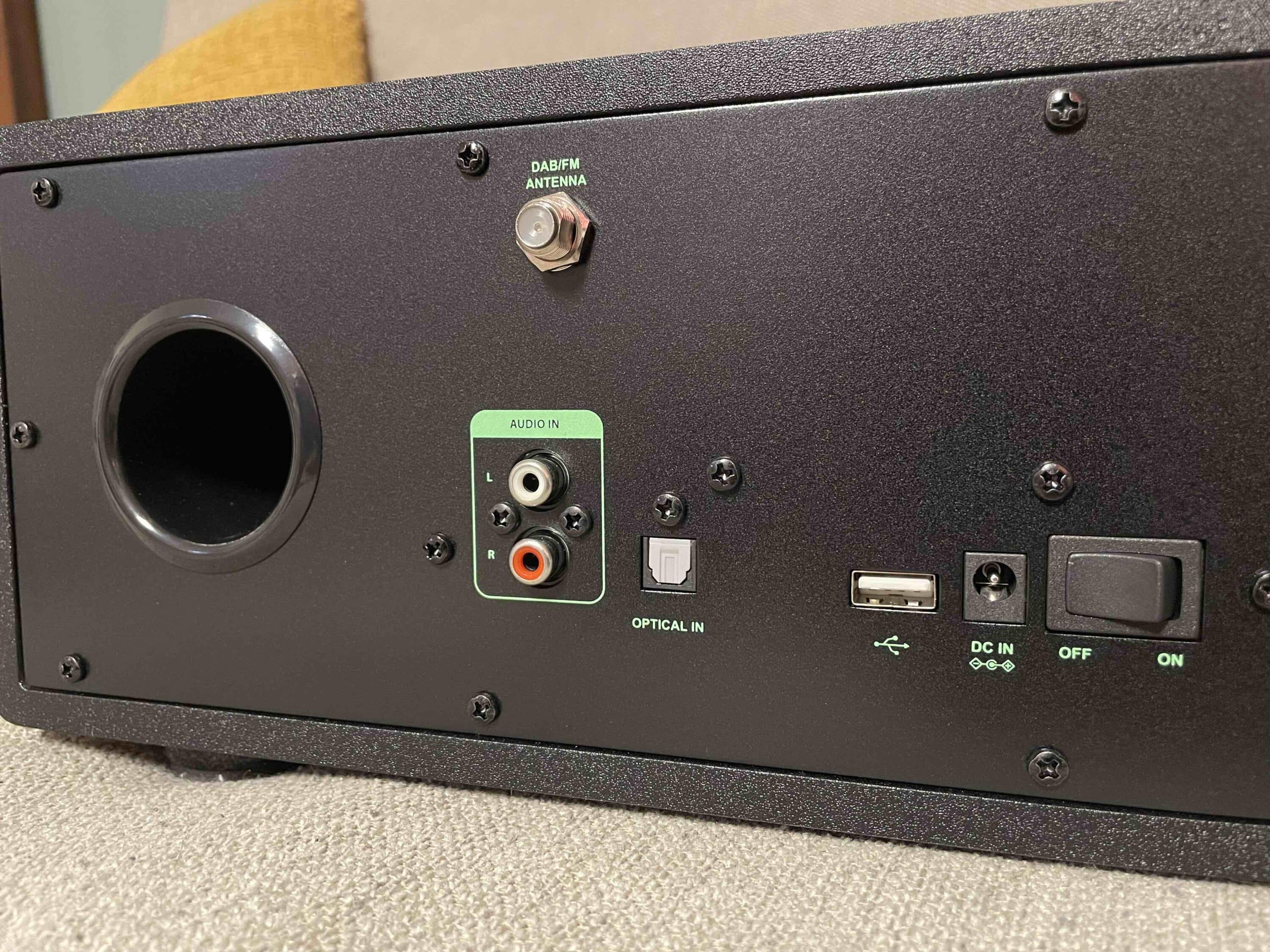 Auf der Geräterückseite habt ihr wiederum die Möglichkeit über AUX- und Optical-In eine klassische Kabelverbindung herzustellen. Auch ein USB-Port sitzt hier. Eine echtes Highlight ist natürlich der CD-Einschub an der Front. Hier sitzt auch ein 3,5-mm-Klinkenanschluss zum Anschließen eurer Kopfhörer und ein klassischer AUX-Input.