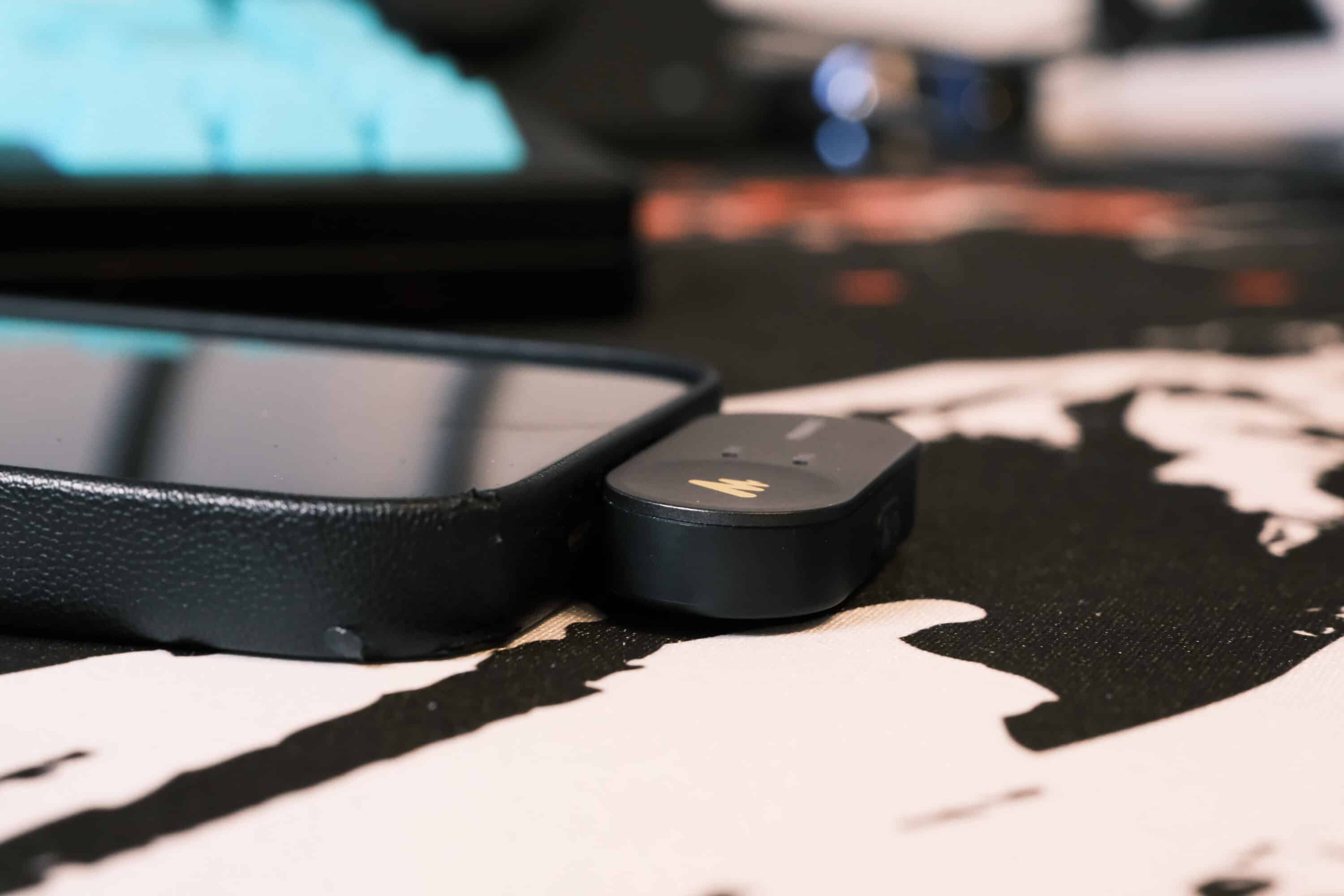 Wollt ihr das T5 jedoch mit eurem Smartphone nutzen, dann kommen hierfür die beiden Mobile-Empfänger mit USB-C beziehungsweise Lightning zum Einsatz. Diese sind mit ihrem flachen, pillenförmigen Design dünner als ein Smartphone selbst (im Bild anhand des Beispiels eines iPhone 15 Pro).