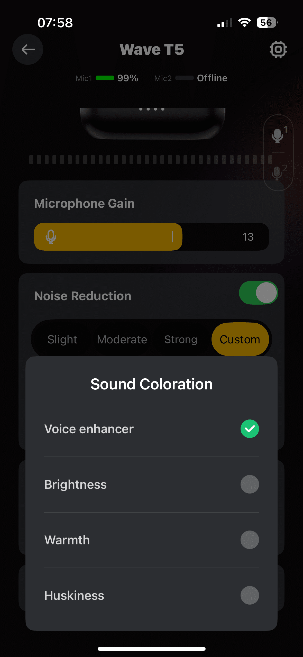 - Sound Coloration erlaubt es euch, die Klangfarbe eurer Aufnahmen etwas zu verändern. Hier stehen euch die Optionen Voice Enhacer, Huskiness, Warmth und Brightness zur Verfügung, auf die wir weiter unten noch eingehen werden.