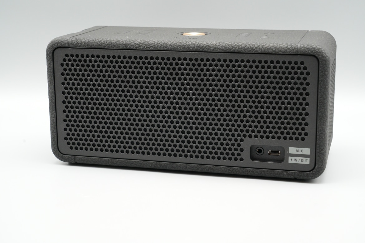 Hinten finden, in der linken unteren Ecke, die Anschlüsse Platz. Konkret setzt der Middleton auf einen analogen 3,5-mm-Klinkenanschluss, sowie einen USB-C-Port zum Laden. An der rechten Seite kann zudem ein Trageriemen angebracht werden – eine entsprechende gummierte Lösung leger der Hersteller dem Lieferumfang direkt bei.