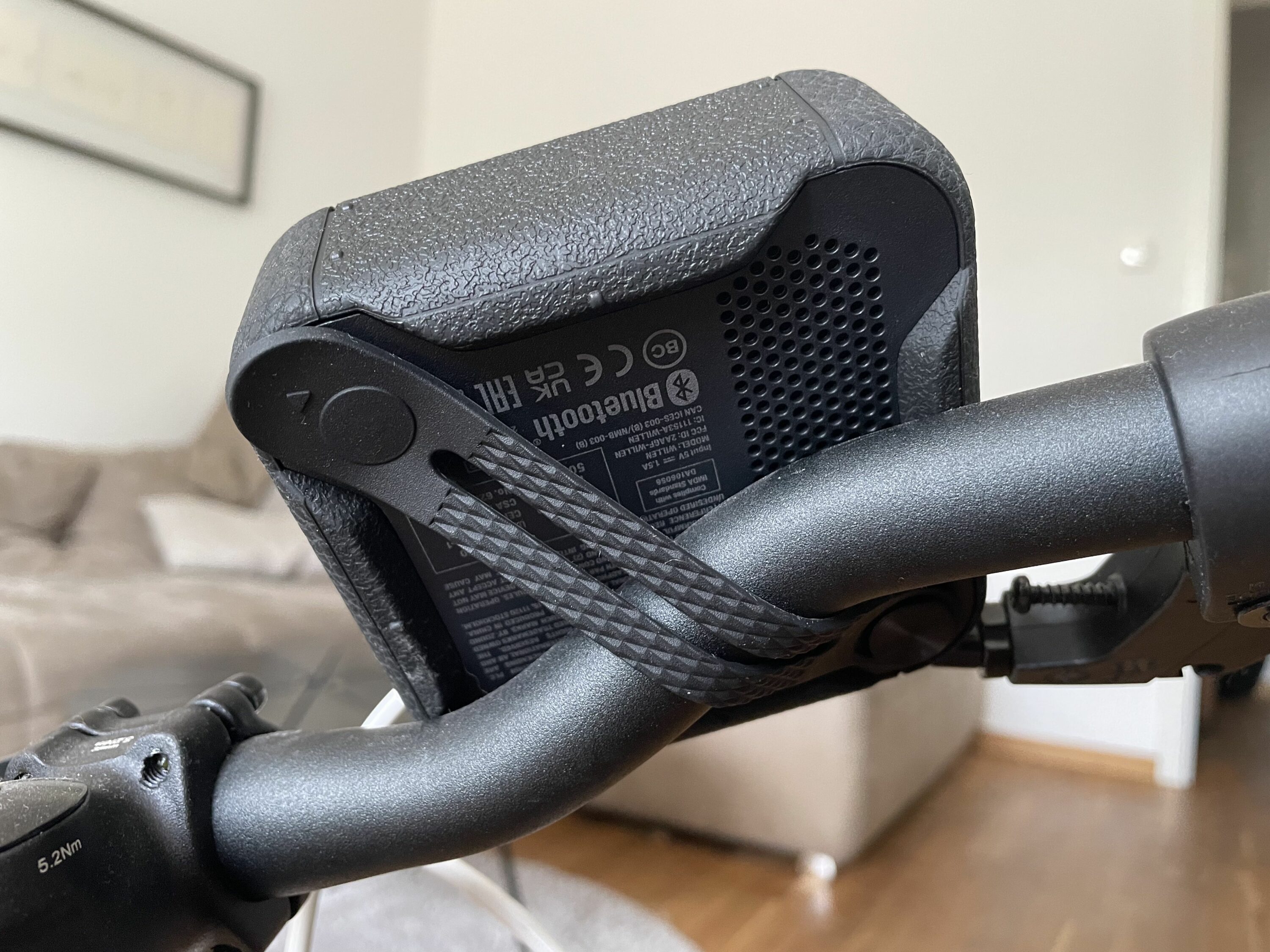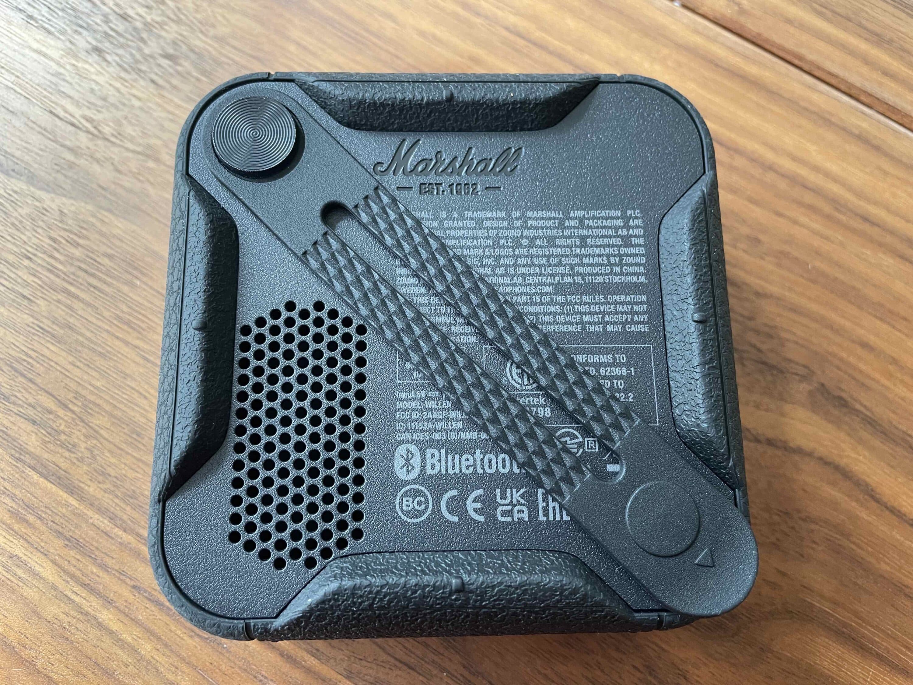 Aus Messing besteht auch der Multifunktionsknopf, der sich in der oberen rechten Ecke befindet. Links wiederum verbaut der Hersteller einen USB-C-Port, mit dem sich der Lautsprecher unter Zuhilfenahme des beiliegenden Ladekabels aufladen lässt. Ein echtes Highlight findet man auf der Rückseite des kleinen Lautsprechers vor. Hier spendiert man dem Willen nämlich einen praktischen Riemen. Dieser ermöglicht die flexible Befestigung des Marshall Willen an unterschiedlichen Oberflächen. Insbesondere ein Festmachen am Fahrradlenker ist hier denkbar.
