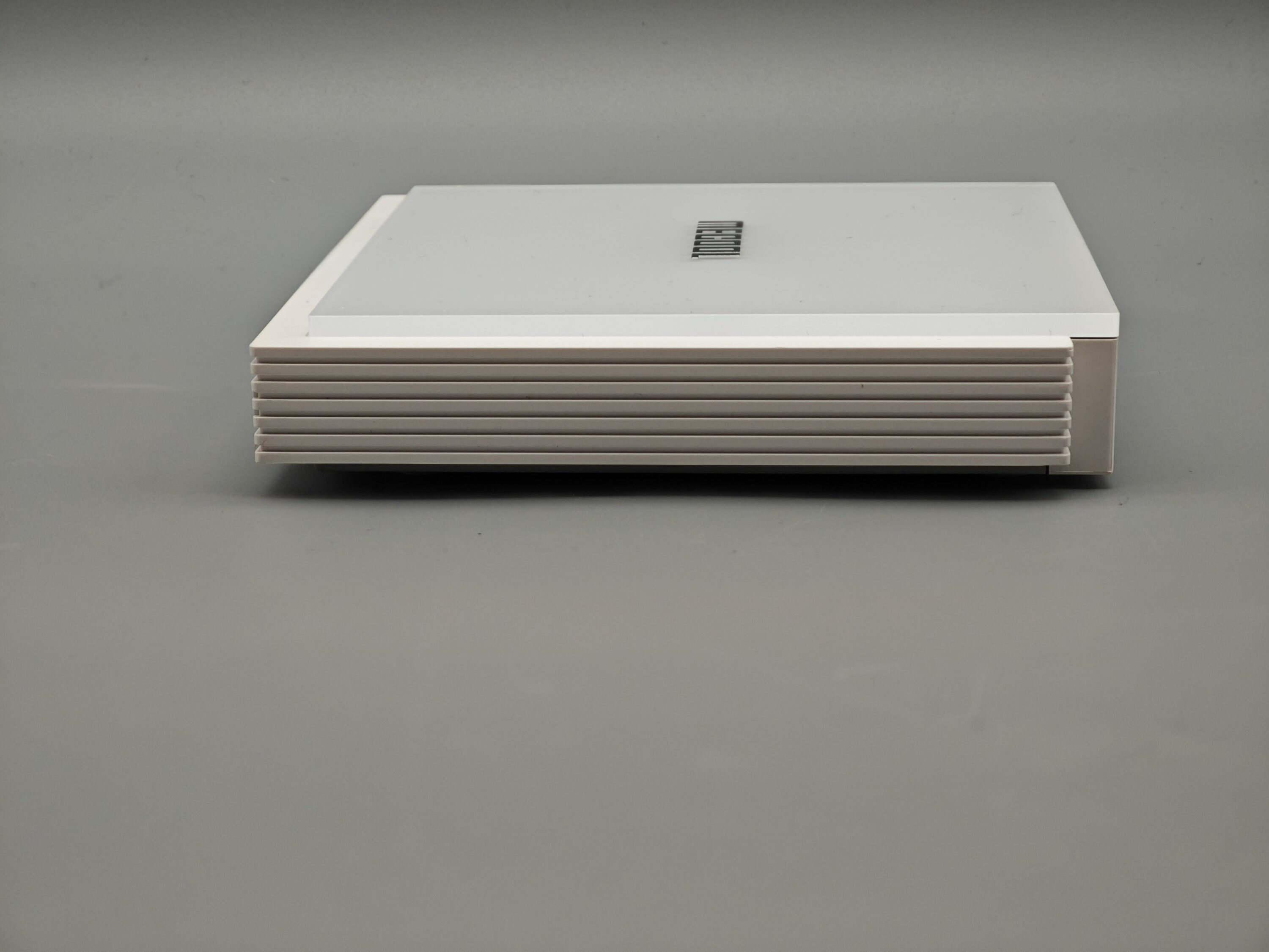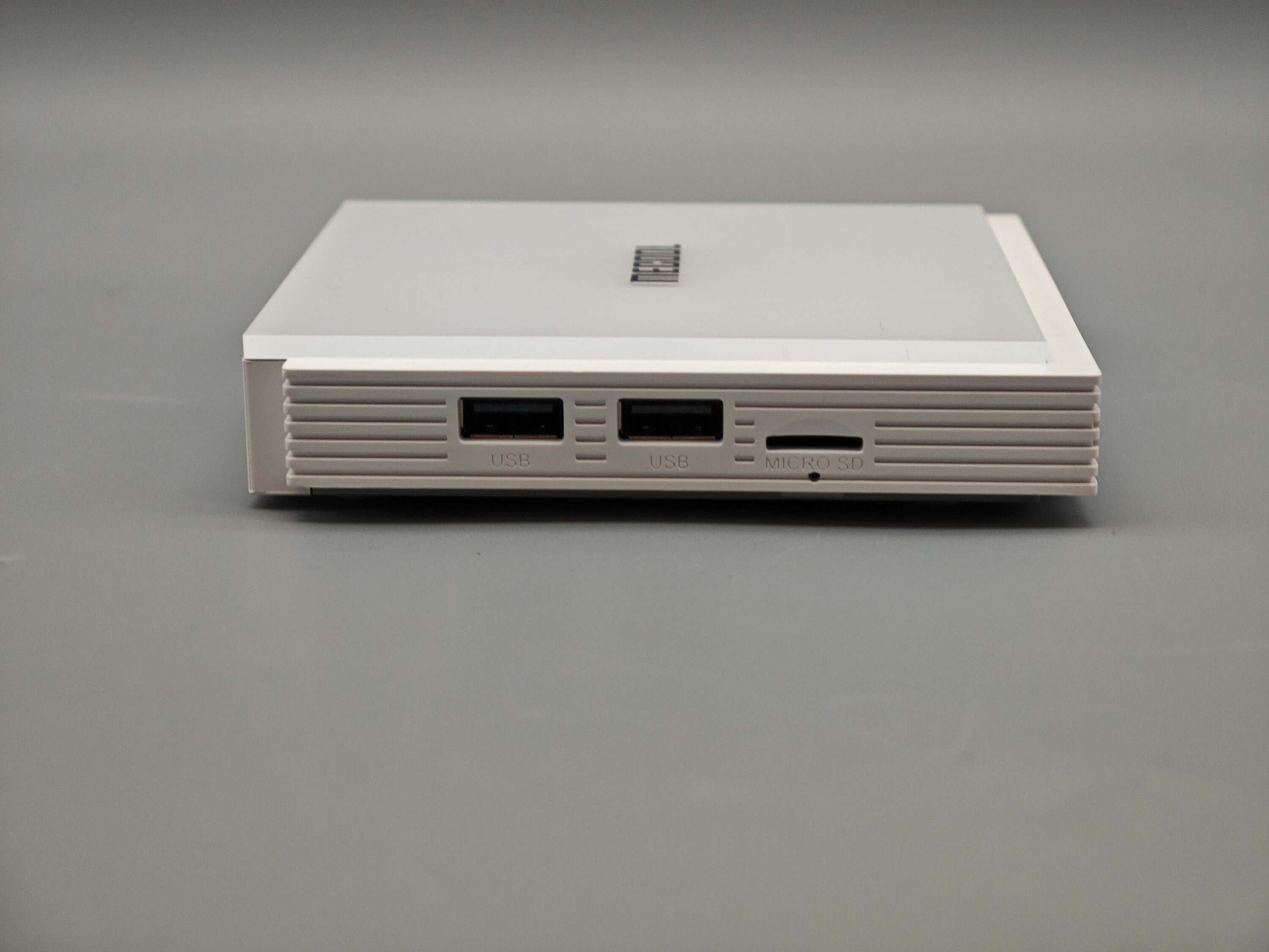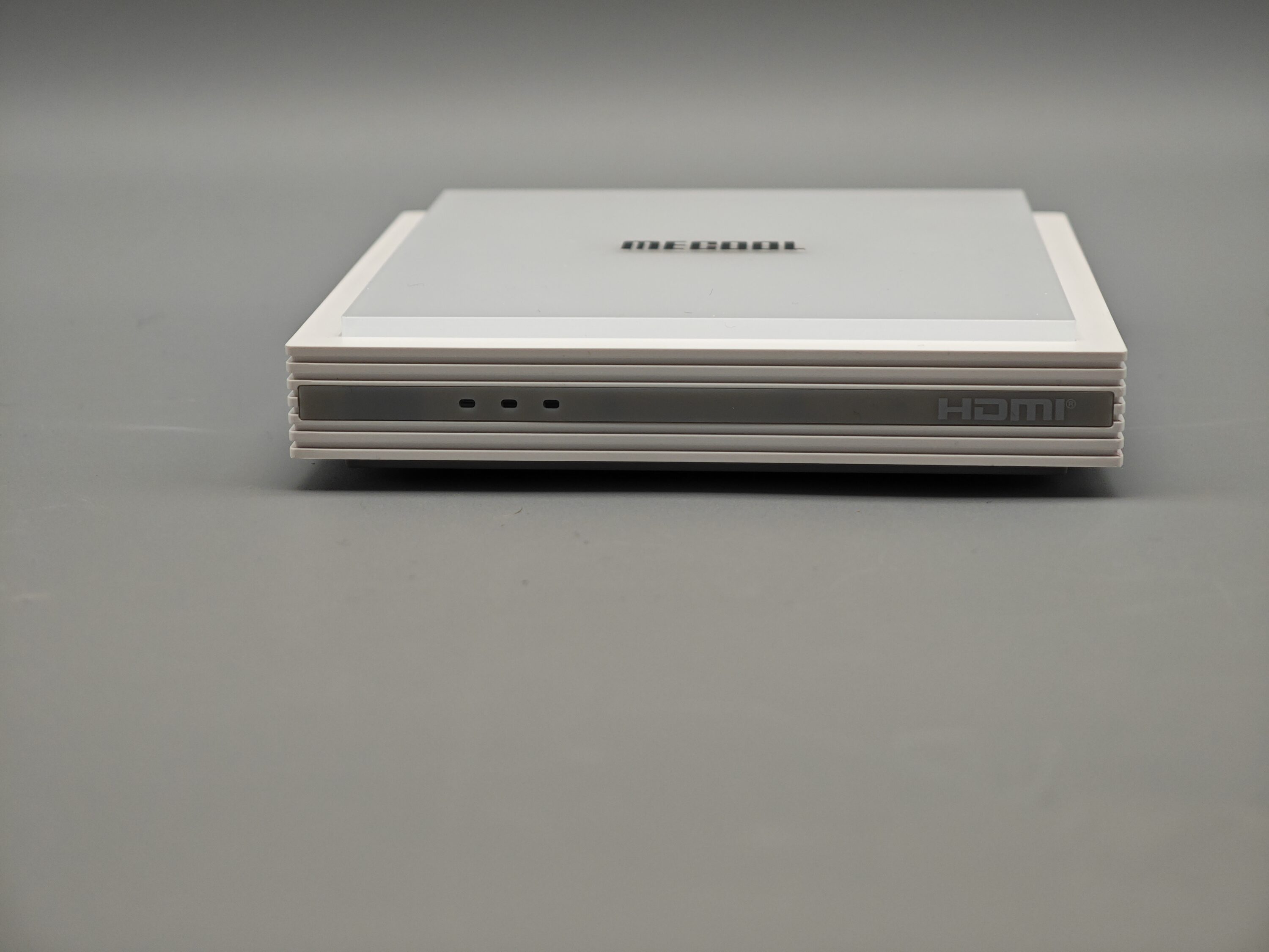 An der Oberseite, angesetzt, findet sich eine weiße Plexiglas-Abdeckung, die mit dem silbernen Herstellerlogo optisch ansprechend gestaltet ist. An der Front findet ihr neben drei Status-LEDs ein HDMI-Logo, während sich die Anschlüsse auf die linke Seite sowie die Rückseite des Gerätes verteilen.