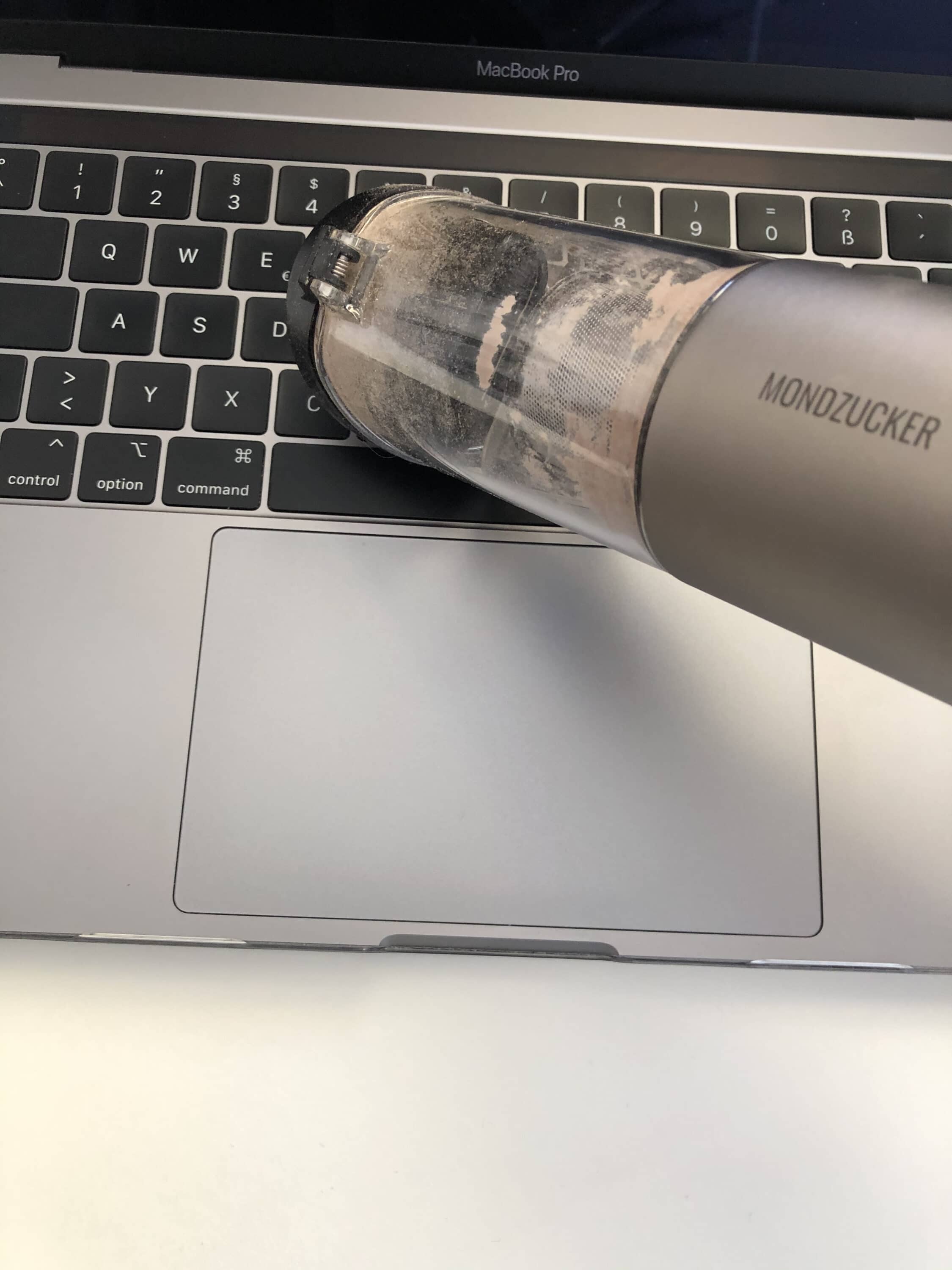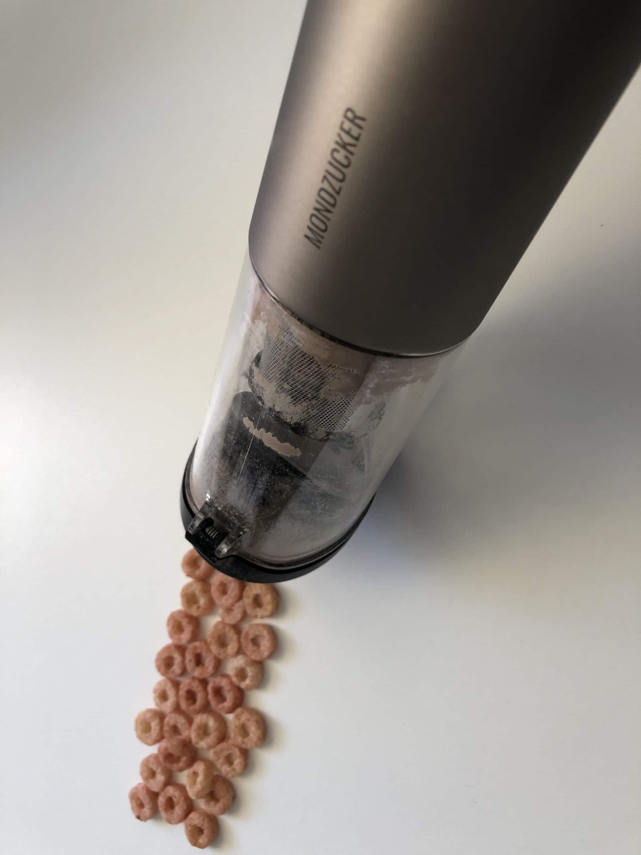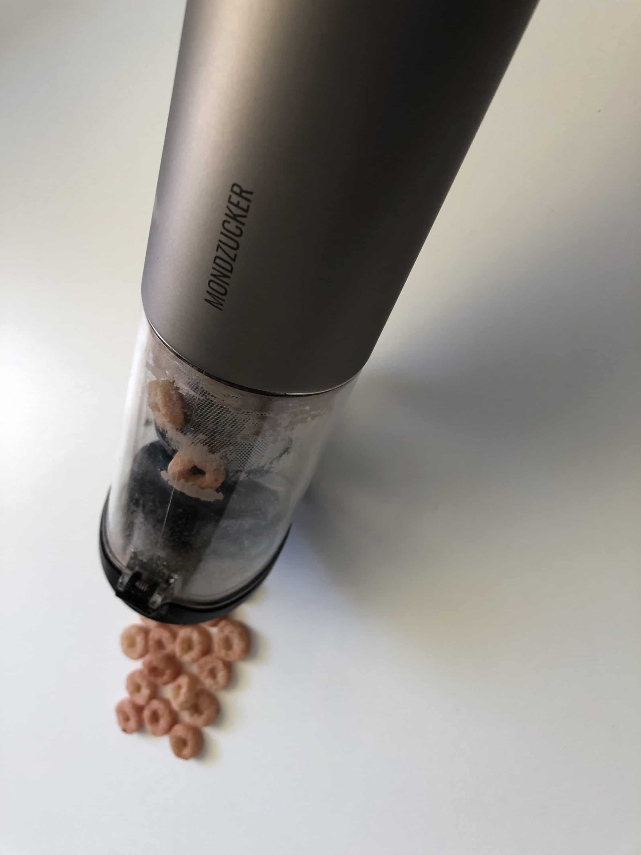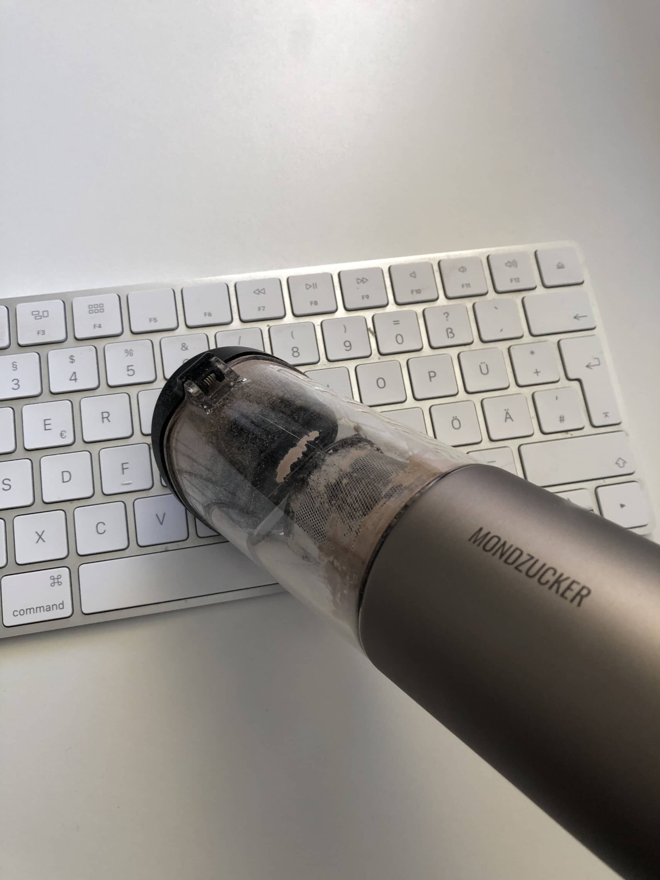 Aufgrund seiner kompakten Größe ist der Mondzucker VX nicht nur für die Lagerung im Hauswirtschaftsraum selbst geeignet. Stattdessen kann man ihn beispielsweise auch ganz bequem im Auto mit sich führen oder ihn sogar mit in den Urlaub nehmen. Doch besonders praktisch zeigt sich der Mini-Staubsauger auch im Wohnzimmerschrank oder dem Küchenschubfach. Schließlich hat man ihn dann stets griffbereit für den Ernstfall eines kleinen Missgeschicks. In meinem Praxistest habe ich nicht nur meine Tastaturen abgesaugt sondern auch einen Cornflakes-Unfall beseitigt. Beide Reinigungen ließen sich auf Stufe 1 problemlos bewerkstelligen.
