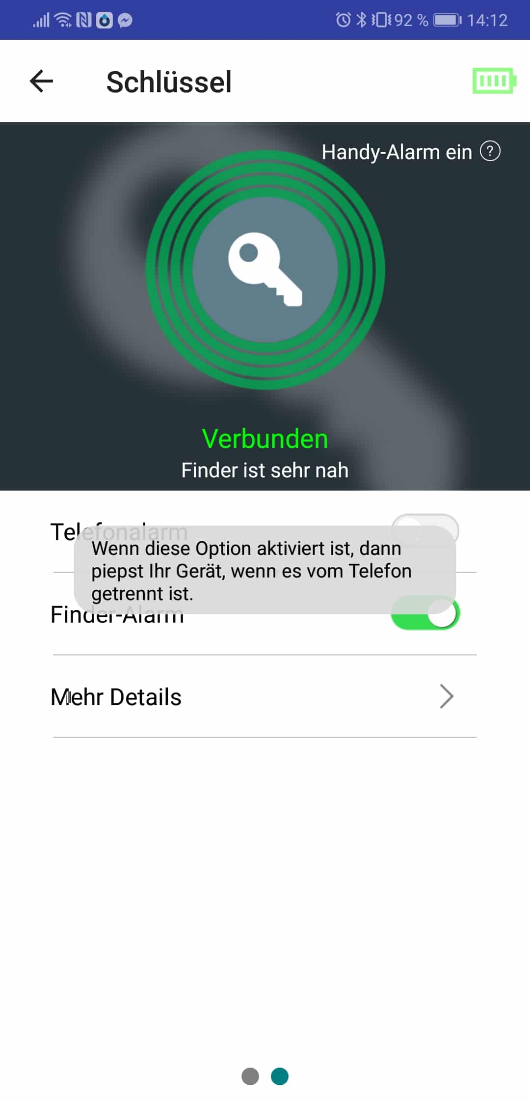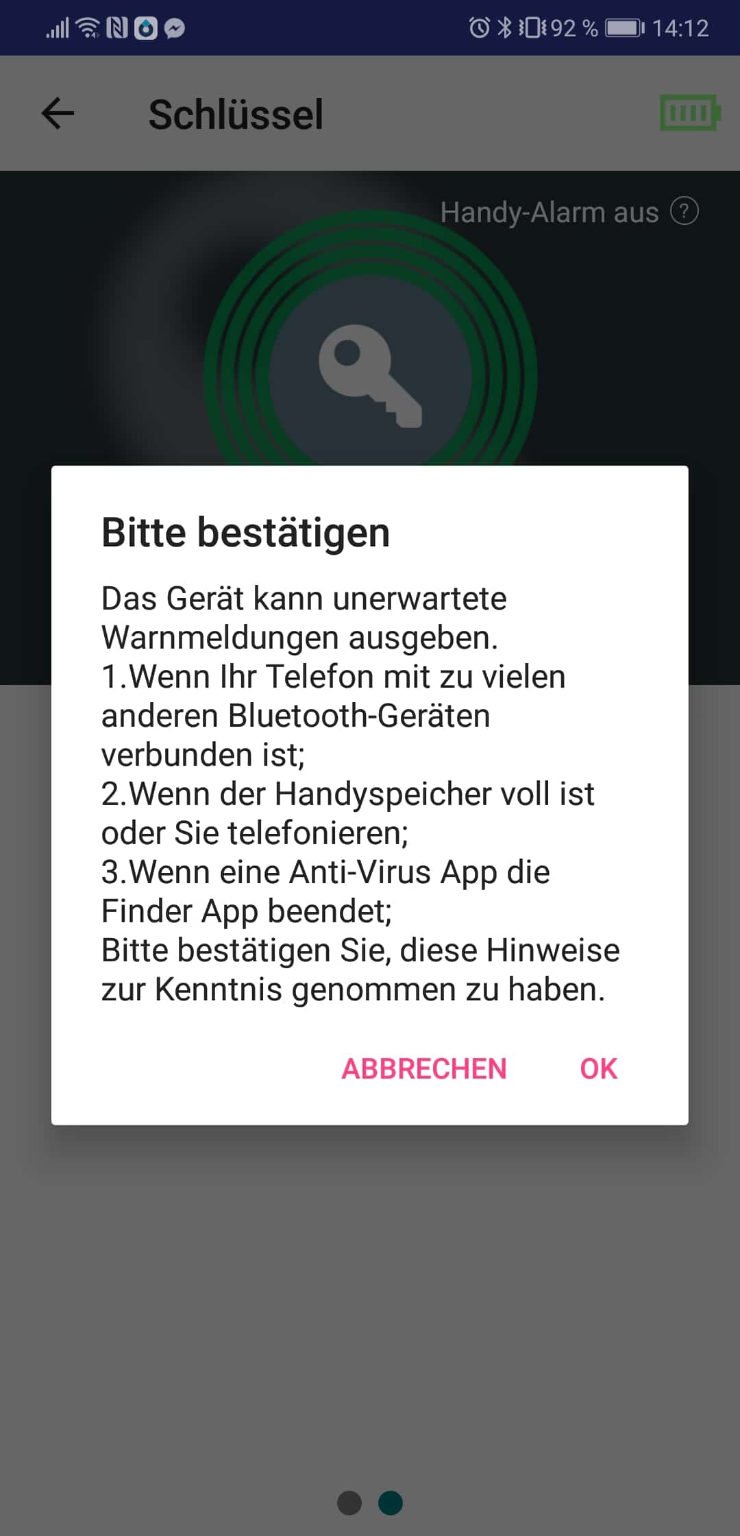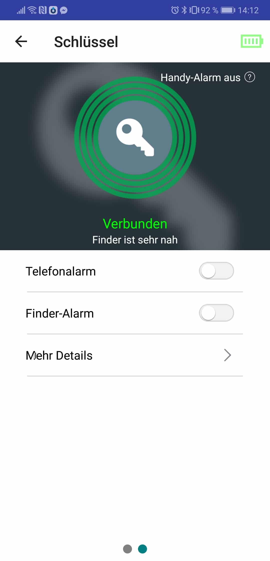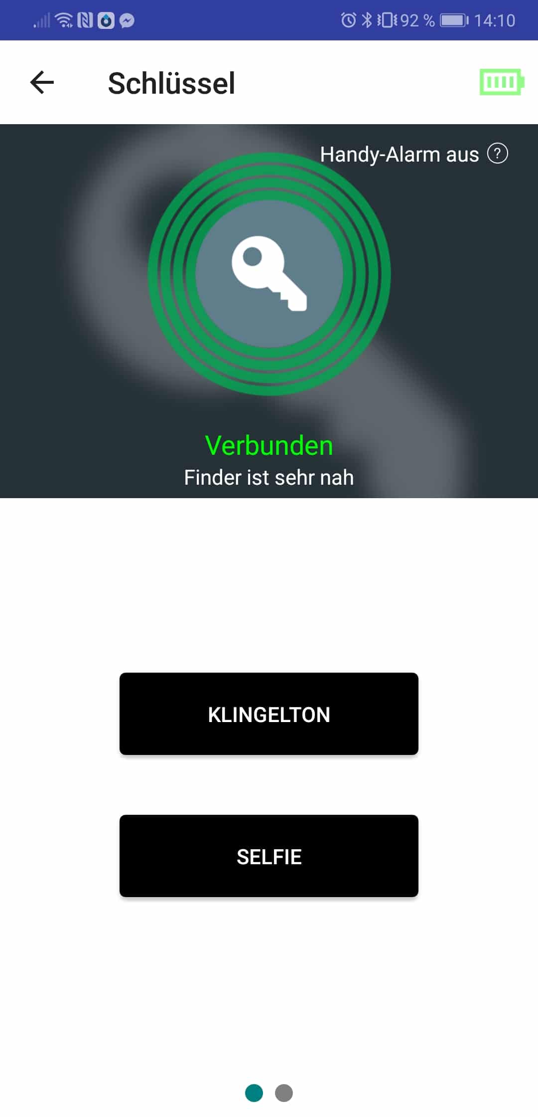 Solange eine Bluetooth-Verbindung mit dem Smartphone besteht, soll überdies ein Alarm ausgelöst werden können. Bei dieser Funktion handelt es sich überraschenderweise nicht um eine einseitige – über das Smartphone kann ein Alarm des Schlüsselfinders ausgelöst werden und umgekehrt kann über den Schlüsselfinder ein Alarm auf dem Smartphone ausgelöst werden. Letzteres soll auch funktionieren, wenn der Ton des Handys ausgeschaltet ist.