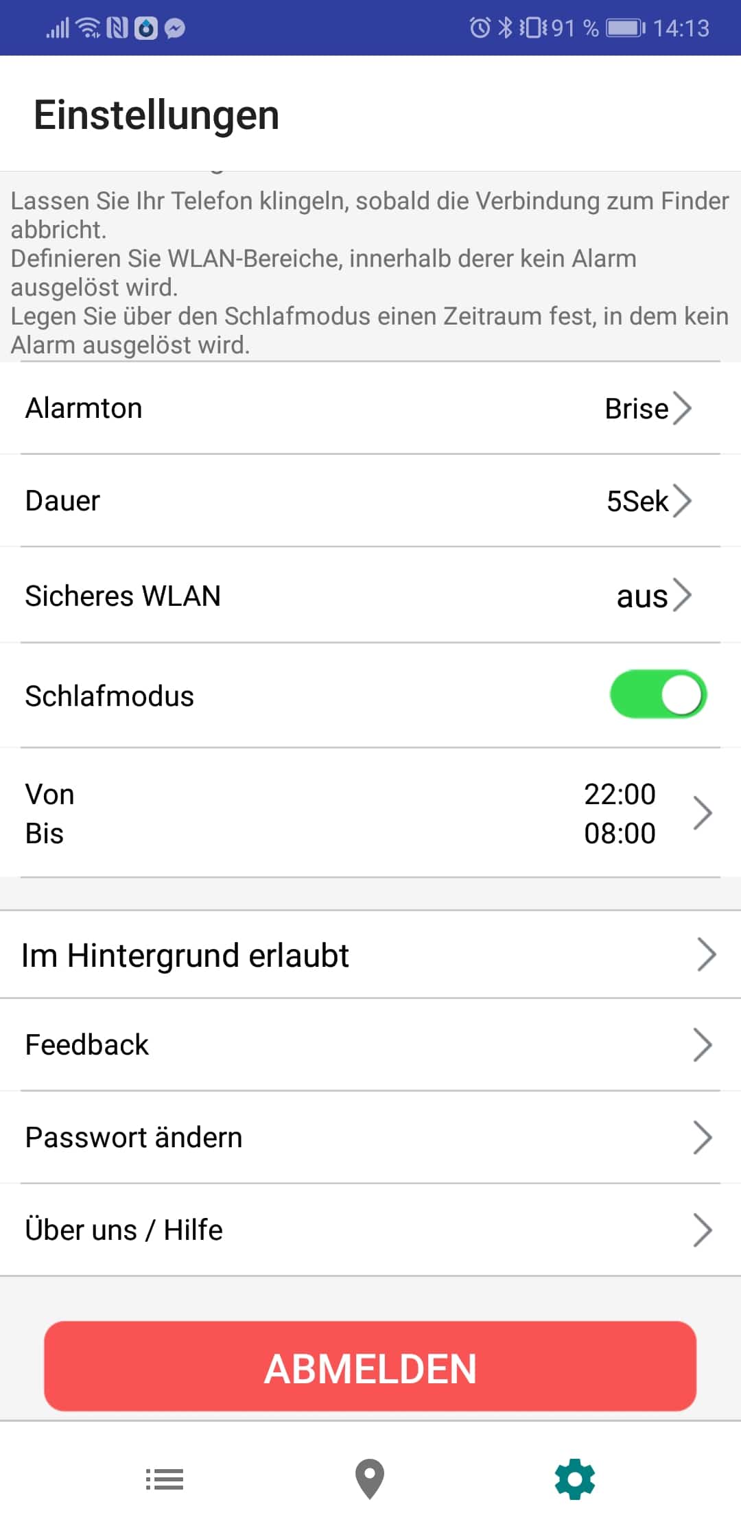 Darüber hinaus kann ein Alarm eingestellt werden, der beim Abreißen der Verbindung ausgelöst wird. Hier lassen sich anhand von WLAN-Netzwerken sichere Umgebungen definieren, in denen der Alarm in jedem Falle ausbleibt – was die Nerven des Nutzers angesichts der ansonsten wohl sehr häufigen Alarme in den eigenen vier Wänden schonen dürfte.