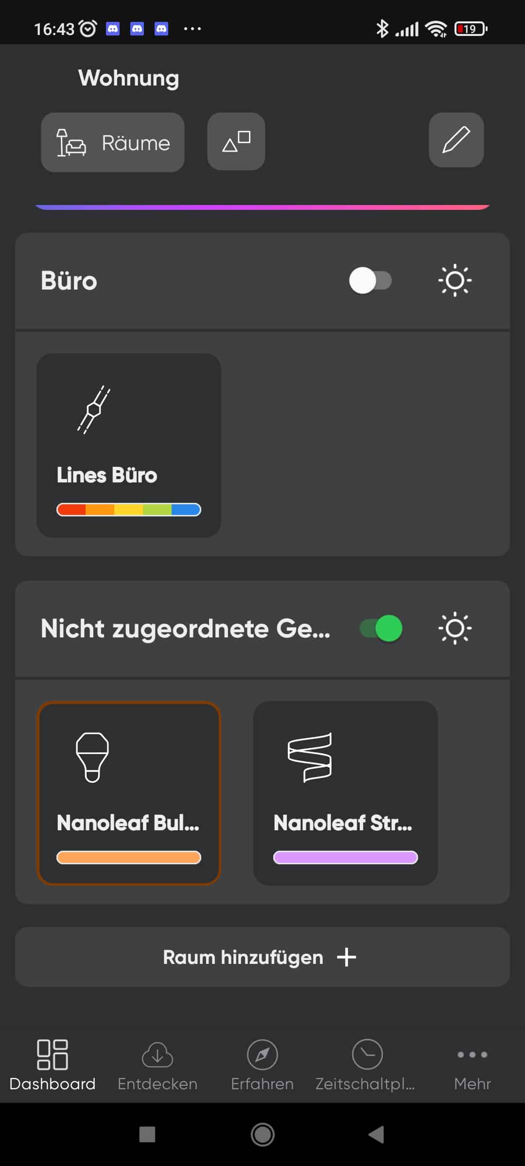 In der Nanoleaf-App könnt ihr die Geräte noch Räumen zu ordnen. So ist es einfacher, wenn ihr alle Geräte auf einmal an- beziehungsweise ausschalten wollt.