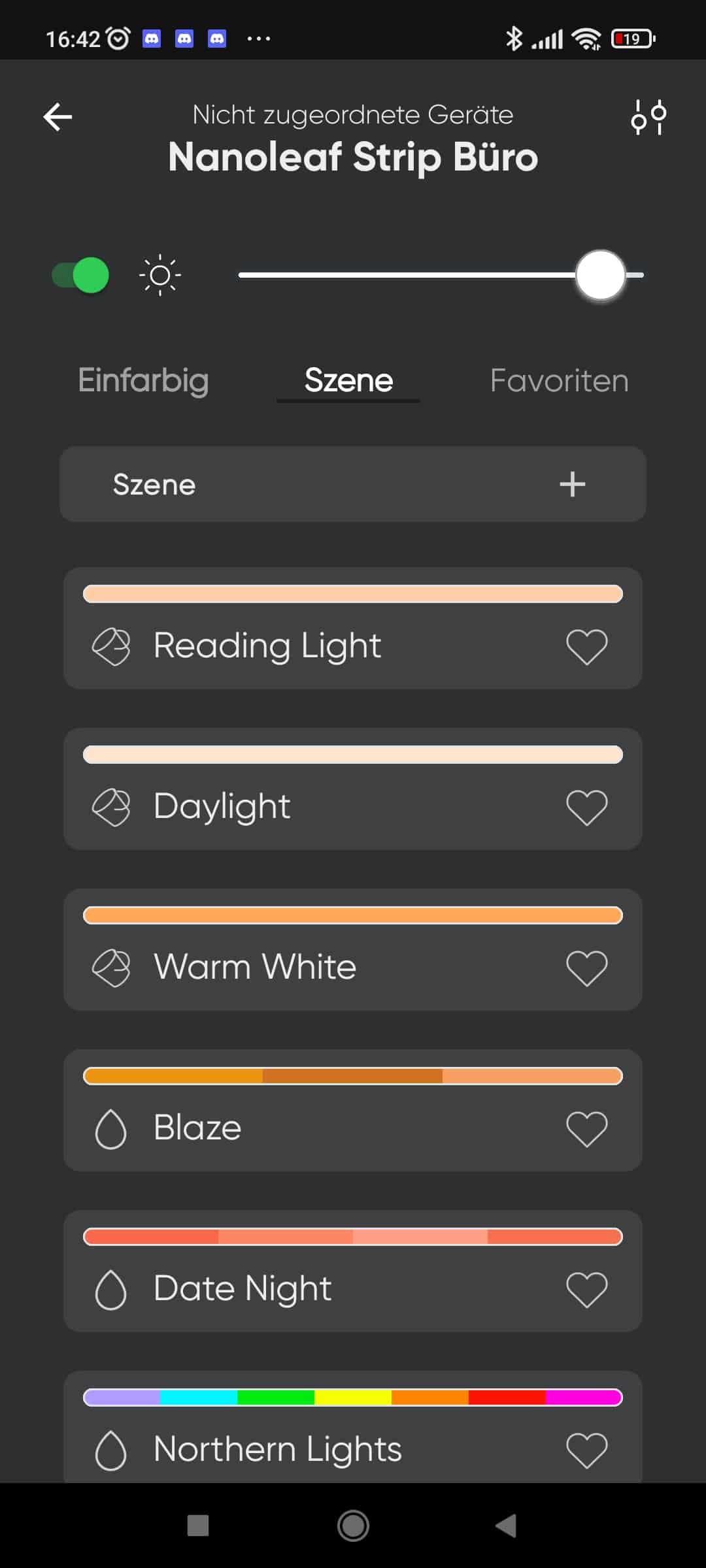 Im Dashboard sind alle Produkte zu sehen. Dort seht ihr auch die Aufteilung der verschiedenen Räume, um die Produkte gleichzeitig zu schalten. Nach einem kurzen Klick auf eines des Produkte, haben wir Zugriff auf viele vorgefertigte Szenen und Effekte.