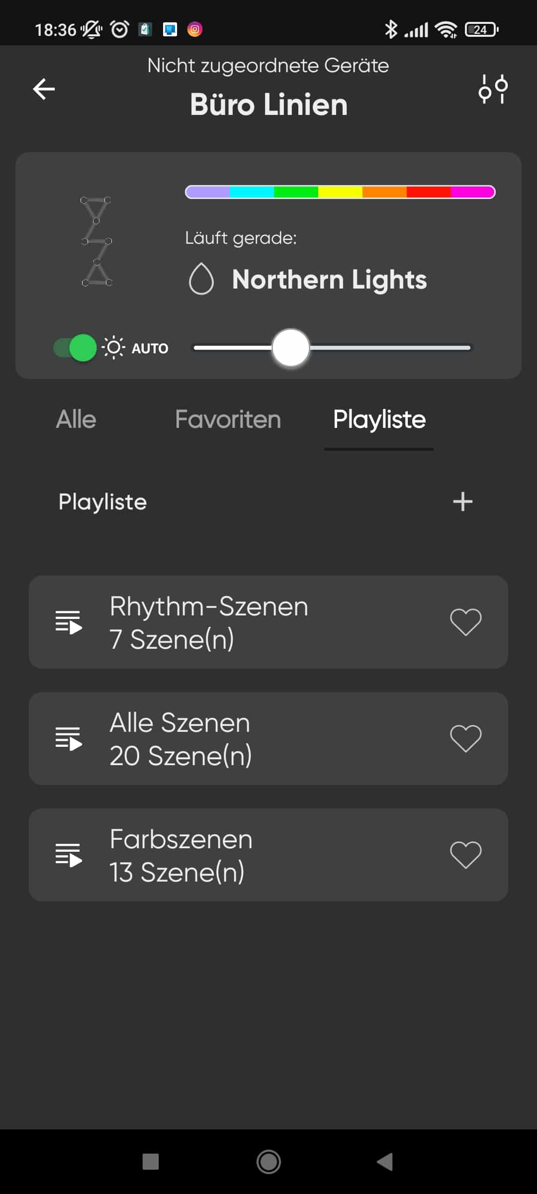 Am wichtigsten ist der Punkt „Dashboard“. Dort sehen wir alle Produkte von Nanoleaf, die wir in unserem Haushalt haben. Über das Dashboard können wir die Lines ein- und ausschalten. Außerdem können wir auf viele vorgefertigte Effekte und Szenen zurückgreifen. So können feste Farben oder auch Verläufe gewählt werden. Jede Linie kann nämlich zwei verschiedene Farben anzeigen.