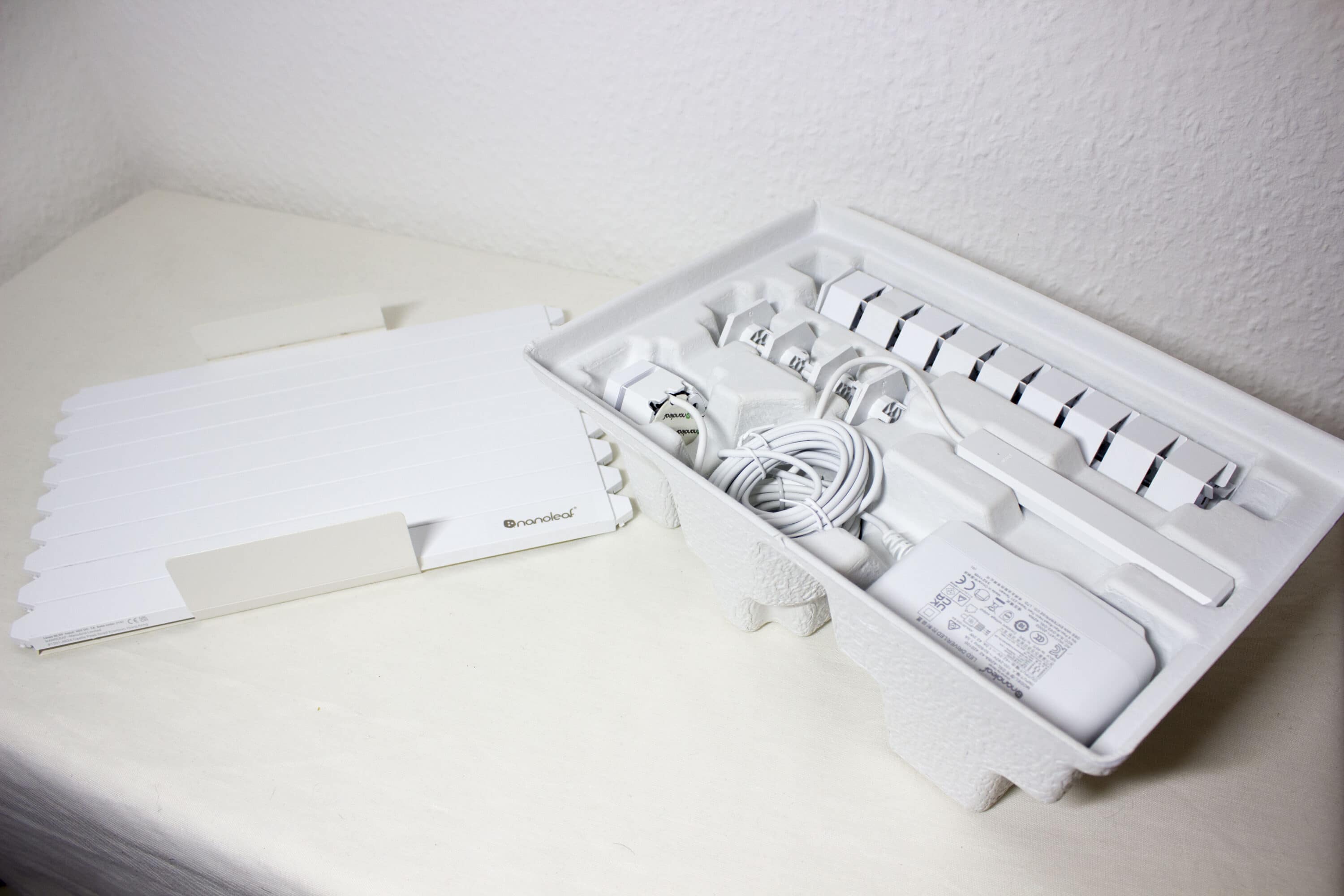 Alles im Karton ist sicher verpackt. Das ist auch wichtig, da die Linien nicht wirklich dick sind und sehr filigran werden. Wir finden neben den neun Linien allerhand Zusatzmaterial zur Montage sowie das Netzteil. Die neun Linien haben jeweils eine Länge von 27,85 cm und sind gerade einmal 0,8 cm hoch. Auch sind sie mit 2 cm nicht wirklich tief.