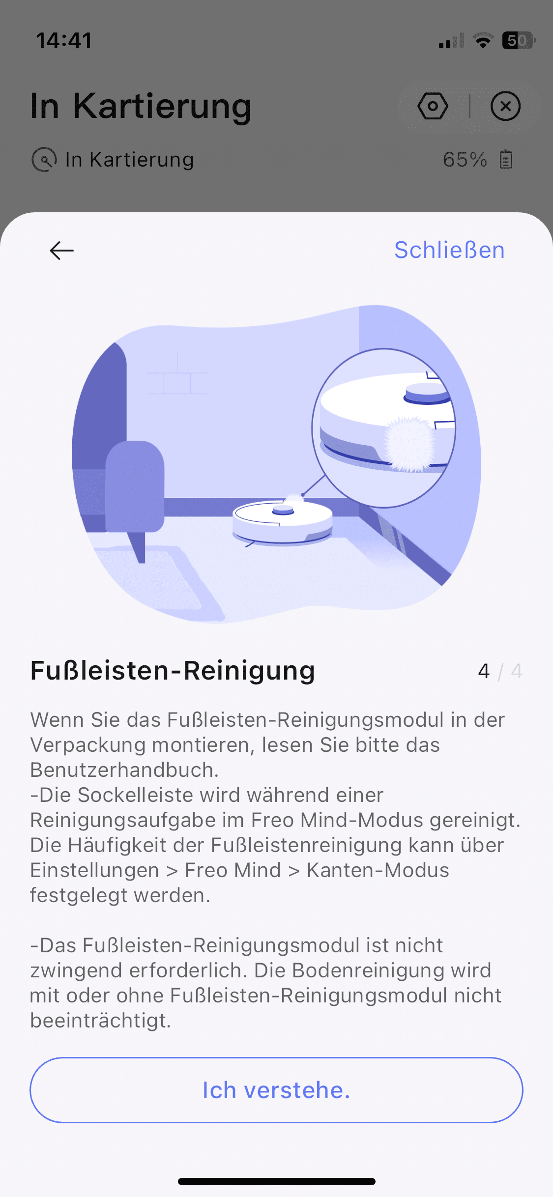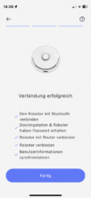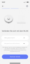 Sollte man zeitgleich saugen und wischen, kann der Roboter seine Wischpads 12 mm hoch anheben, um zumindest kurzfaserige Teppiche trocken zu halten. Die beiden rotierenden Wischmopps hinterließen auf meinen Hartböden ein hervorragendes Reinigungsergebnis. Für hartnäckige Verschmutzungen kommt Reinigungsmittel zum Einsatz, welches die All-in-One-Station beim Befeuchten der Mopps automatisch beigibt.