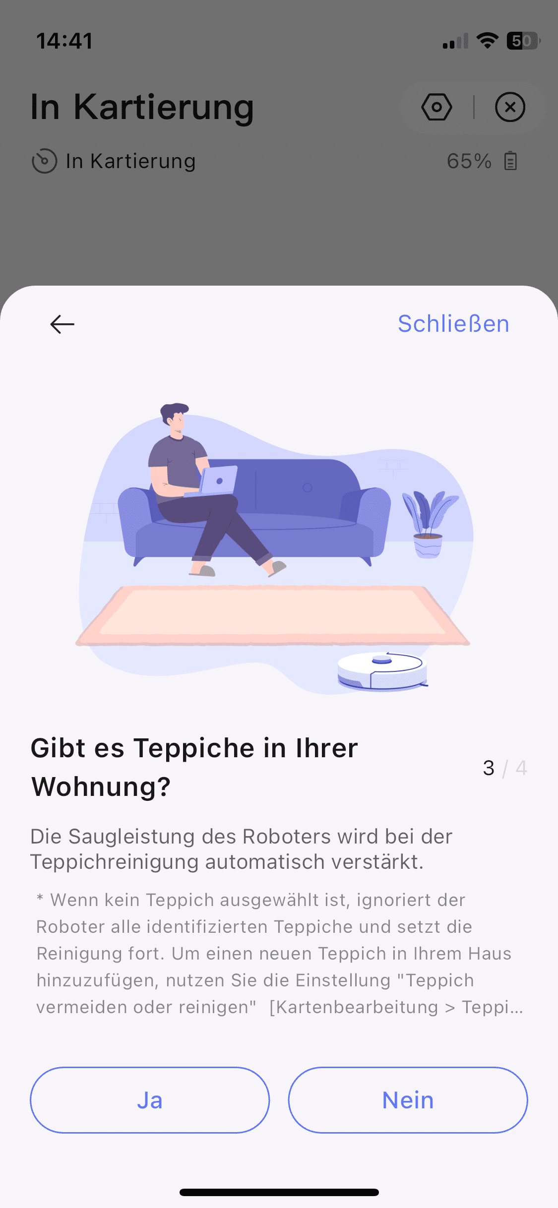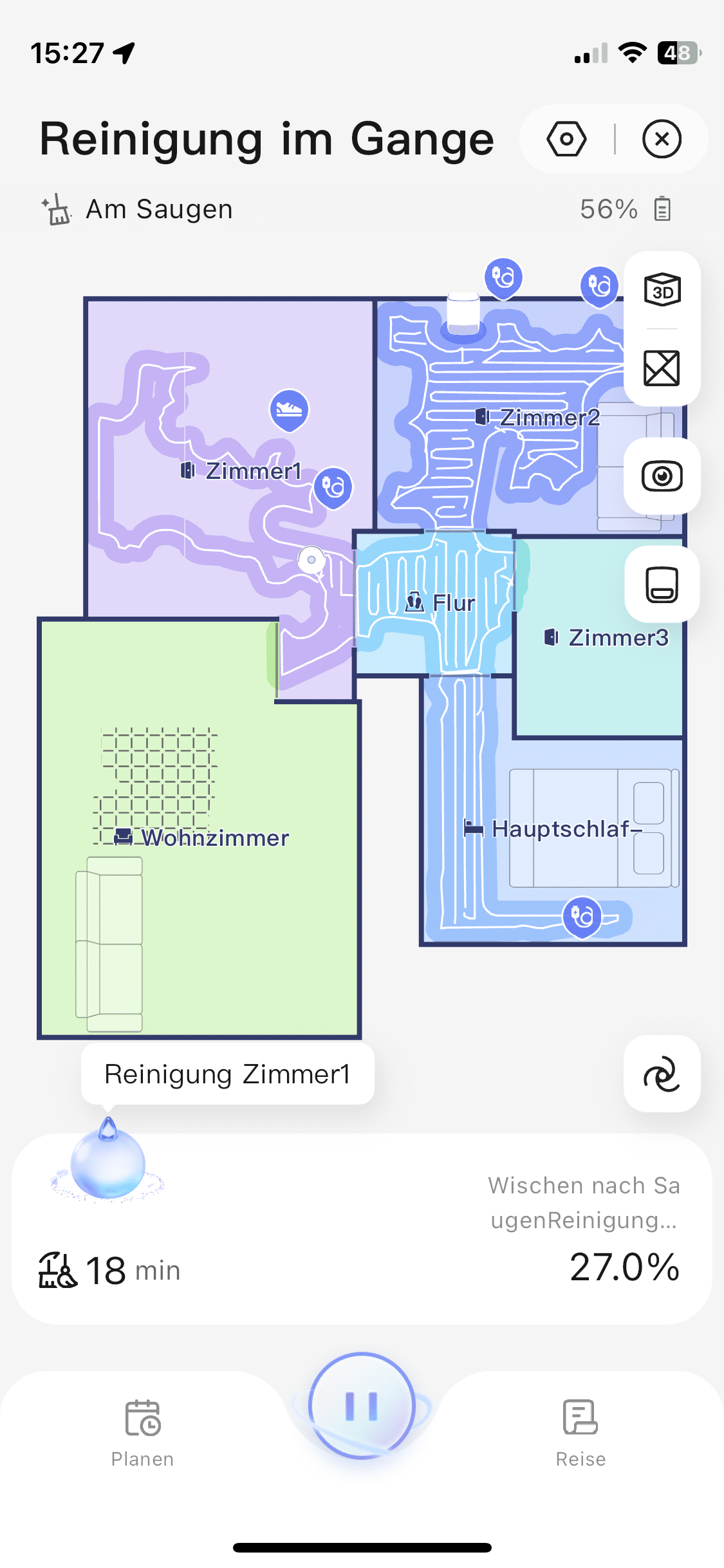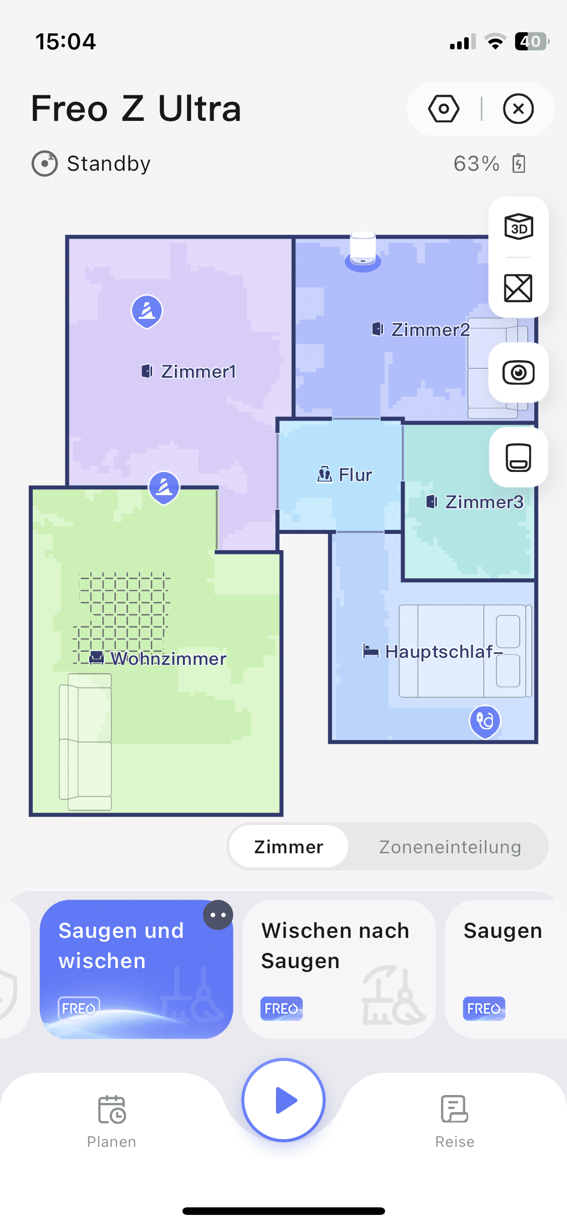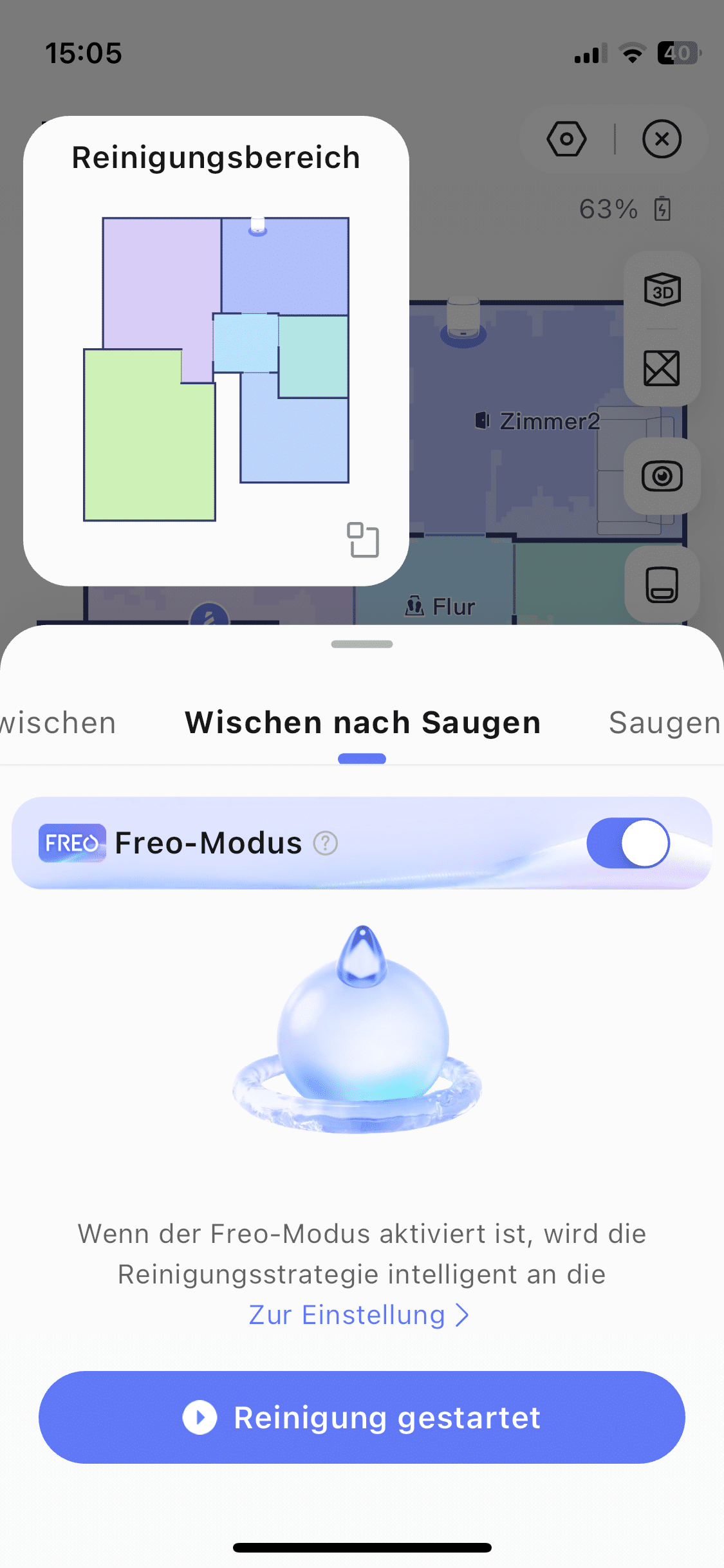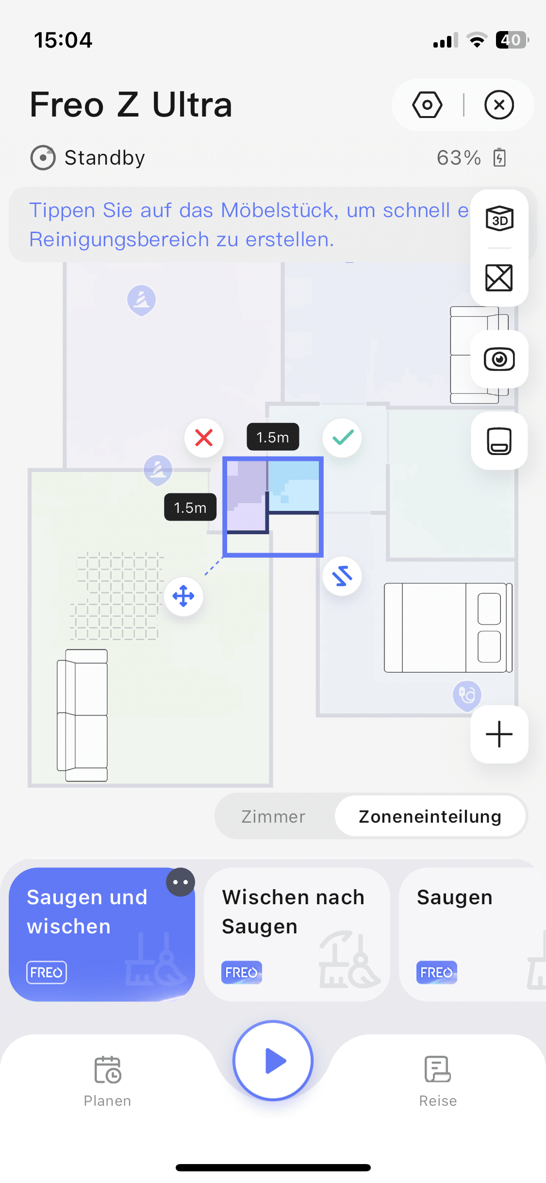Weiterhin lässt sich die Karte anpassen, ein Zeitplan für die Reinigung einstellen sowie die Art der Reinigung festlegen. So kann man entscheiden, ob zeitgleich gesaugt und gewischt werden, zuerst gesaugt und dann gewischt, ausschließlich gesaugt oder ausschließlich gewischt werden soll.