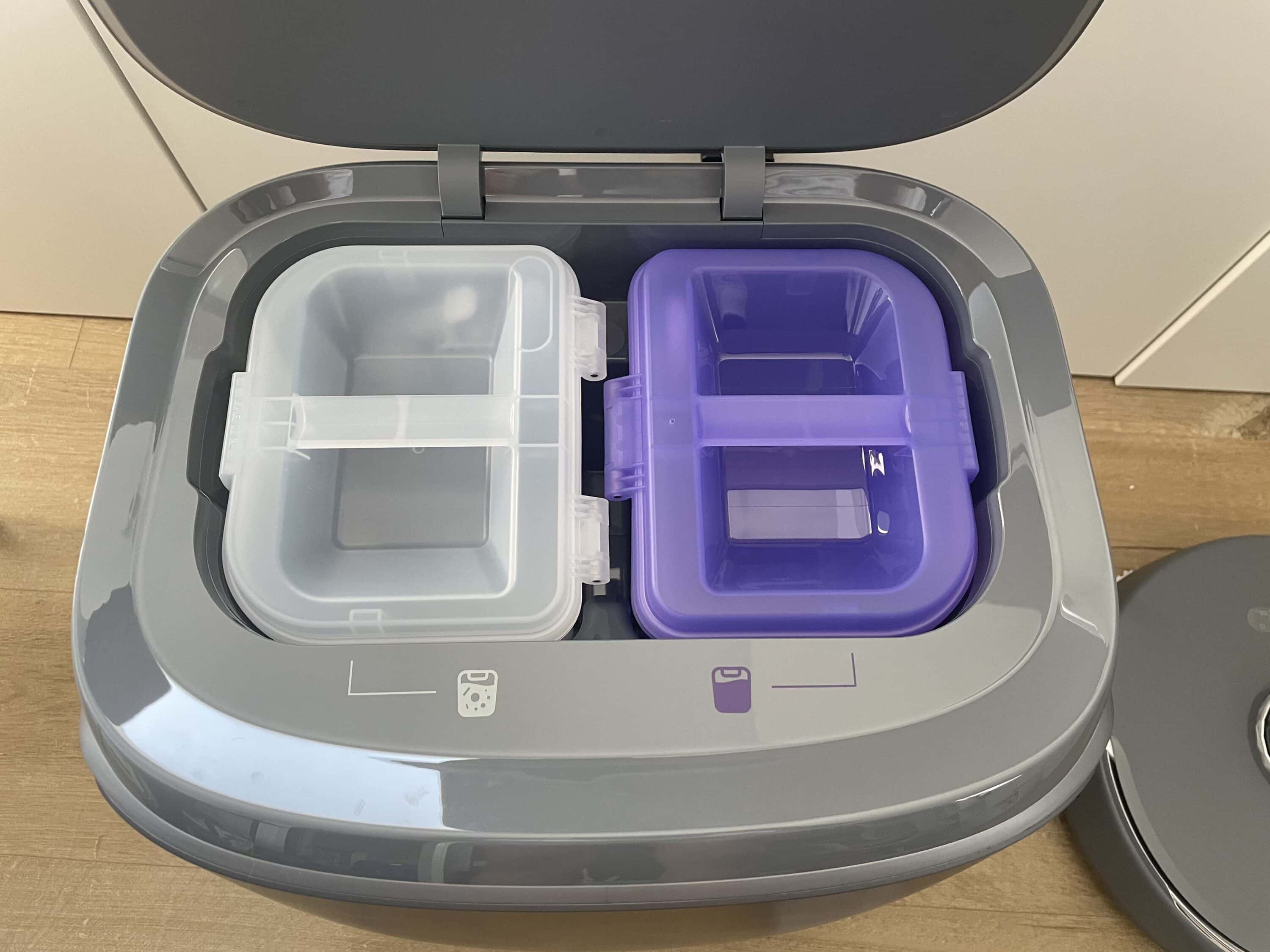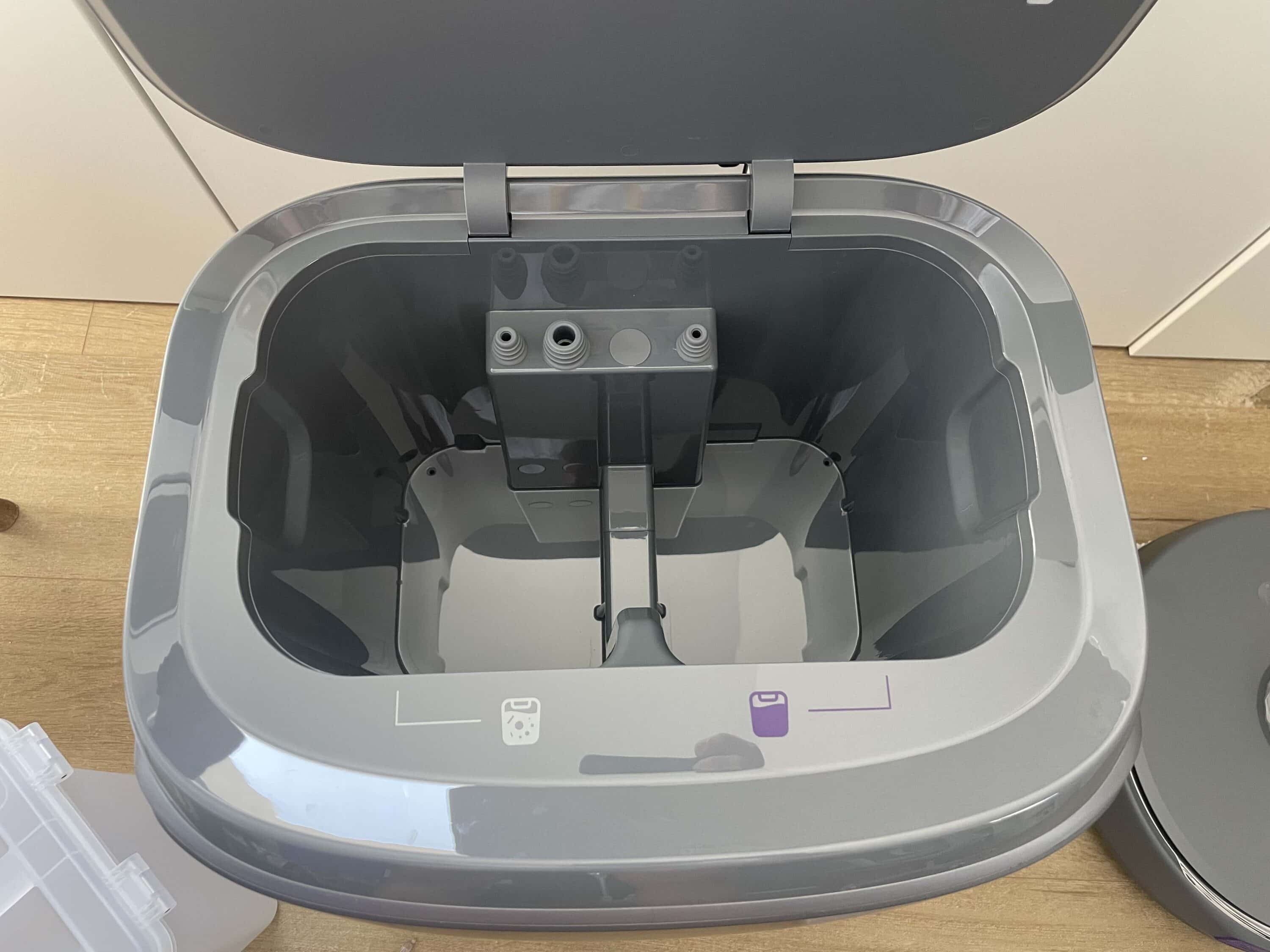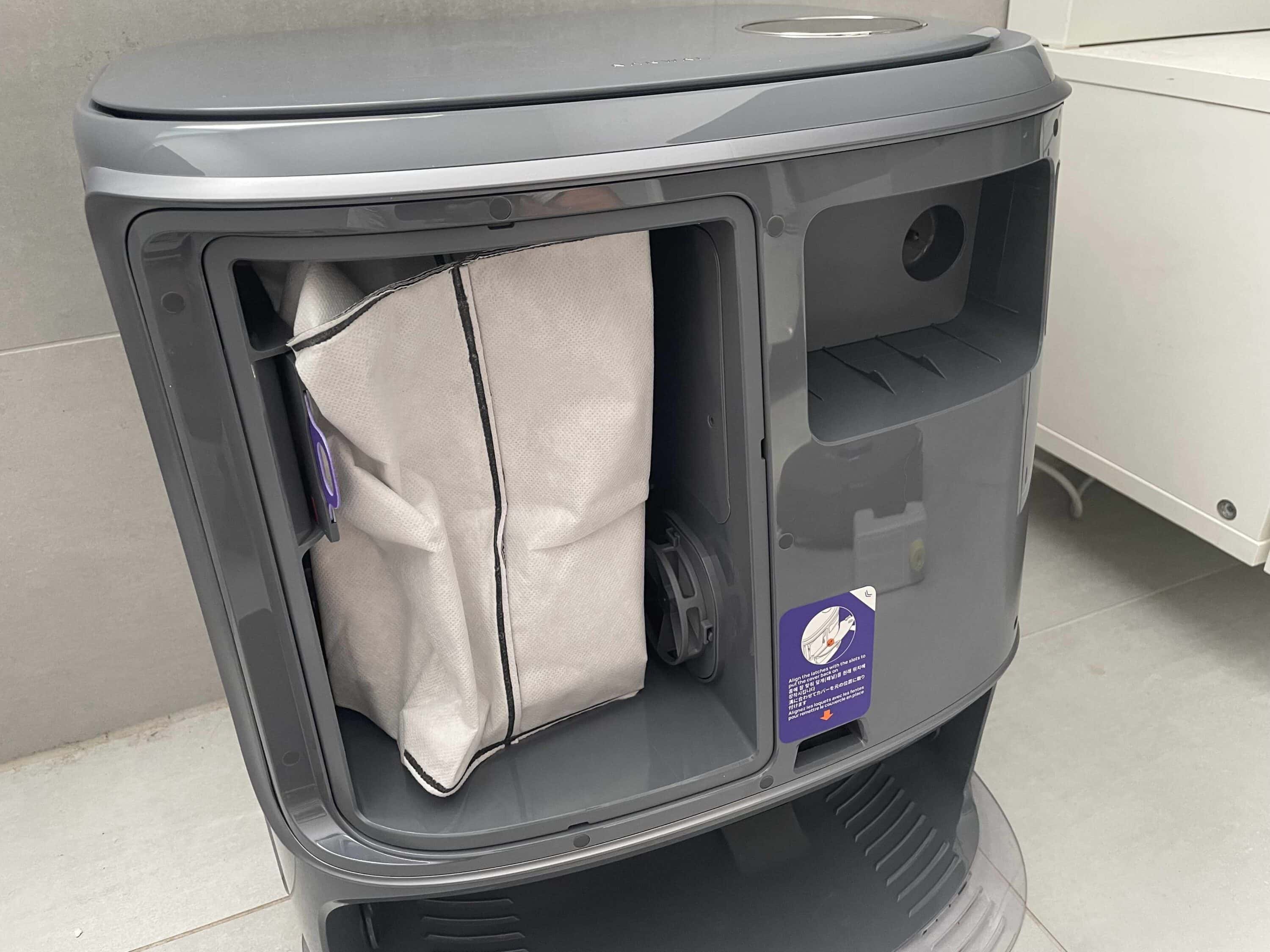 Unter dem Deckel auf der Oberseite befinden sich Schmutz- und Frischwasserbehälter mit einem Volumen von 4,5 Liter respektive 5 Liter. So weit so bekannt. Spannend wird es an der Vorderseite der Station. Unter einer Magnetabdeckung befindet sich hier der Einsatz für Staubbeutel.