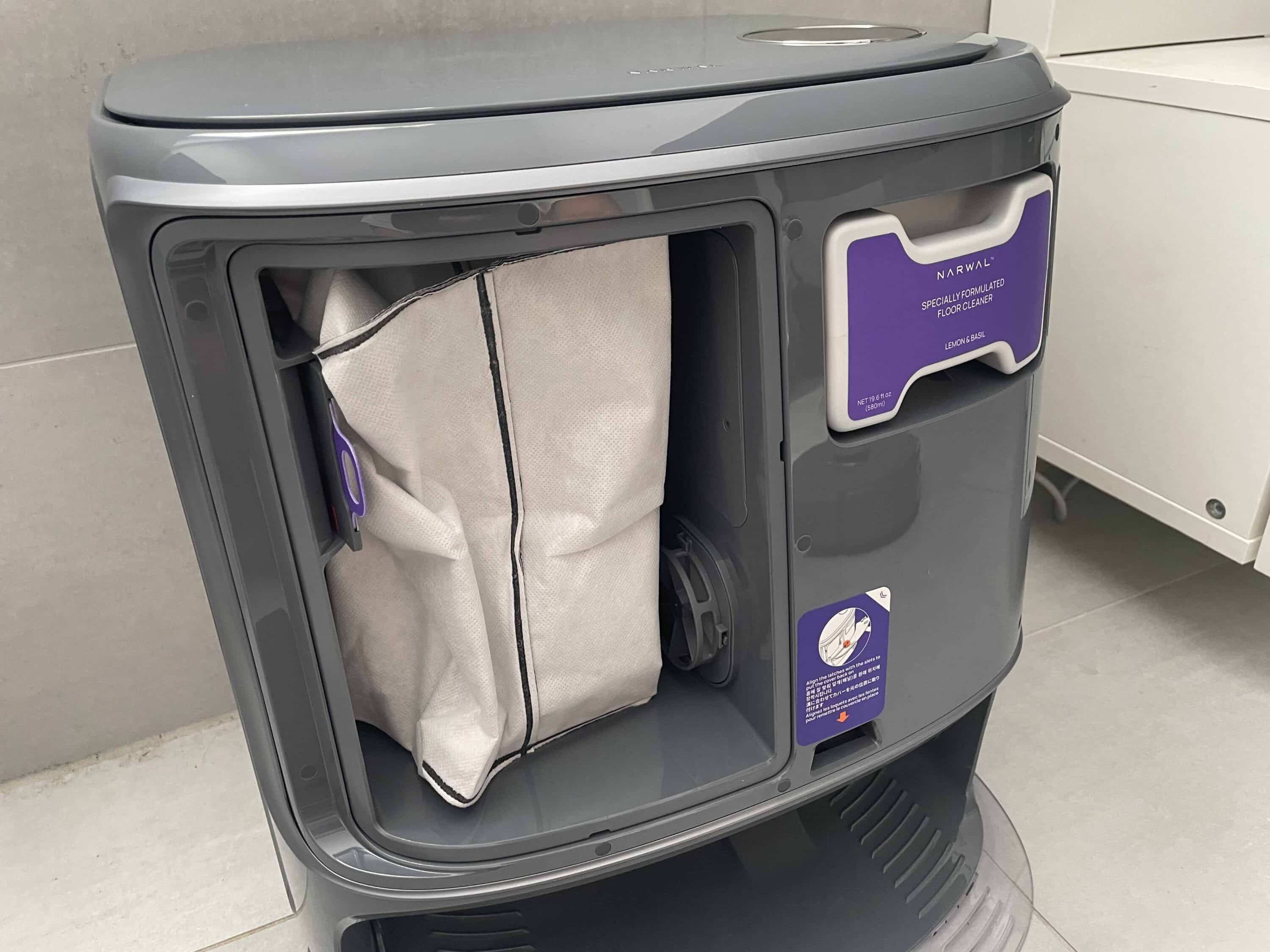 Zu guter Letzt steht die regelmäßige Entsorgung des Staubbeutels an. Auch hier macht es Narwal seinem Nutzer sehr einfach. Schließlich kommt hier ein 2,5 Liter großer Staubbeutel zum Einsatz, der dank Komprimierungstechnik bis zu 120 Tage durchhalten können soll. Das bedeutet, dass man mit nur zwei Beuteln nahezu ein komplettes Jahr überbrücken kann.