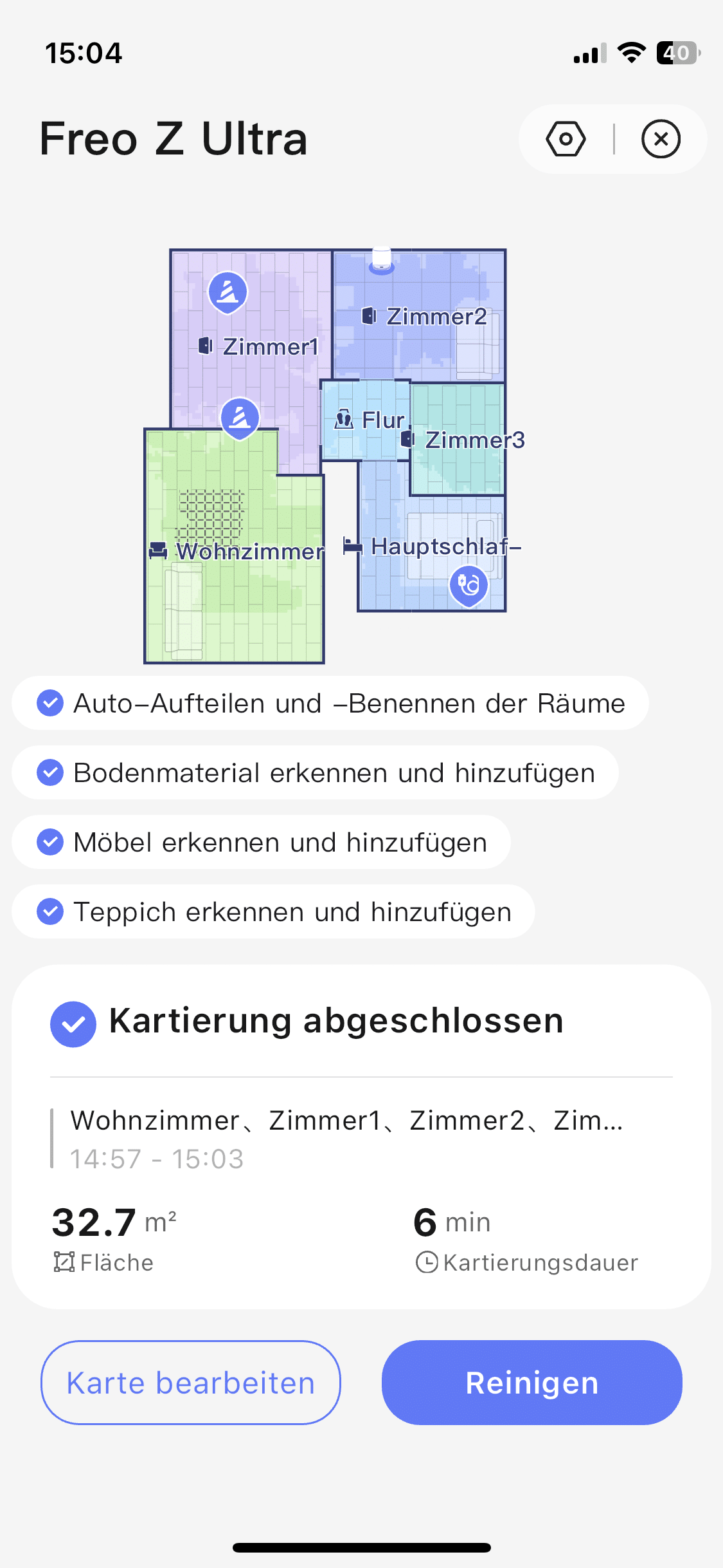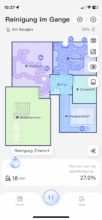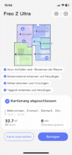 Ein wenigen Aufräumen und eine weitere Kartierungsfahrt später, war die Karte schon deutlich näher an der Realität. Allerdings wurde mein Treppenhaus hier kurzerhand als „Zimmer 3“ registriert. Wirklich störend ist das nicht, angesichts der KI-Kamera hatte ich hier aber ein wenig mehr erwartet. Mit der Detailgenauigkeit der Grundrisse von Branchengrößen wie Roborock oder Dreame kann das System von Narwal zwar nicht mithalten, doch aus meiner Sicht ist es völlig ausreichend.