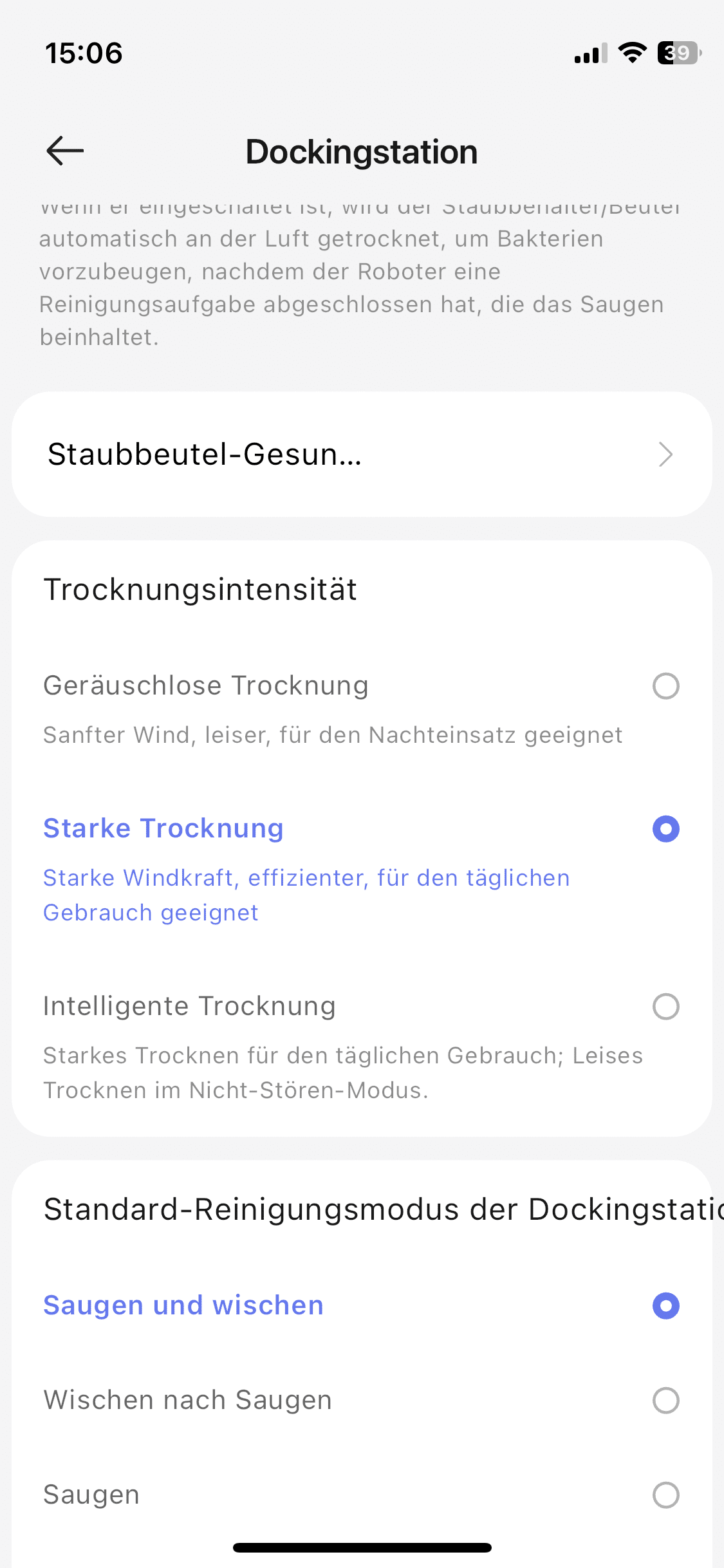 Weiterhin lassen sich hier viele verschiedene Einstellungen vornehmen. Diese betreffen nicht nur den Reinigungsvorgang selbst. Auch lassen sich Parameter der All-in-One-Station regulieren. Beispielsweise kann man festlegen, wie stark die Heißlufttrocknung sein soll.