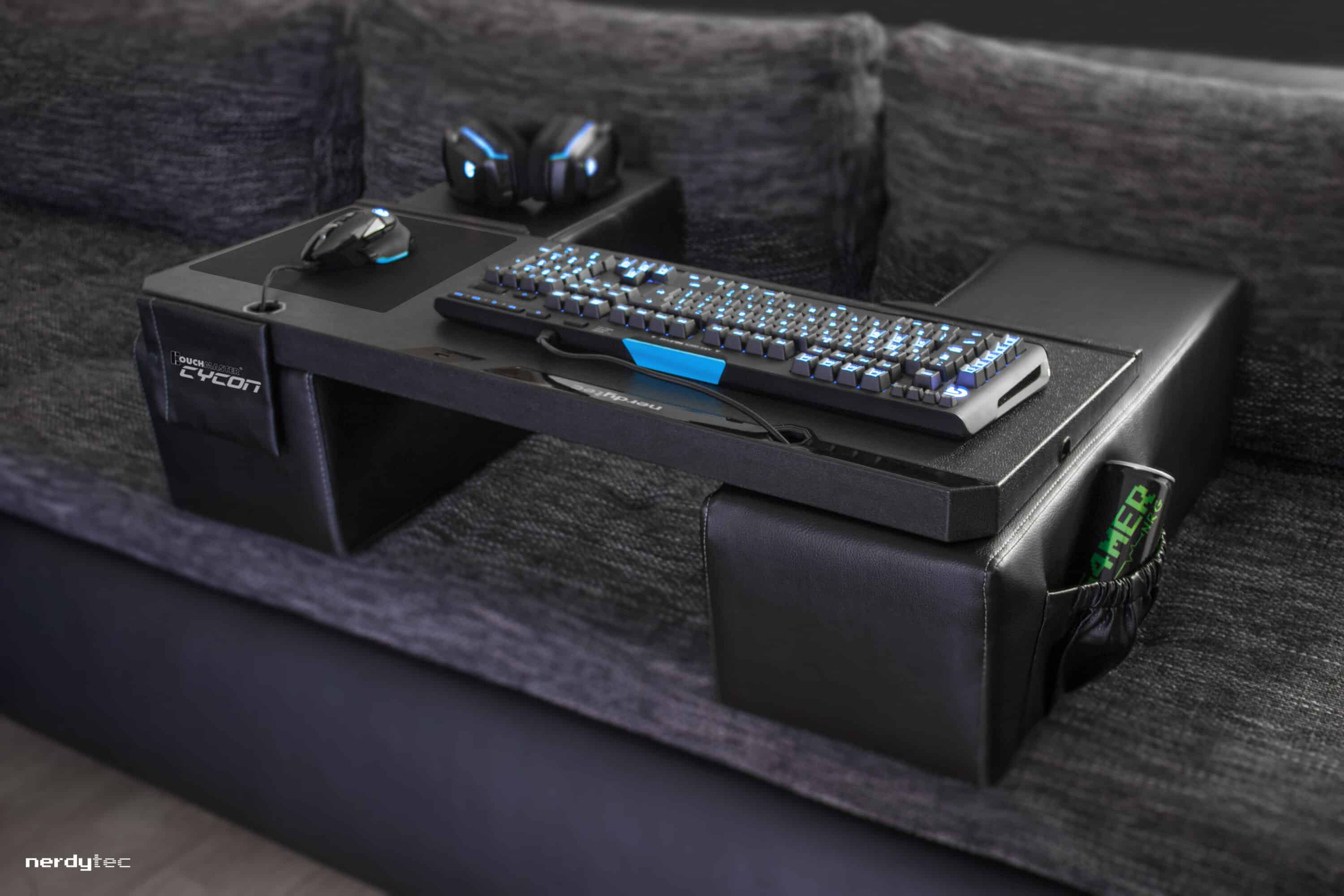 Trotz seiner ordentlichen Größe lässt sich das gute Stück nach dem Zocken platzsparend wieder verstauen. Reicht euch die großzügige Fläche des Couchmaster Cycon nicht aus, bietet euch nerdytec allerlei nützliche Halterungen für weiteres Equipment, wie etwa euer Smartphone.