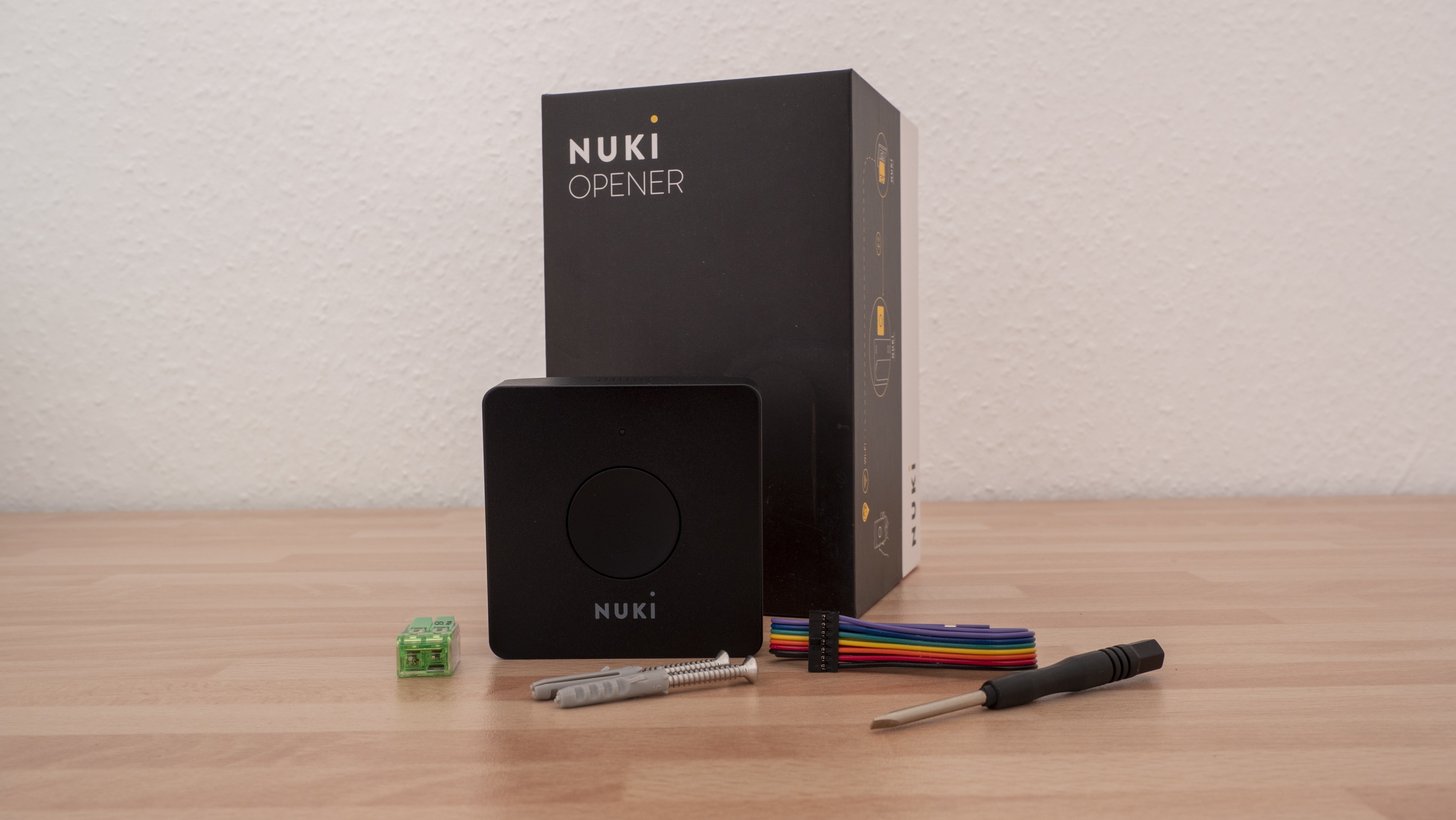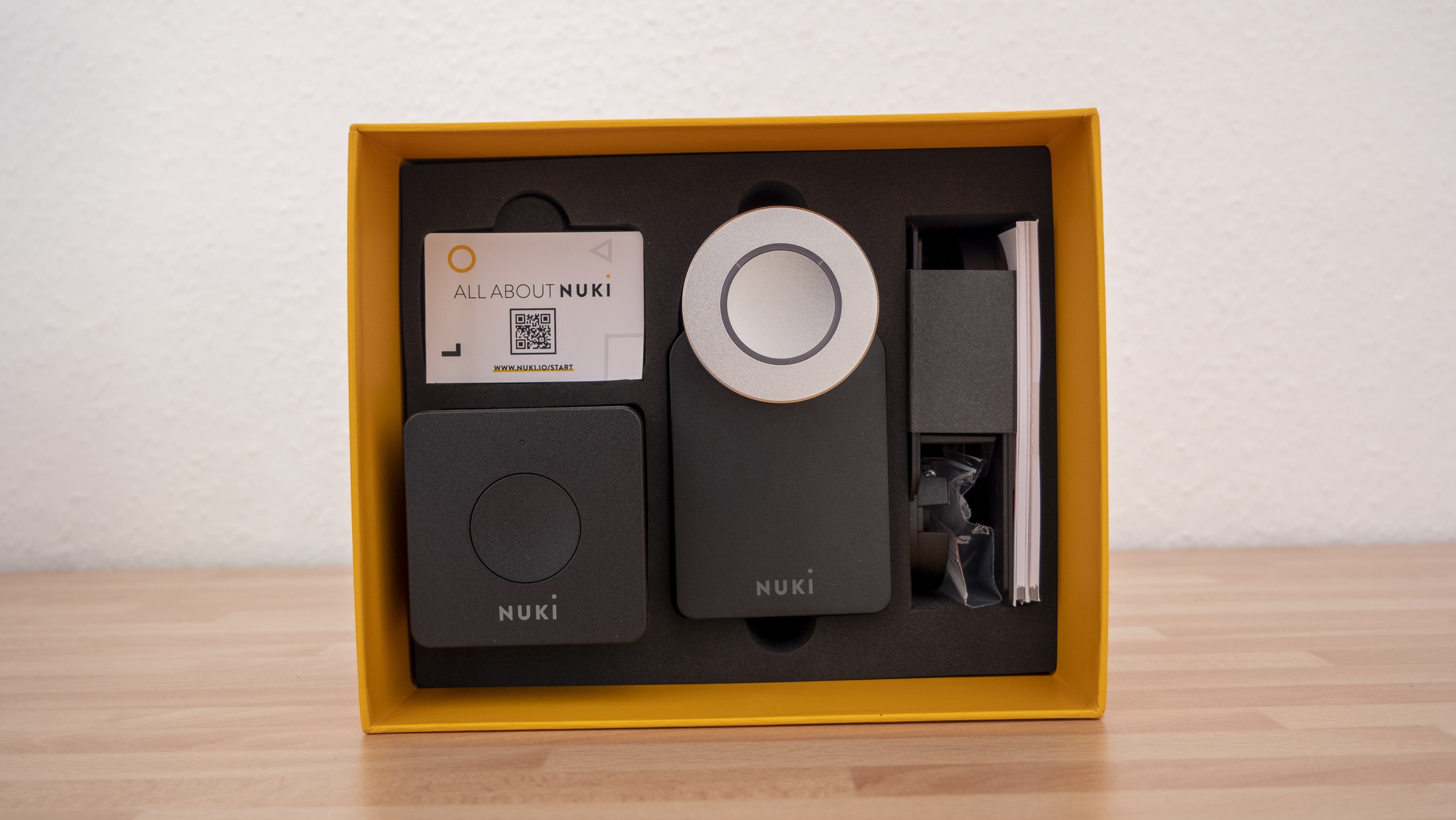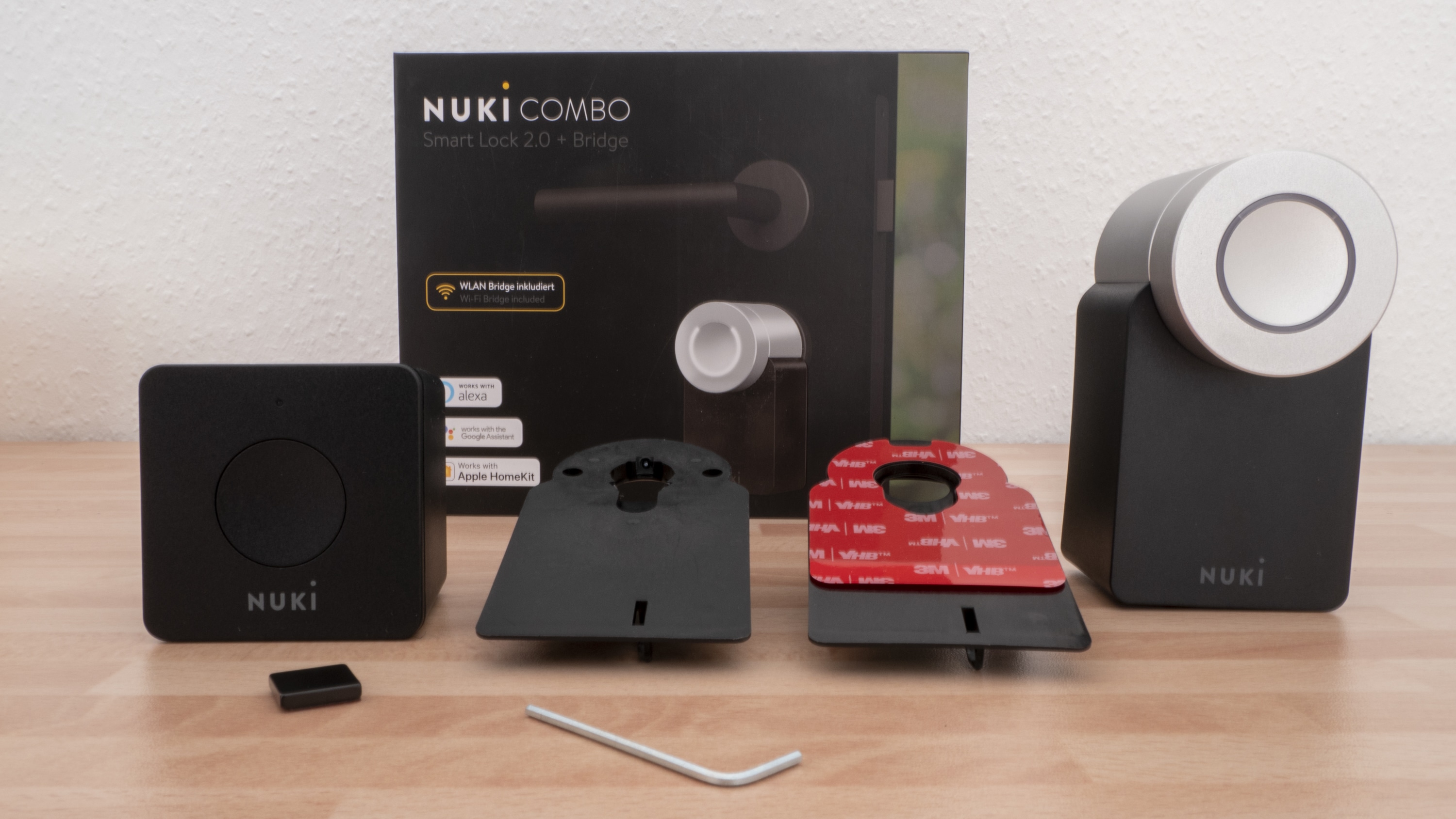 Im Lieferumfang sind – wie bereits erwähnt – drei Produkte enthalten: Neben dem Smart Lock, bestehend aus Türschloss und Bridge, ist ein Haustüröffner vorhanden. Da die Montage dieses Öffners ein wenig komplexer ist als die des Türschlosses, ist das enthaltene Zusatzmaterial umfangreicher als bei den nur für die Wohnungstür gedachten Nuki-Produkten: Zusätzlich zu den Produkten und passenden Batterien findet sich auch ein Schraubenschlüssel.