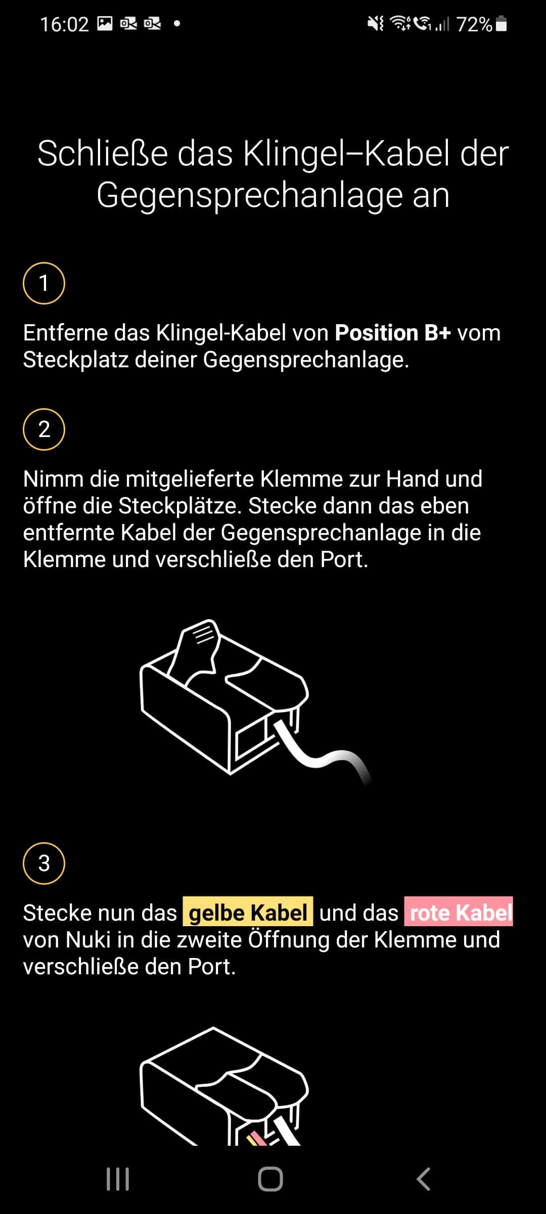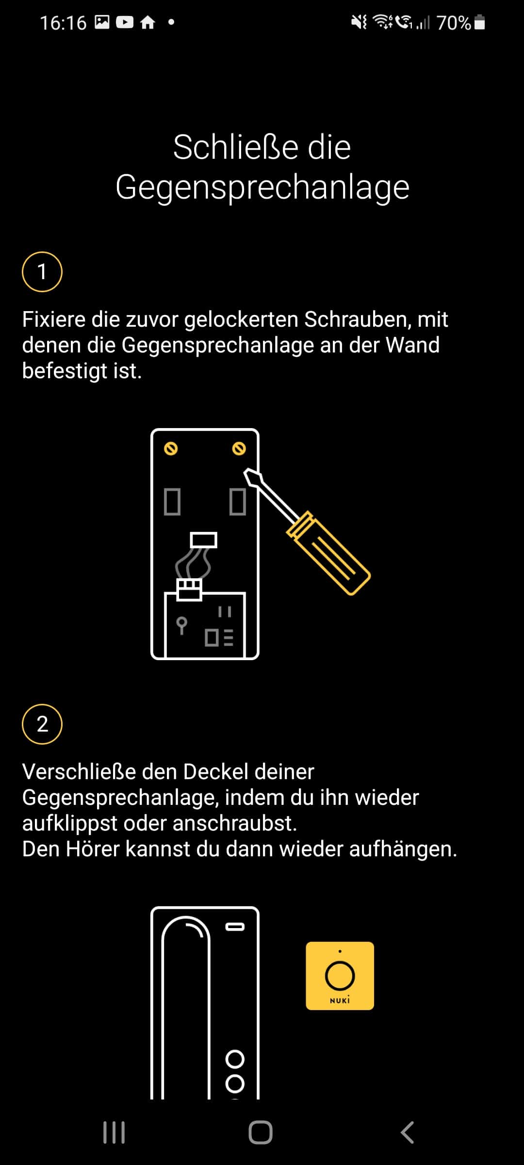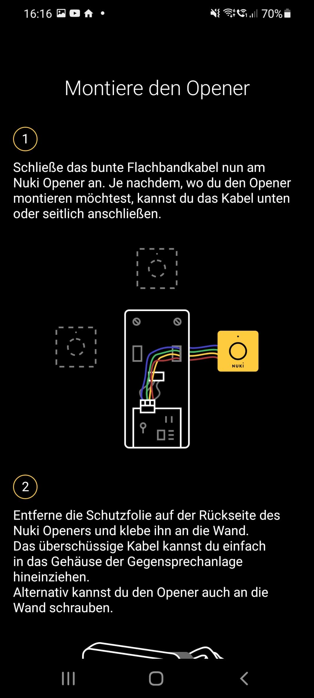 Ohne die Anleitung in der Nuki-App sollte kein Montageversuch unternommen werden, schließlich kann es im schlechtesten Falle zu Verletzungen sowie zum Ausfall der Öffnungsanlage kommen, was mehr als nur ein wenig ärgerlich wäre. Wir sind den in der App angezeigten Montageschritten also genauestens gefolgt – und mussten feststellen, dass die Arbeit durchaus anspruchsvoll ist. Die Anleitung war bei unserer Klingelanlage nicht sofort verständlich und könnte Laien durchaus überfordern. Außerdem sind die Kabel einer Klingelanlage sehr dünn und zumindest bei uns auch relativ kurz, wodurch die Montage erschwert wird. Außerdem muss für die vom Opener benötigte Kabelklemme zusätzlicher Platz vorhanden sein. Wir konnten die Bedientafel dadurch nur schwer wieder in die Wandhalterung einhängen. Hier sind also Feinmotorik und gute Augen gefordert. Schlussendlich haben wir es jedoch geschafft. In manchen Regionen bietet Nuki auch einen Installationsservice an, falls man sich das nicht selber zutraut.
