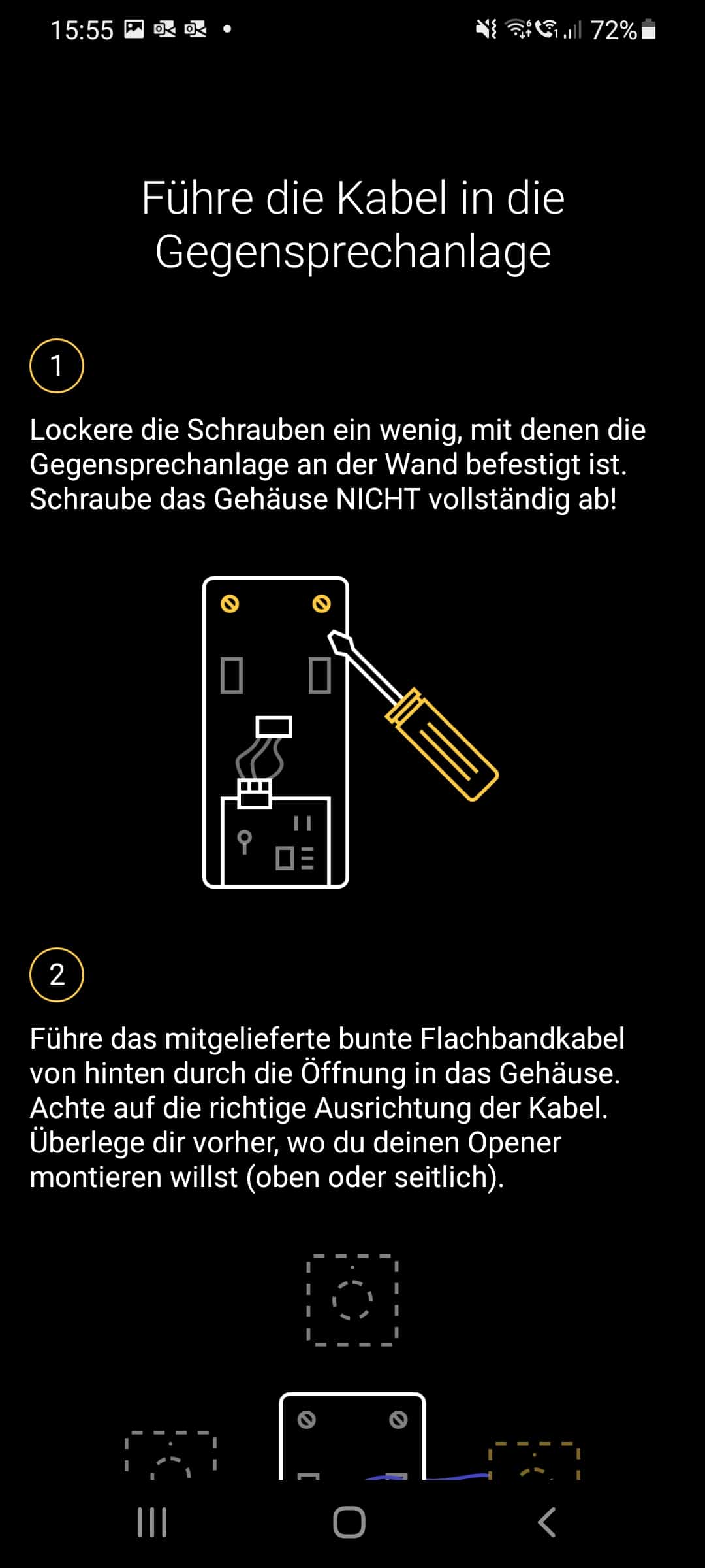 Anschließend muss der Opener selbst, der nur mit einem Steckkabel mit der Klingelanlage verbunden ist, an der Wand angebracht werden. Prinzipiell ist das auf zwei Wegen möglich: Entweder er wird per Klebestreifen befestigt oder angeschraubt. Dieser abschließende Schritt gestaltet sich indes deutlich einfacher als die Verkabelung.
