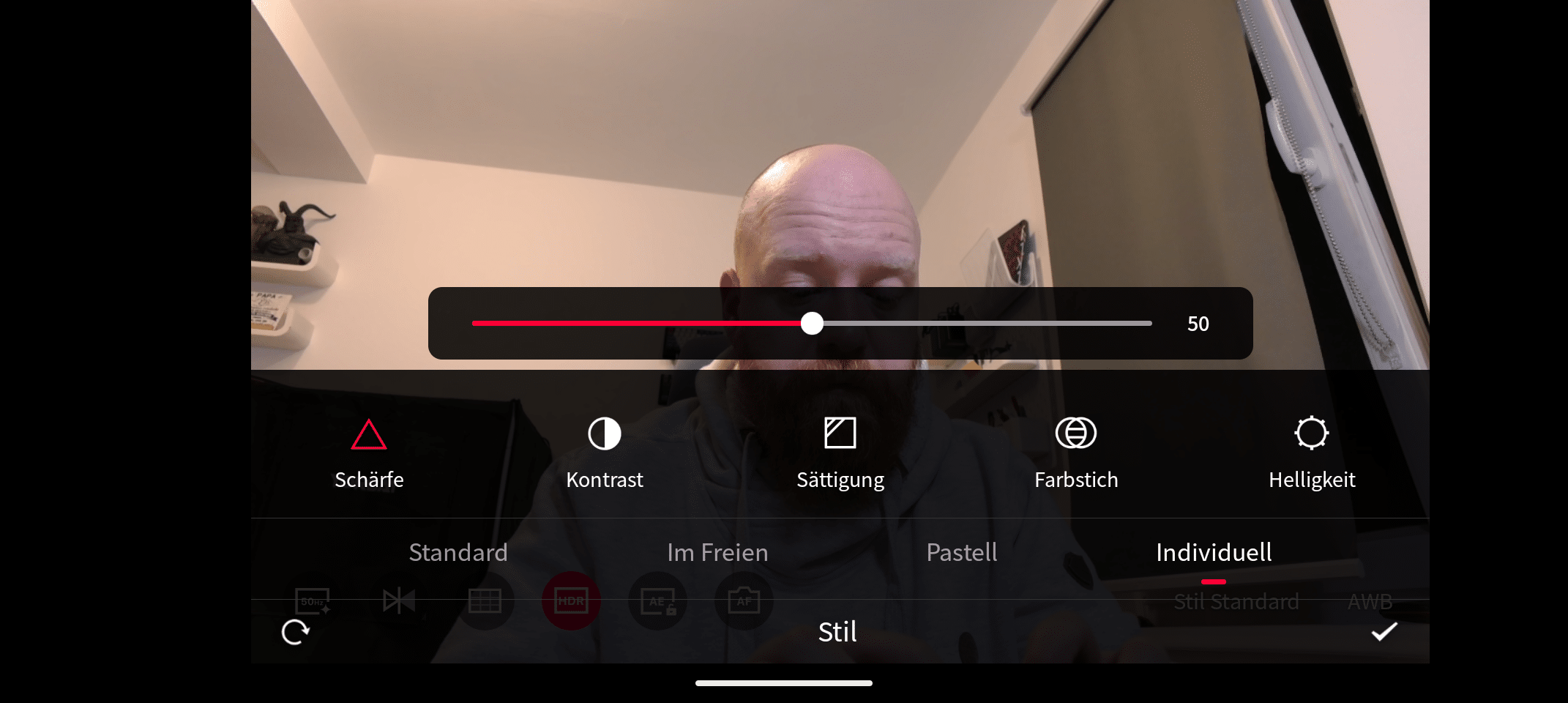 Natürlich gibt es auch professionelle Einstellungen, um Einfluss auf das Bild zu nehmen. Der ISO-Bereich lässt sich beispielsweise zwischen 100 und 6.400 regulieren, wobei Belichtungskorrekturen mit +/-3EV möglich sind. Der Weißabgleich kann manuell zwischen 2000K und 10000K eingestellt werden. Die Verschlusszeit ist zwischen 1/8000s und der Grenze zu den Bildern pro Sekunde (also 60 fps oder bis zu 120 fps Slow-Motion) möglich.