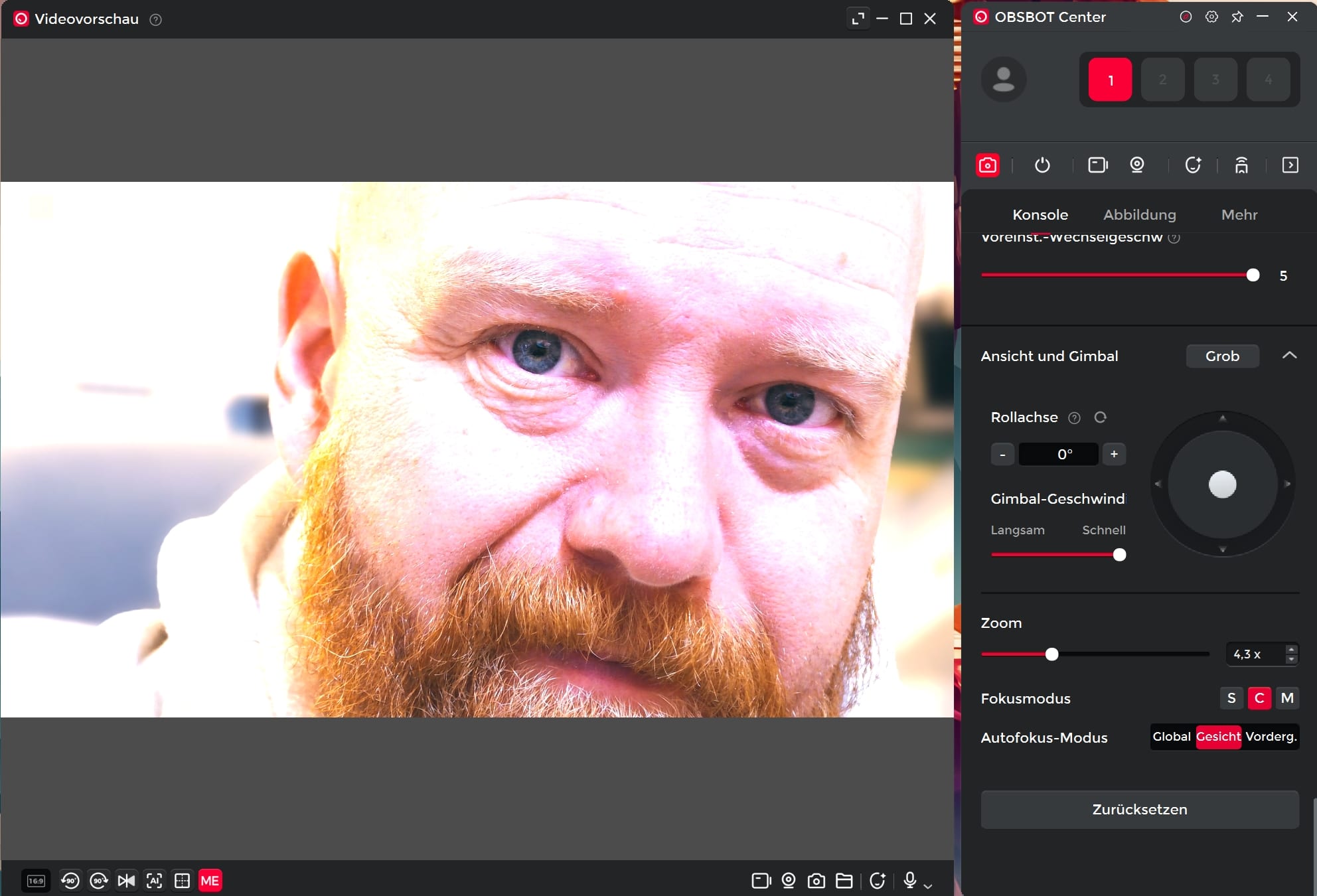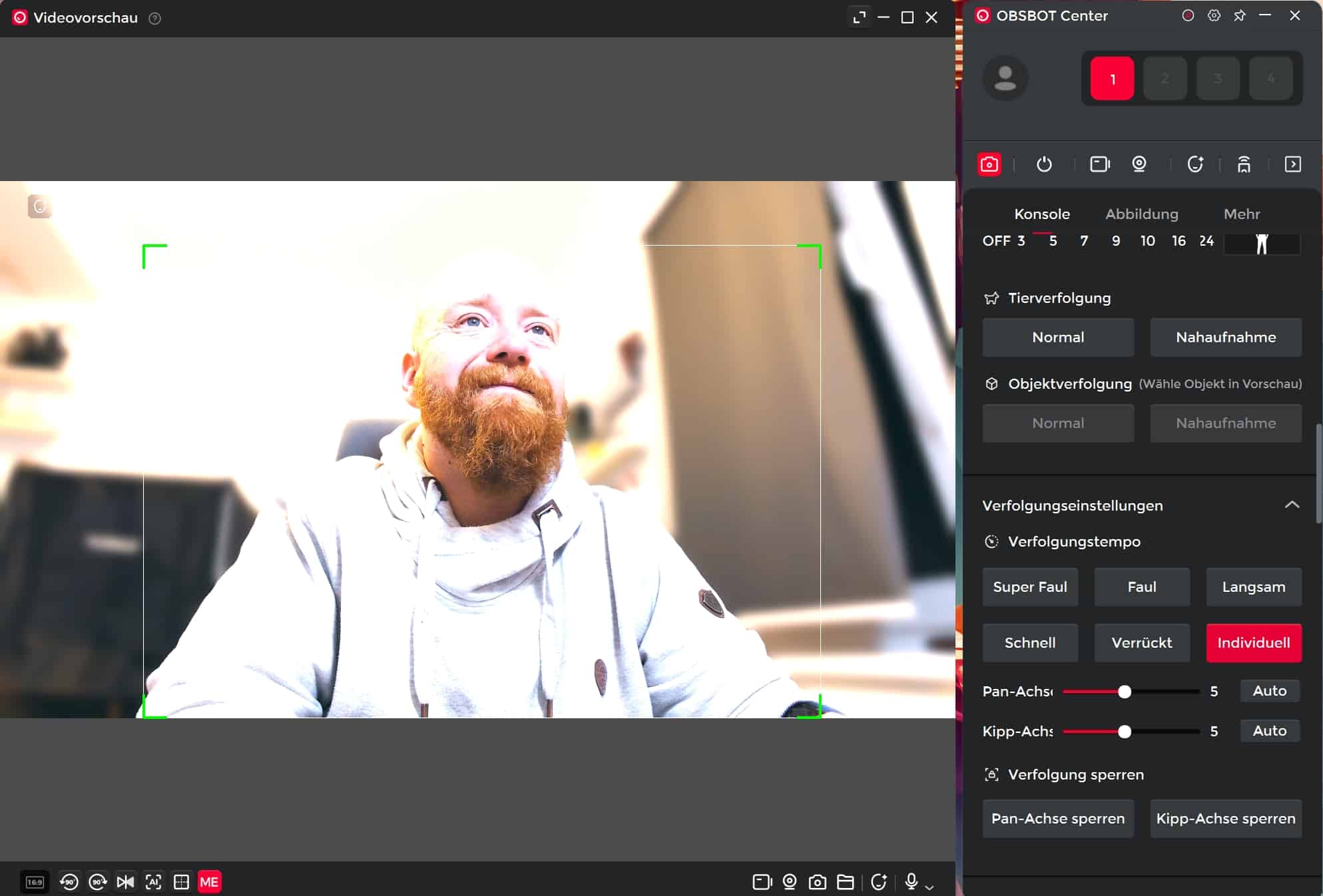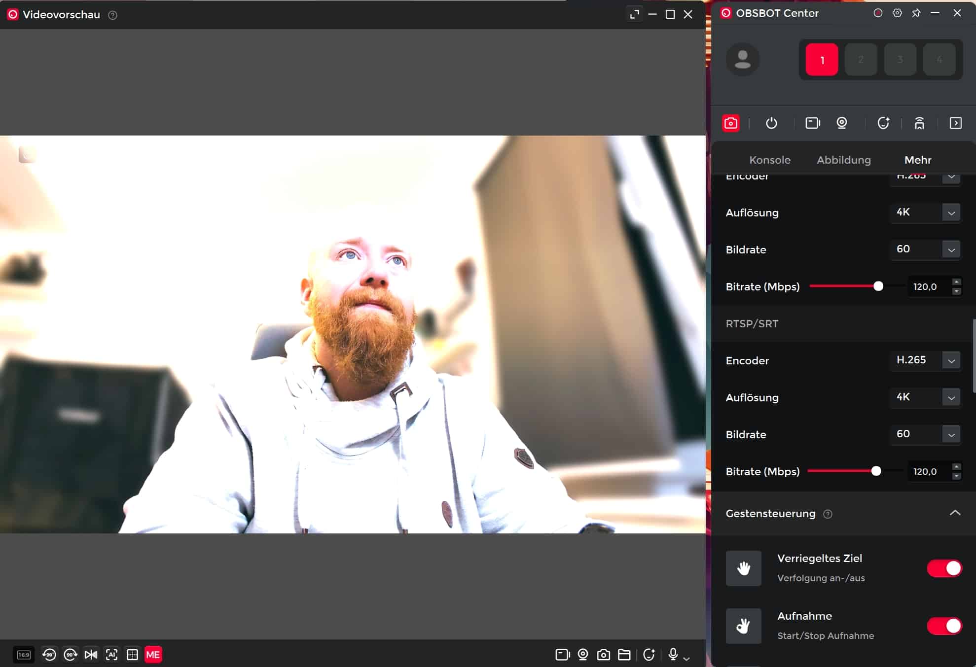 Die Bedienung erfolgt wahlweise über PC/Notebook oder Smartphone und ist wahlweise auch über eine seperat erhältliche Fernbedienung möglich. Am PC/Notebook kommt die bekannte OBSBOT Center-App zum Einsatz, in der auch die Webcams des Herstellers bedient werden.