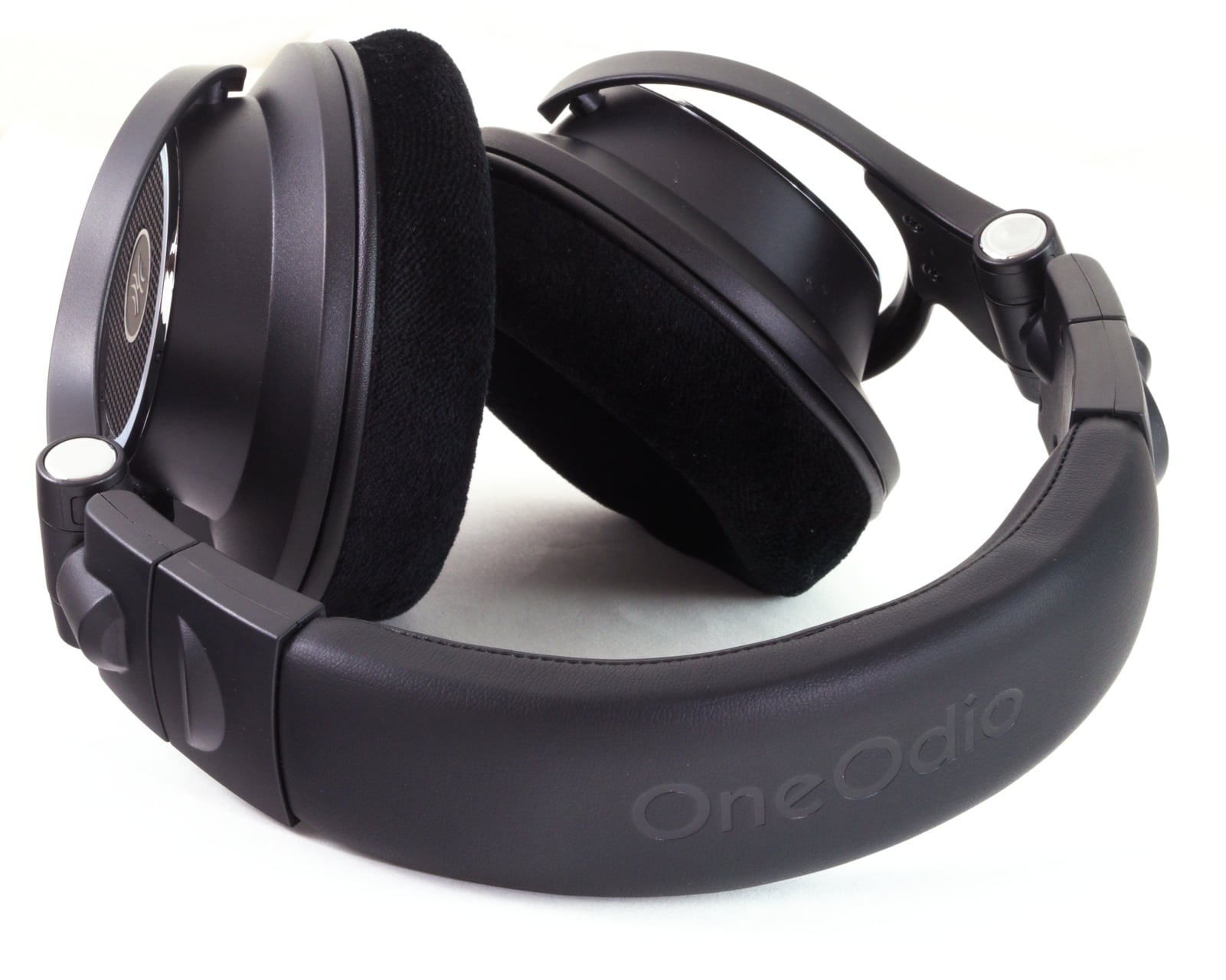 Abseits der offenen Bauweise ist der Aufbau der Monitor 80 recht gewöhnlich. Die beiden Hörer sind über Gelenke mit je zwei Haltearmen verbunden, die wiederum durch zwei Gelenke mit dem federnden Kopfband verbunden sind. Außen besteht der größte Teil der Kopfhörer dabei aus Kunststoff: An den meisten Stellen ist dieser Mattschwarz, doch es gibt auch einige silberne Zierelemente. Metall wird hingegen bei der Höhenverstellung und damit wohl auch im Kern des Kopfbandes sowie bei den Abschirmgittern an den Hörern verwendet. Außerdem kommt bei den OneOdio Monitor 80 noch ein Bezug aus Kunstleder für das Kopfpolster und ein Velours-Imitat für die Hörer zum Einsatz. Insbesondere letzteres sorgt für ein angenehmes Tragegefühl – dazu im nächsten Punkt mehr.