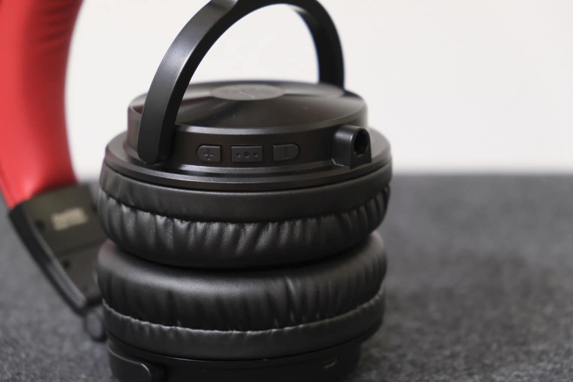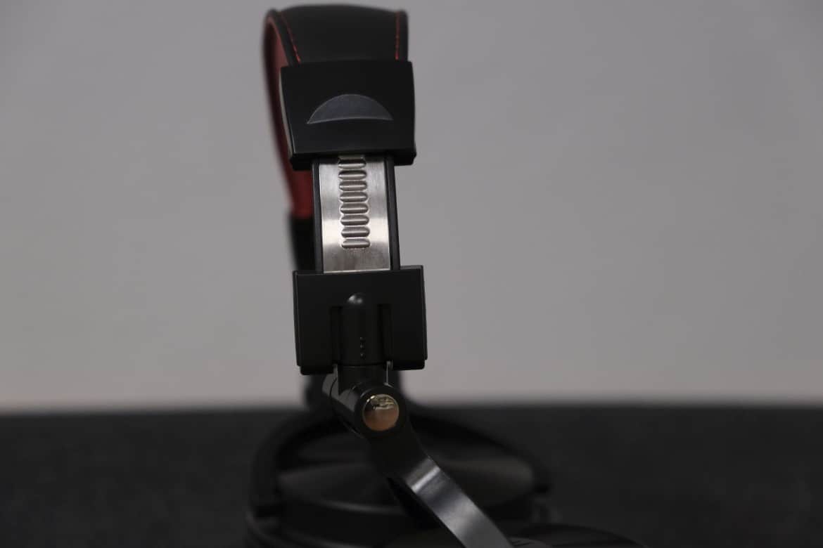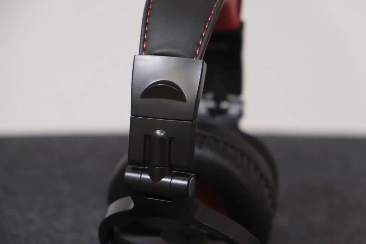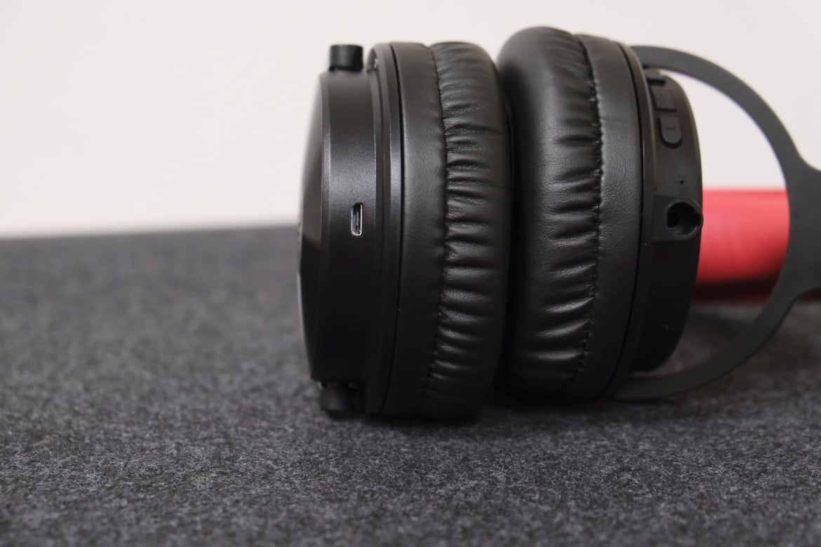 Die mit großzügigem und weichem Kunstleder überzogene Innenseite des Bügels ist knallrot und sticht direkt ins Auge. Genauso verhält es sich mit den ebenfalls roten Polstern an der Innenseite der Ohrmuscheln.