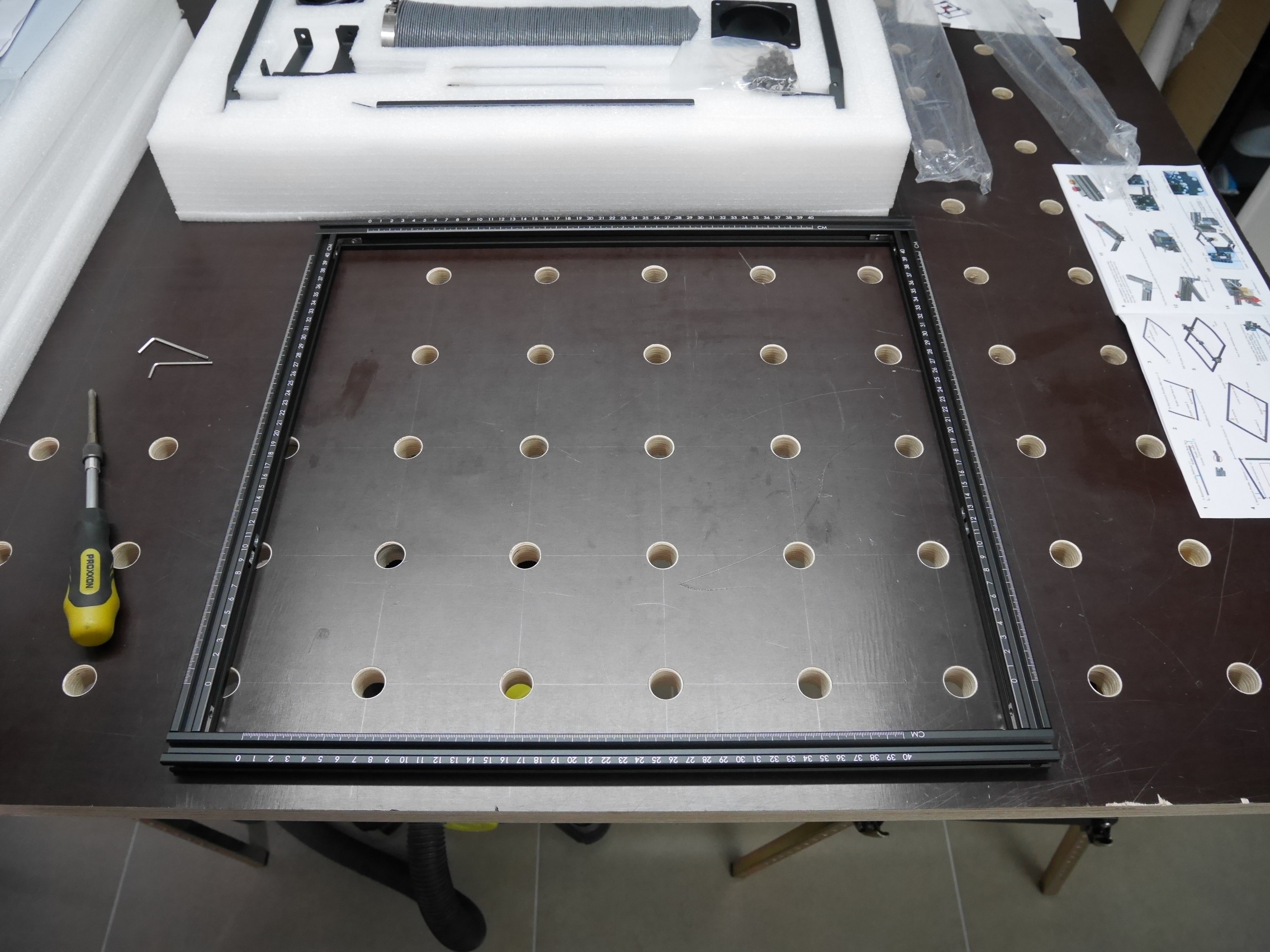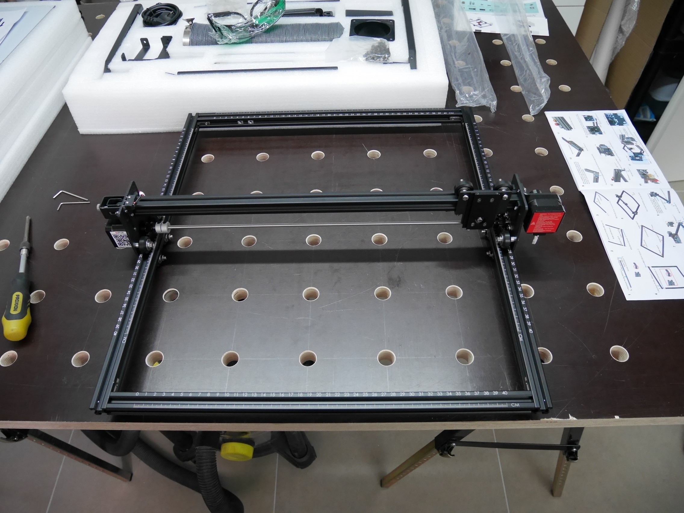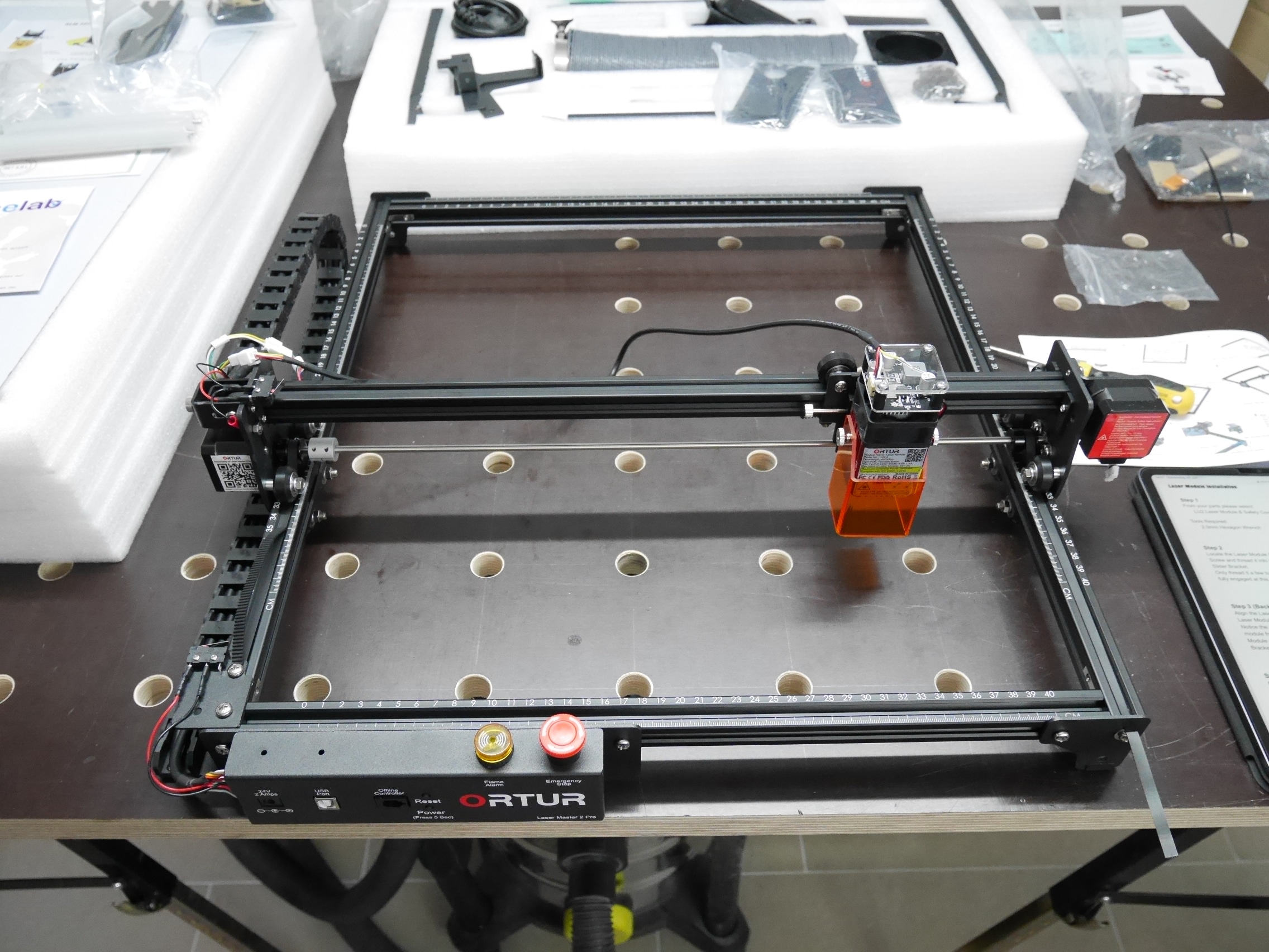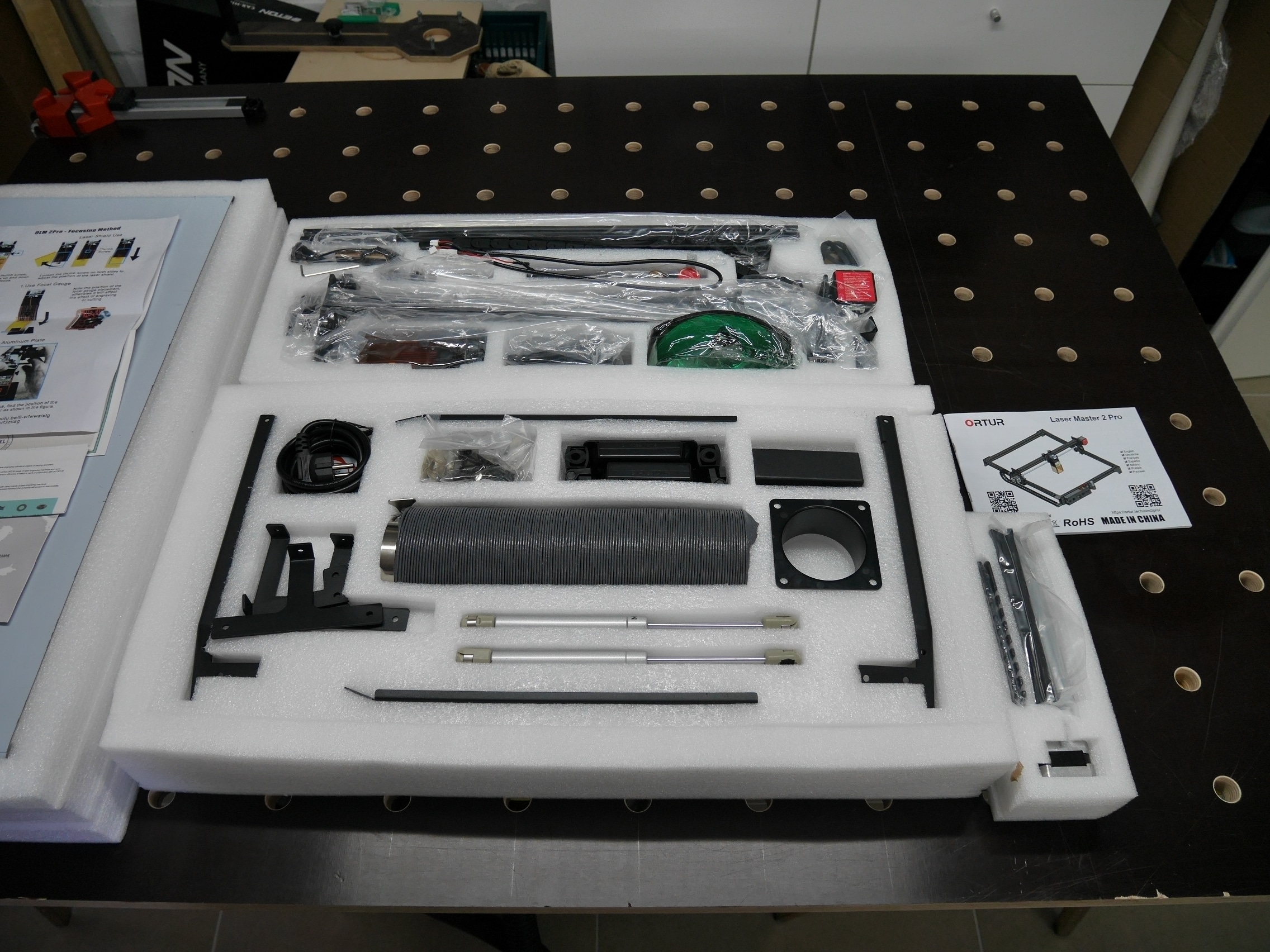Der Ortur Laser Master 2 Pro wird bereits weitgehend vormontiert geliefert, besteht aber dennoch aus etlichen Teilen. Zur Montage sollte man deshalb je nach Erfahrung und handwerklichem Geschick einige Zeit eingeplant werden. Leider ist die mitgelieferte gedruckte Anleitung sehr schlecht und so klein, dass auf den Bildern viele Details nicht erkannt werden können. Wir empfehlen daher die Nutzung des Onlinehandbuchs (PDF). Dies ist zwar noch nicht vollständig, bietet aber deutlich bessere Bilder und vereinfacht den Aufbau so deutlich.