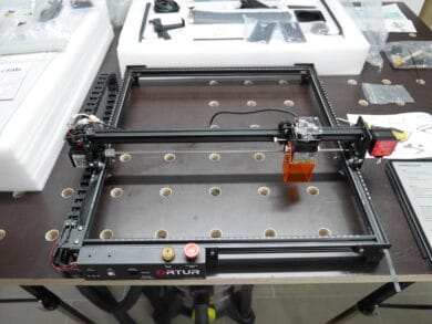 Sowohl das Material als auch die Verarbeitung wirken sehr hochwertig. Es handelt sich hierbei nicht um typische „Chinaware“. Alle mechanisch beanspruchten Teile wie der Rahmen und die Führungsschienen des Lasers bestehen aus einem soliden Aluminiumprofil, das durch zusätzliche Winkel-Innenverbindungen verstärkt ist. Acryl- und Plastikteile werden von Ortur nicht verbaut. Der Gesamteindruck ist daher ausgezeichnet.