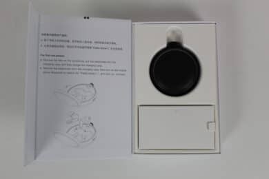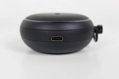 Das Ladecase ist ein echter Hingucker. Auf dem Case, welches optisch einer Taschenuhr ähnelt, befindet sich ein LED-Ring. Dieser stellt den Ladezustand dar. Dieser Ring ist in schwarzen, rauen Kunststoff eingelassen. Grundsätzlich fühlt sich dieses sehr hochwertig an und lässt sich leicht durch einen Druck auf den oberen Pin öffnen. Im Alltag ist dieser auch fest verschlossen, ein versehentliches Öffnen ist quasi ausgeschlossen. An der Seite befindet sich ein USB-C Port, um das Case zu laden.