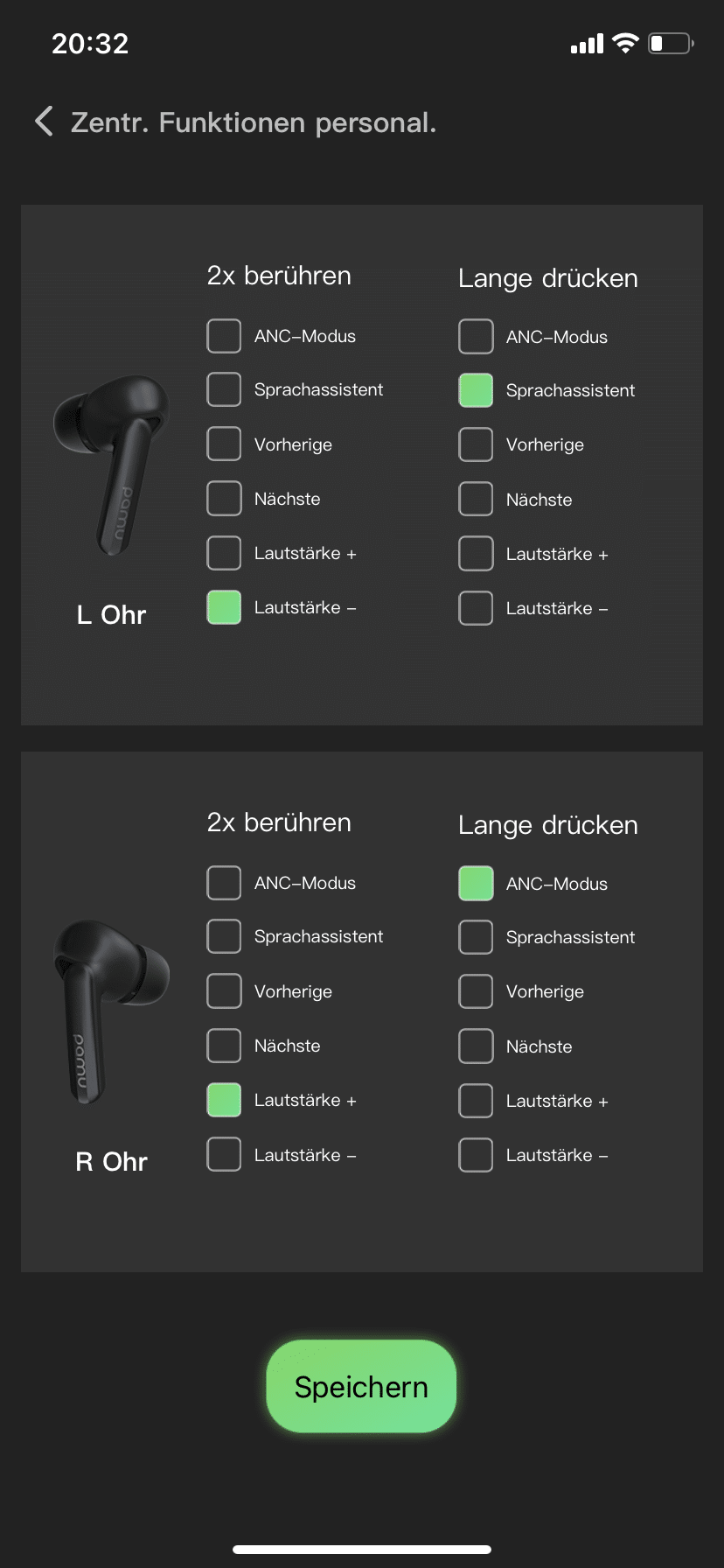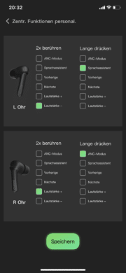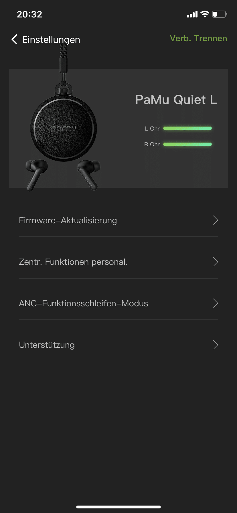 Möchte man den Ladezustand sehen, so lässt sich dies über die App realisieren. Grundsätzlich lassen sich die wichtigsten Features einstellen, überladen mit Features ist diese jedoch auf keinen Fall. Das Einbinden der Kopfhörer verläuft eigenständig, in der App kann man dann, wie erwähnt, den Ladezustand sehen, den ANC-Modus ändern, die Firmware aktualisieren und die Touchfunktionen anpassen.