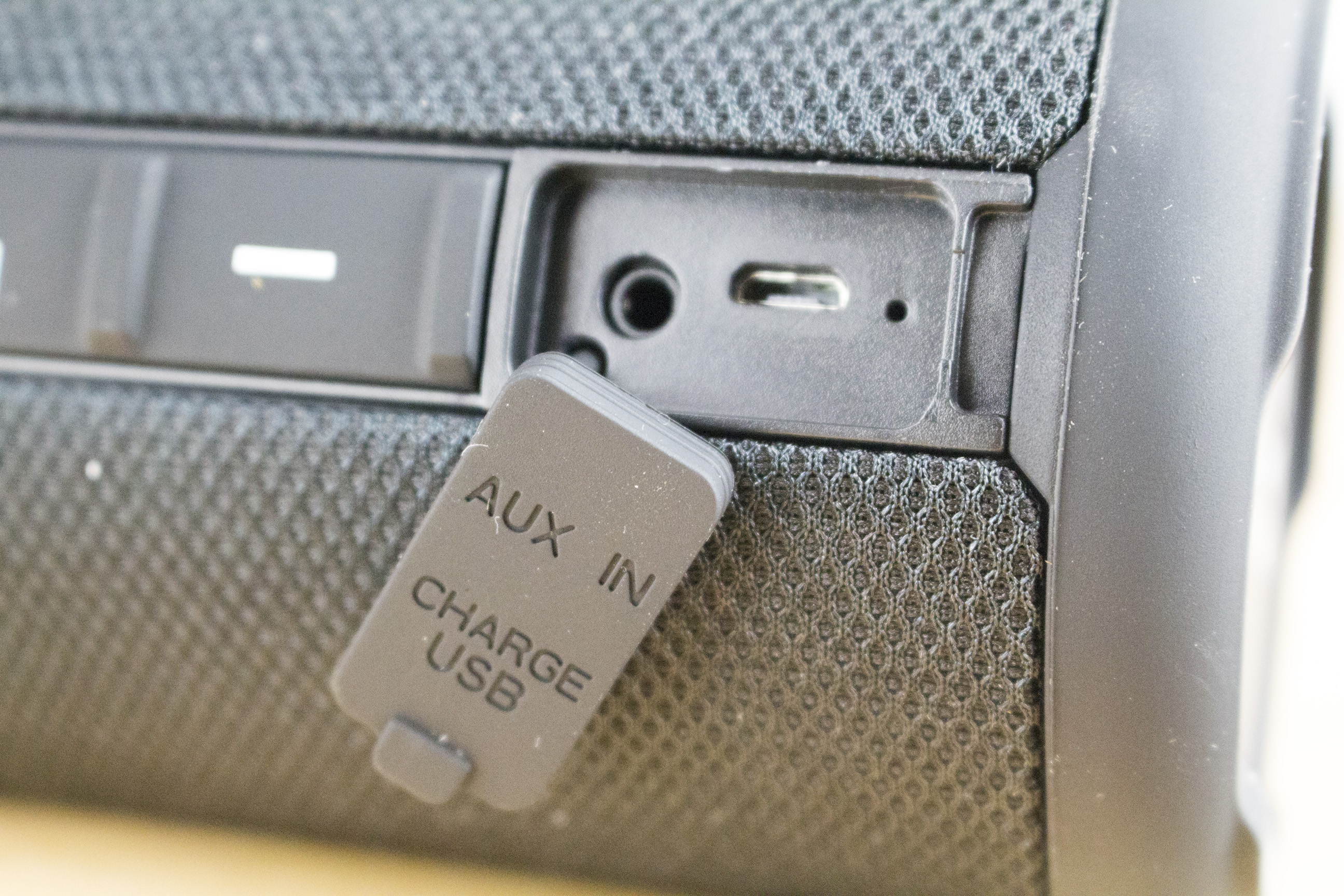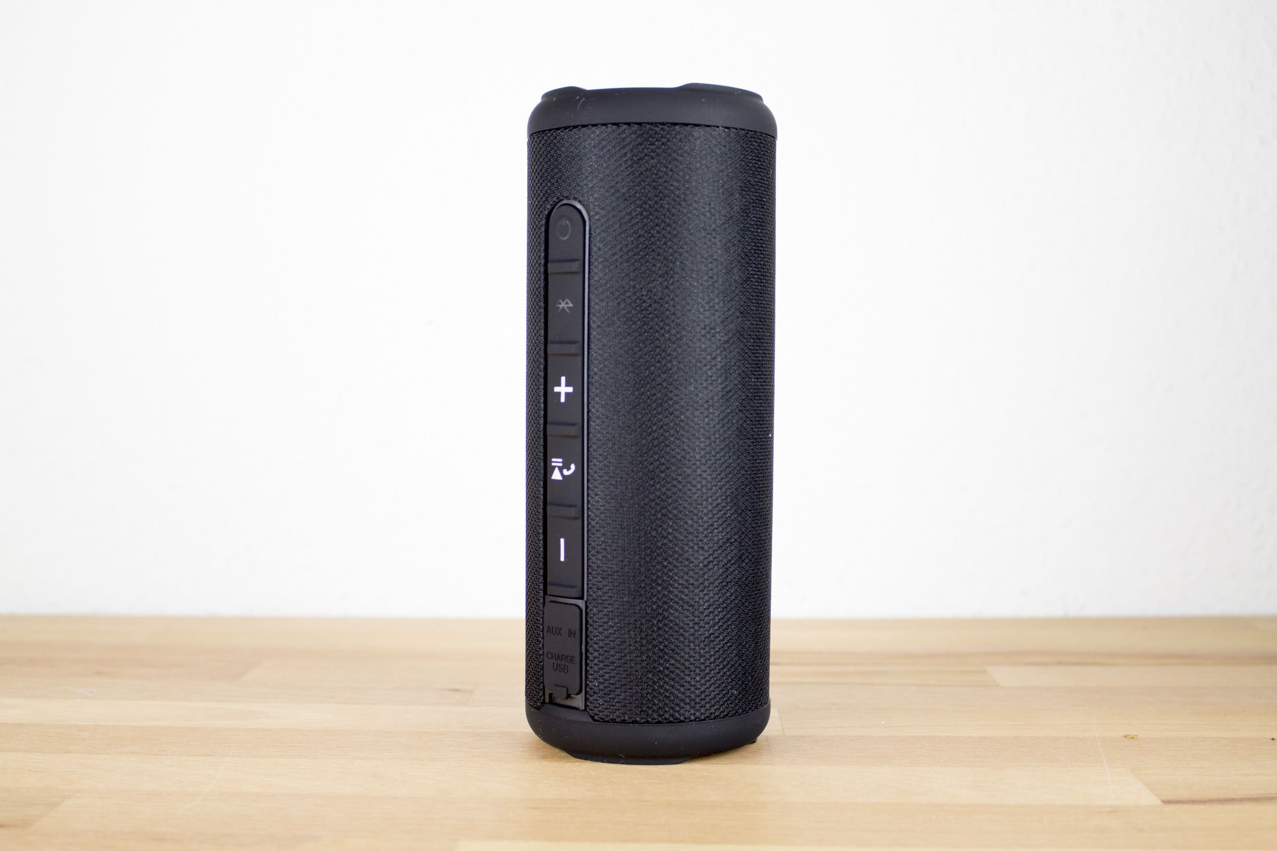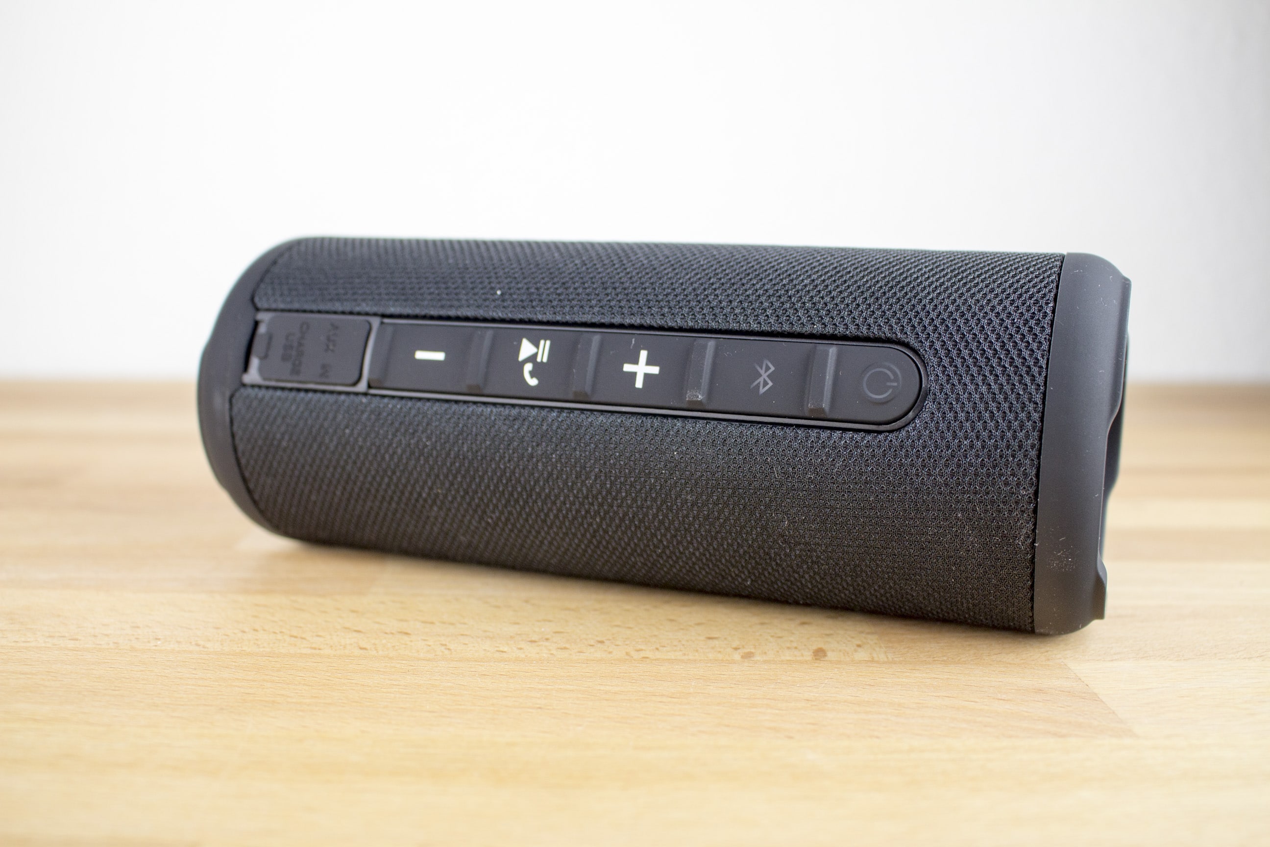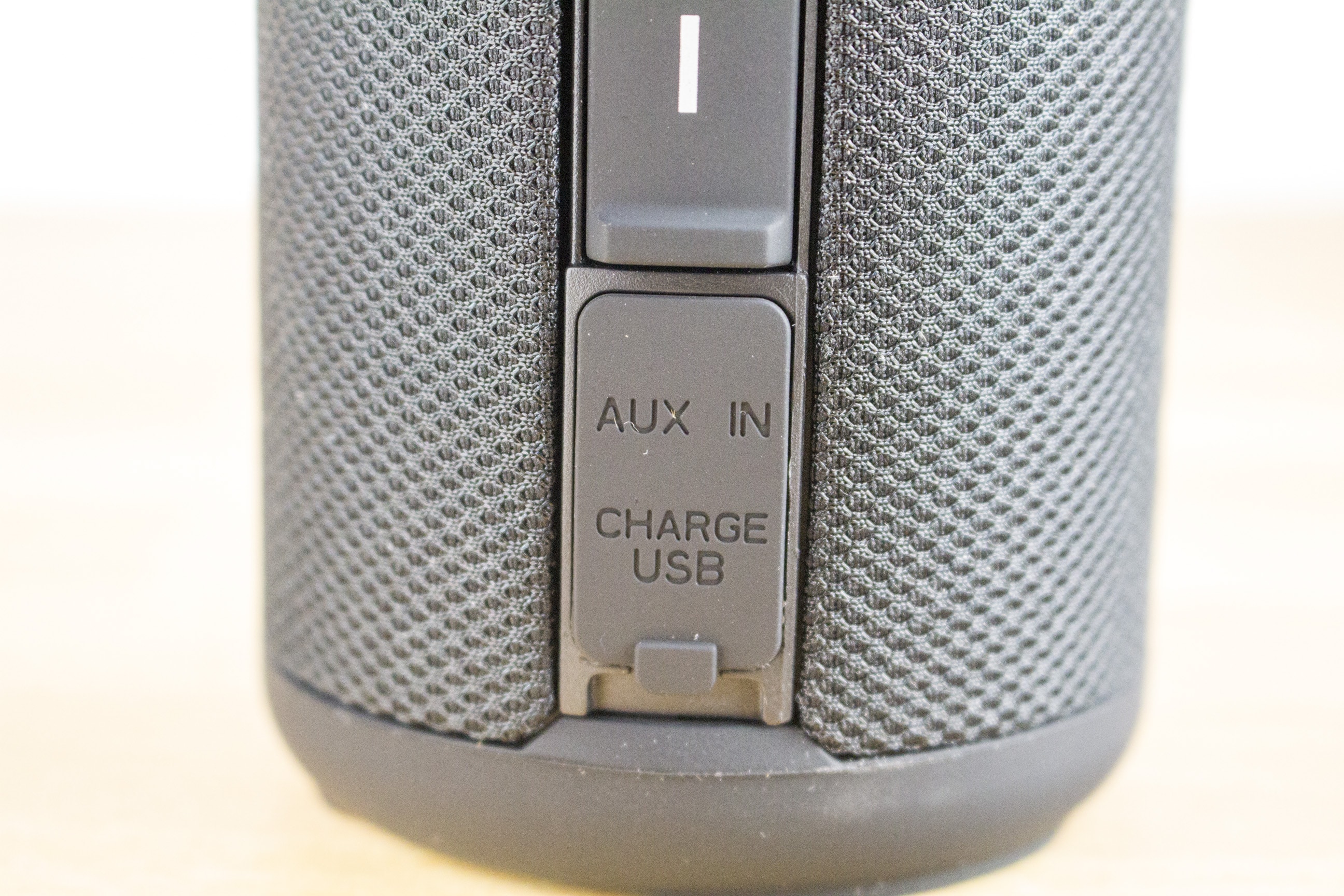 Die Stoffstruktur wird auf zwei Seiten durch zusätzliche Gummierungen durchbrochen. Während auf der einen Seite die Bedienelemente sowie die beiden Anschlüsse für MicroUSB und Klinke zu finden sind, dient die andere Seite nur zum Hinlegen des Lautsprechers.
