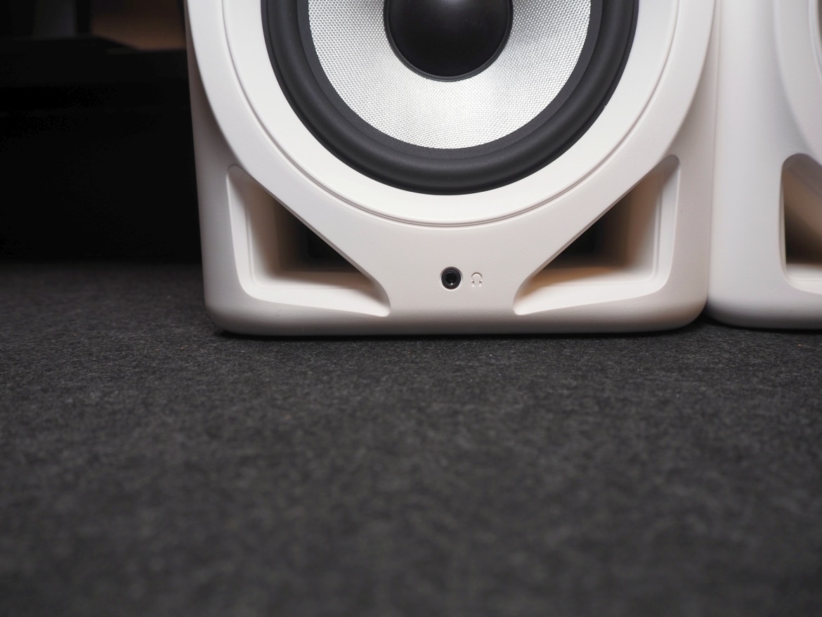 Doch zunächst zurück zum Design. Die Frontpartie wird von einem 5 Zoll großen Tieftöner aus Glasfaser und einem darüber befindlichen 3/4-Zoll-Softdome-Hochtöner (Weichkalotte) dominiert. Unten finden wir am linken Lautsprecher einen 3,5-mm-Klinkenanschluss samt Kopfhörer-Symbol, sowie auf der rechten Seite auf mittlerer Höhe einen drehbaren Lautstärkeregler samt LED-Power-Anzeige.