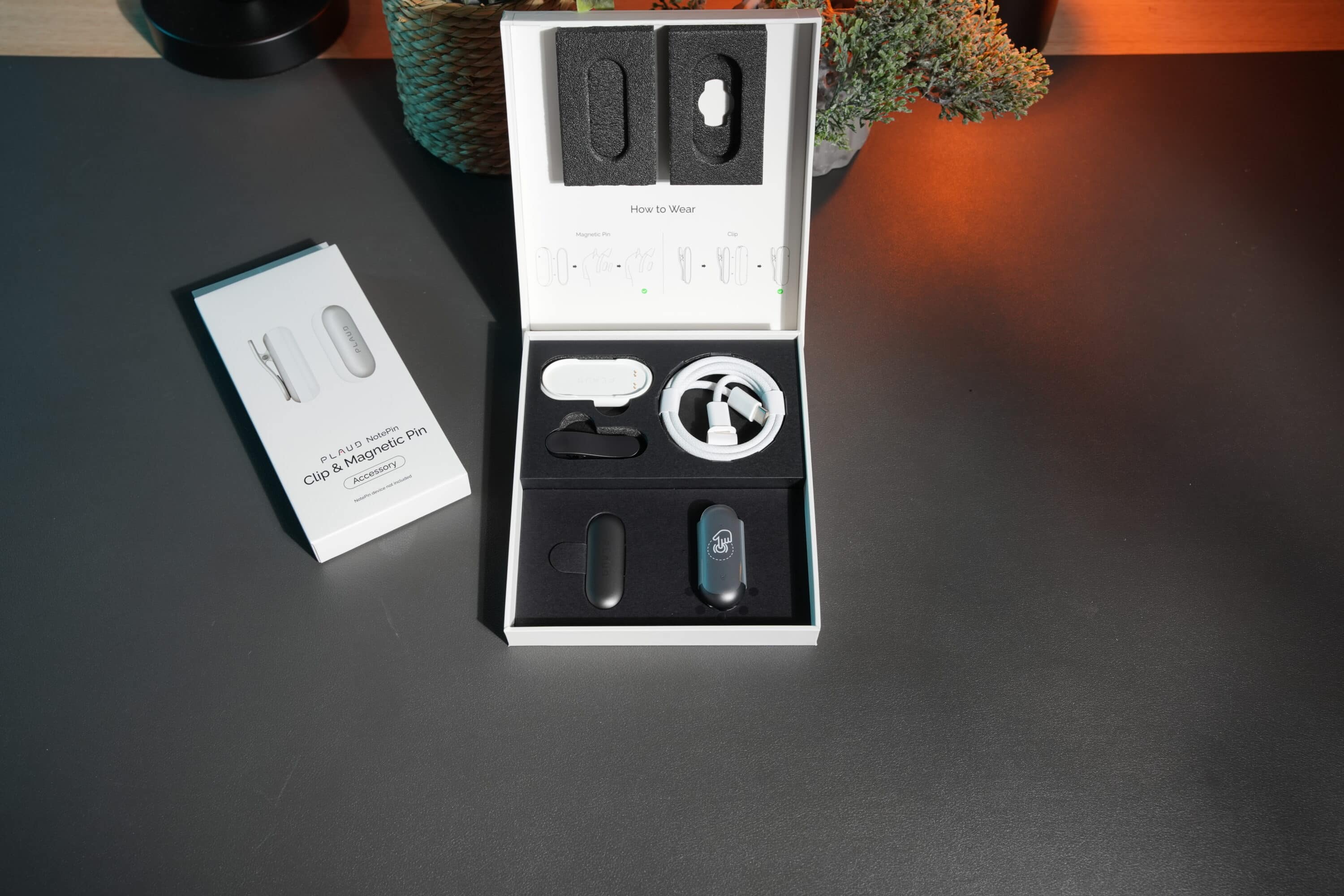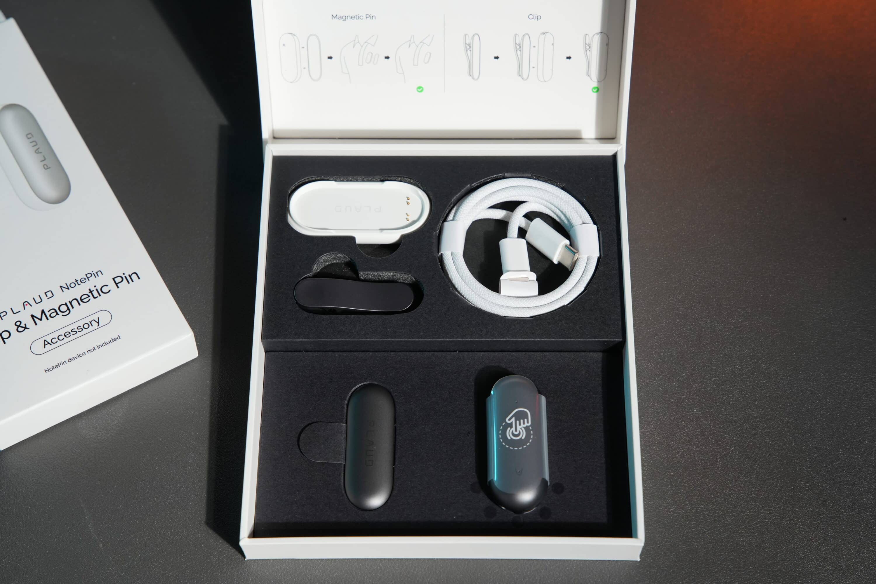 Beim Auspacken des PLAUD NotePin fühlt man sich als Kenner unweigerlich an ein Apple-Produkt erinnert. An der Rückseite der weißen Verpackung will eine weiße Lasche abgezogen werden, um an den Inhalt zu gelangen. Das stoffummantelte USB-C- auf USB-C-Kabel sieht dem der aktuellen iPhone-Modelle zum Verwechseln ähnlich.