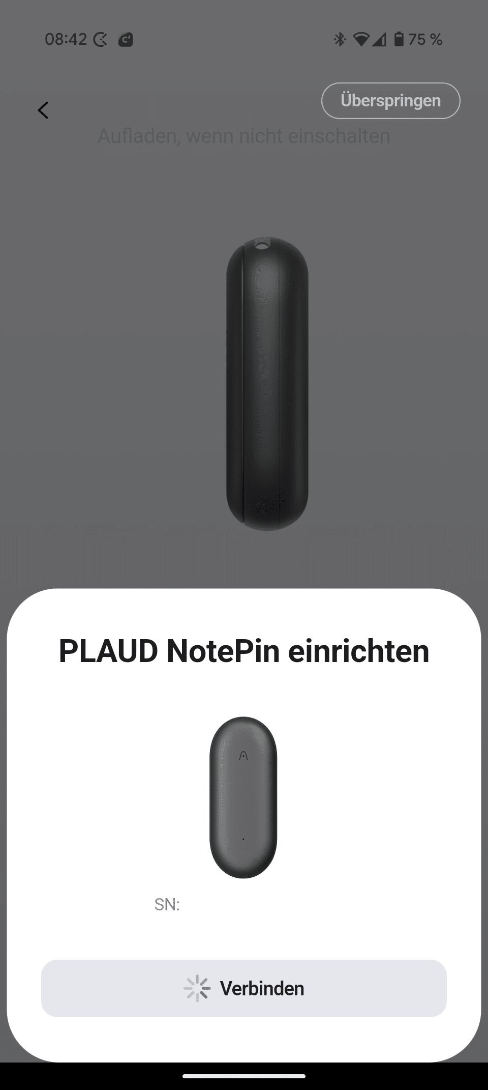 Einen physischen Button bietet der PLAUD NotePin damit also nicht. Für die Bedienung hältst du einfach den Finger auf dem mittleren Bereich an der Oberseite (zwischen den beiden Mikrofonen), woraufhin eine spürbare Vibration verrät, dass die Aufnahme gestartet ist.