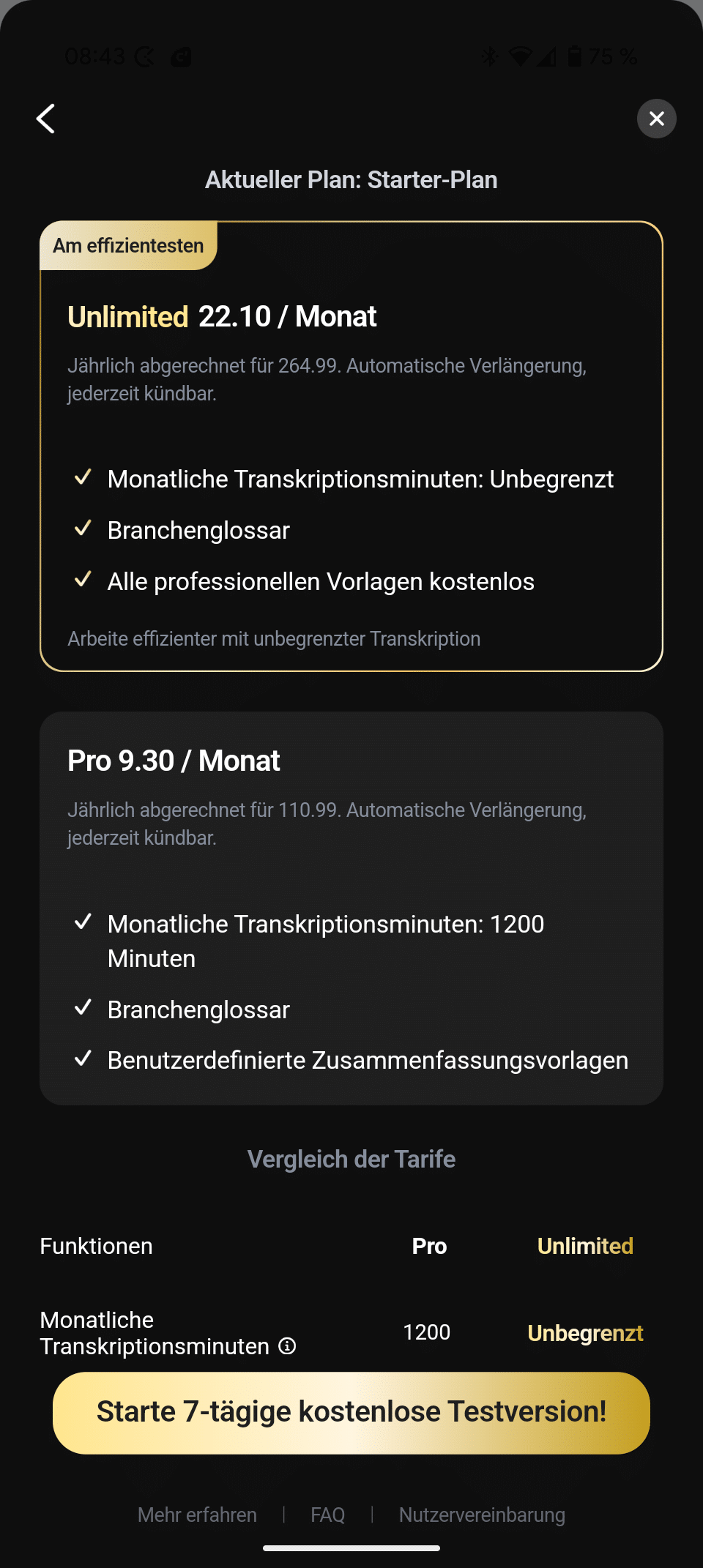 Hierzu der Hinweis: Viele Funktionen verstecken sich hinter einem Premium-KI-Abo. Hier gibt es ein PRO-Abo für 110,99 Euro pro Jahr (9,30 Euro im Monat), sowie ein Unbegrenzt-Abo für 249,99 Euro jährlich (22,10 Euro pro Monat). Die gute Nachricht: Der NotePin lässt sich aber auch problemlos kostenlos, ohne den Abschluss eines Abos nutzen. Dafür sind die monatlichen Transkriptionsminuten jedoch auf 300 begrenzt und auch einige Zusatzfeatures wie Vorlagen, Branchenglossar oder die Möglichkeit, die KI zu befragen, fehlen.