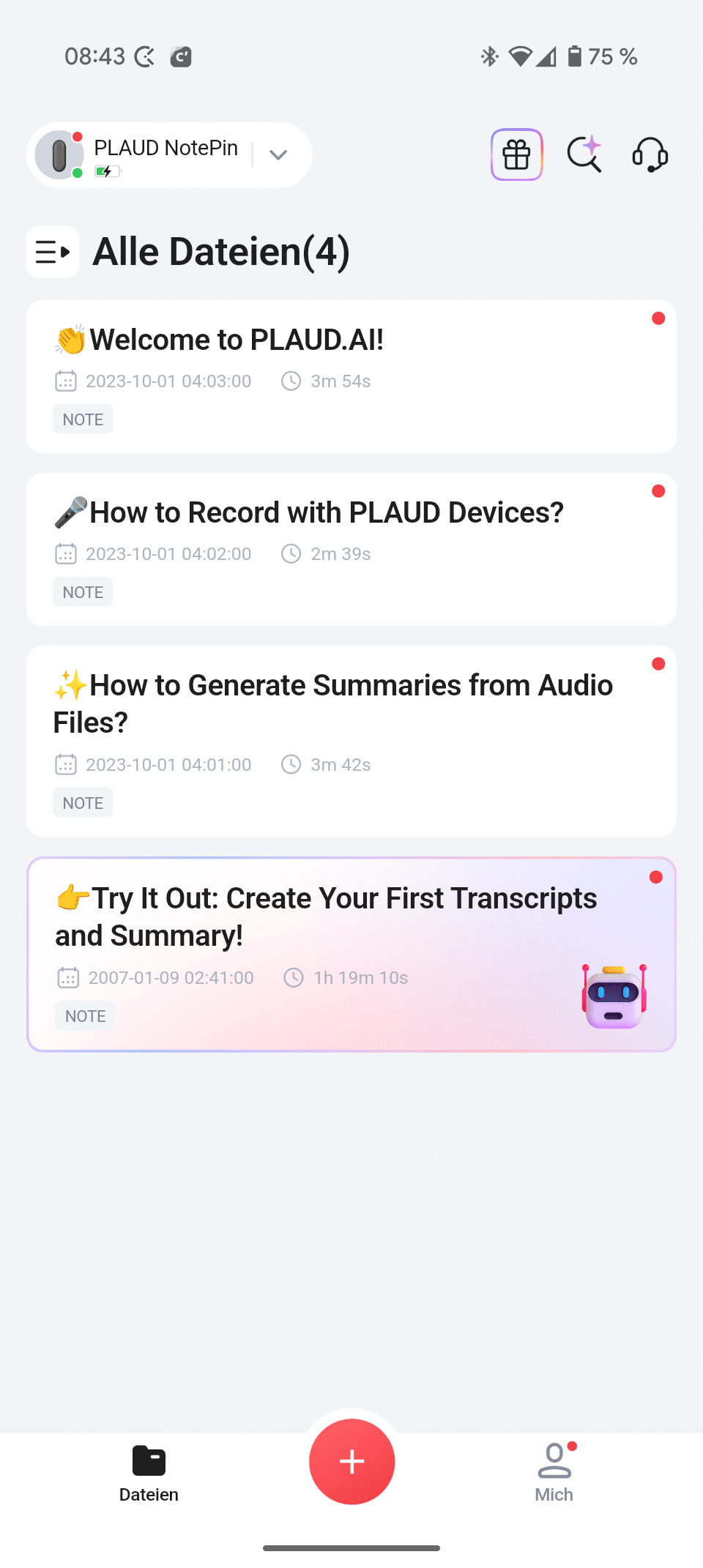 Die App ist dabei angenehm übersichtlich aufgestellt. Auf der Hauptseite findest du all eine Aufnahmen, am unteren Rand hast du zudem die Möglichkeit, Audiodateien in die App zu importieren oder die Aufnahme zu starten. Unter dem Reiter „Mich“ kannst du zudem verschiedene Einstellung vornehmen und den NotePin anpassen, beispielsweise für Firmware-Updates, die Mikrofonverstärkung und vieles mehr.