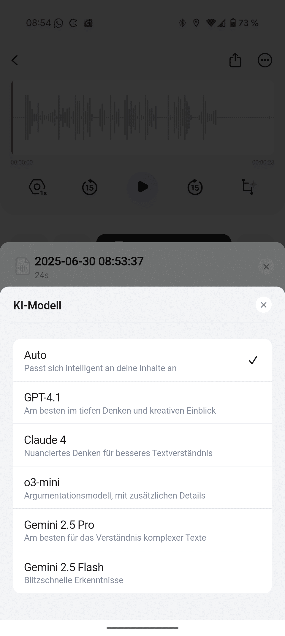 - KI-Modell (automatisch oder GPT4.1, Claude 4, o3-mini, Gemini 2.5 Pro, Gemini 2.5 Flash)