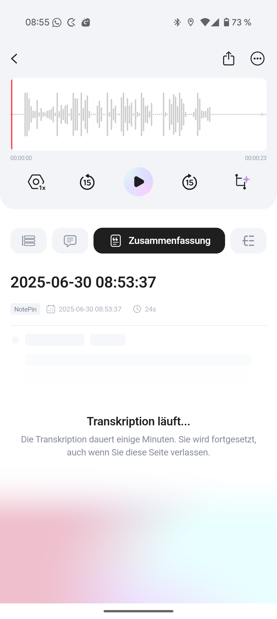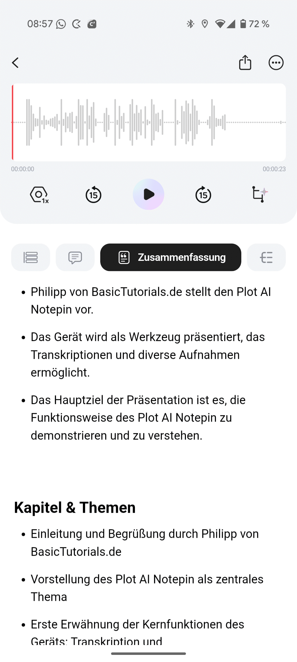 Wählst du eine Aufnahme an, dann kommen die mächtigen KI-Features zum Einsatz. Der PLAUD NotePin ist in der Lage, nicht nur ein Transkript, sondern auch eine Zusammenfassung der Inhalte zu erstellen und liefert dir sogar eine Mindmap mit, die die gesprochenen Inhalte aufgliedert – das gucken wir uns gleich an.