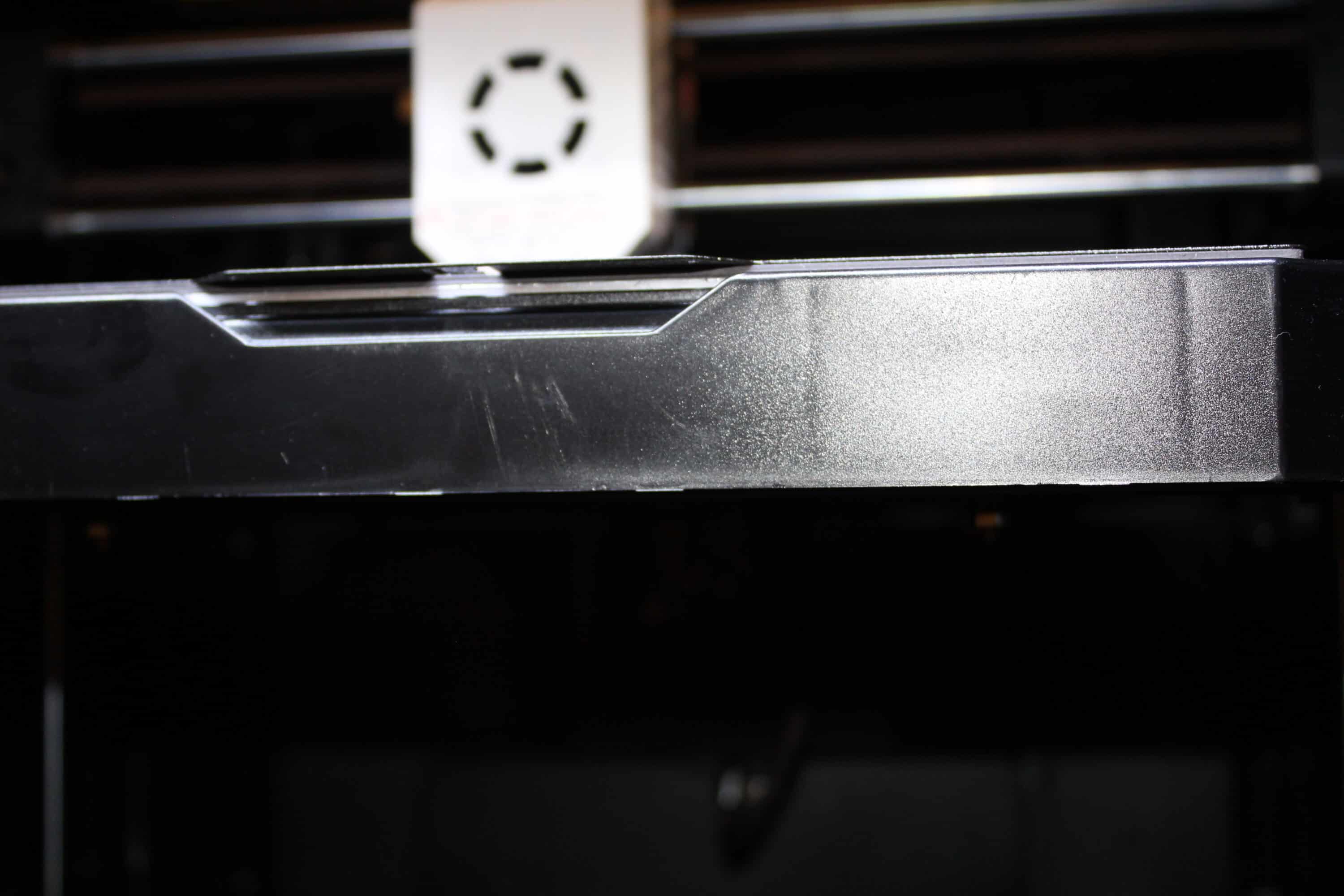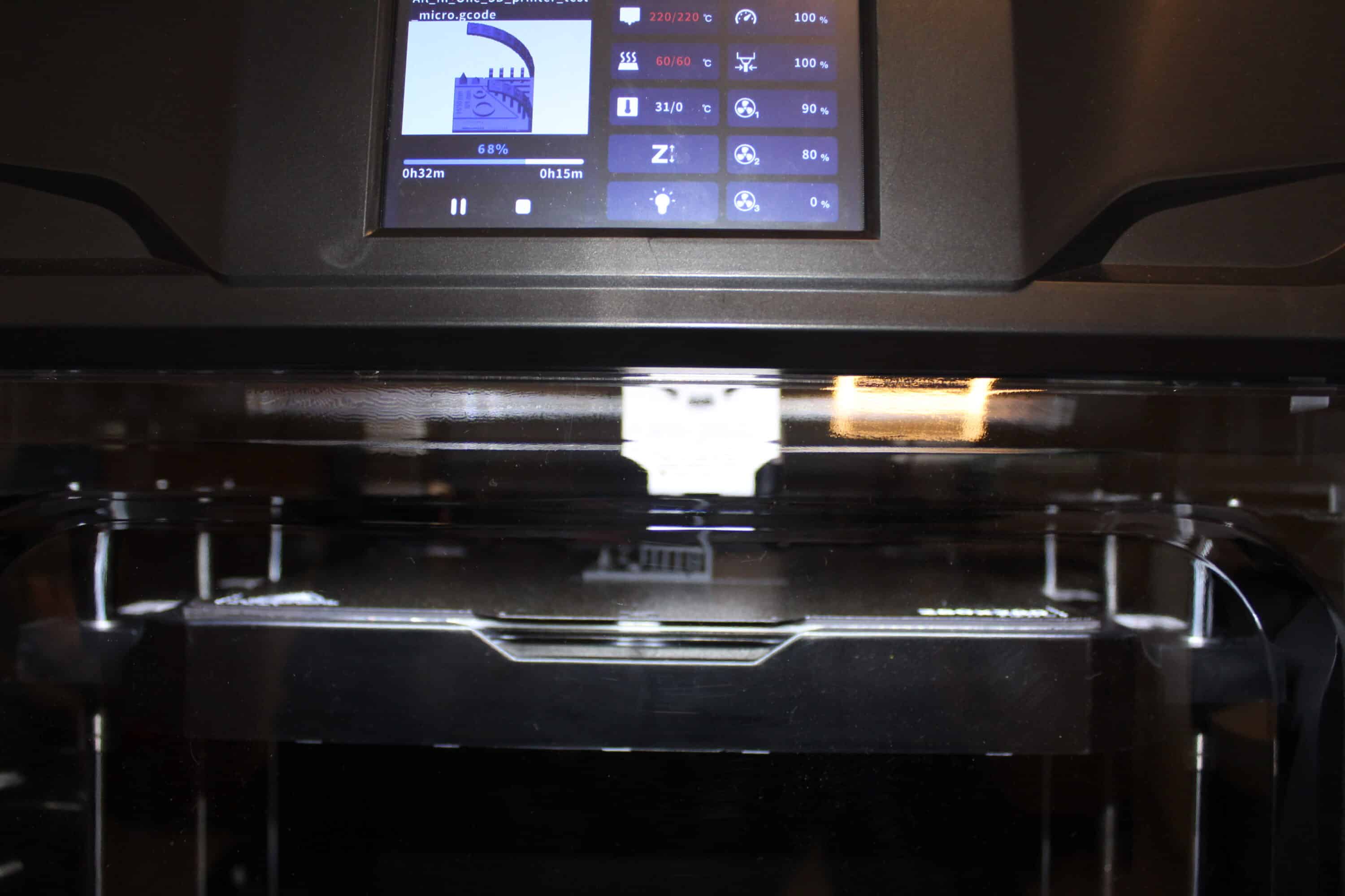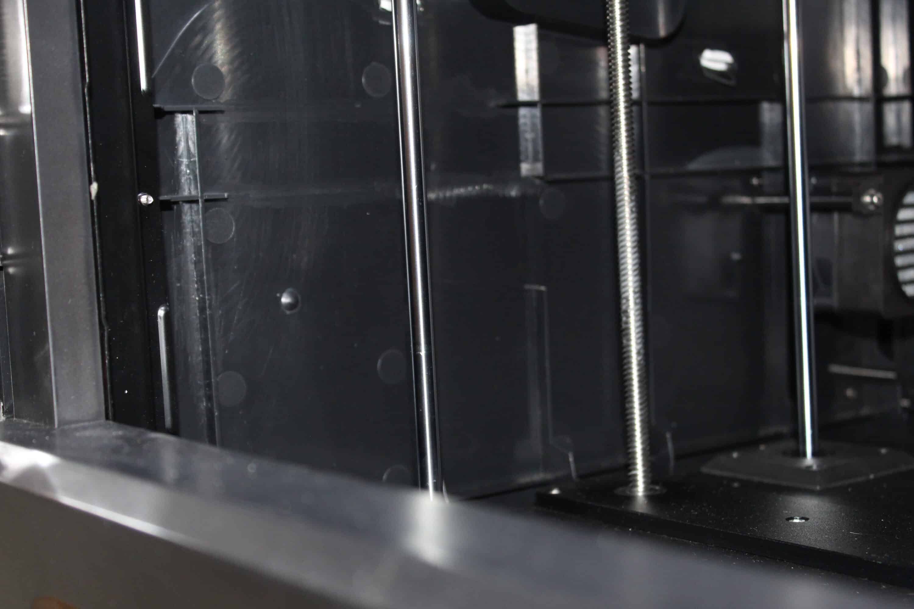 Insgesamt ist alles sauber verarbeitet. Dennoch sieht aufgrund der Bauweise die ein oder andere Stelle etwas „günstig“ umgesetzt aus. Die Blende unter dem Druckbett wirkt „ausgefranzt“ aufgrund einiger Verarbeitungspunkte des Kunststoffs. Auch die Tür hätte man insgesamt deutlich schöner lösen können. Für die Funktionalität jedoch zweitrangig.