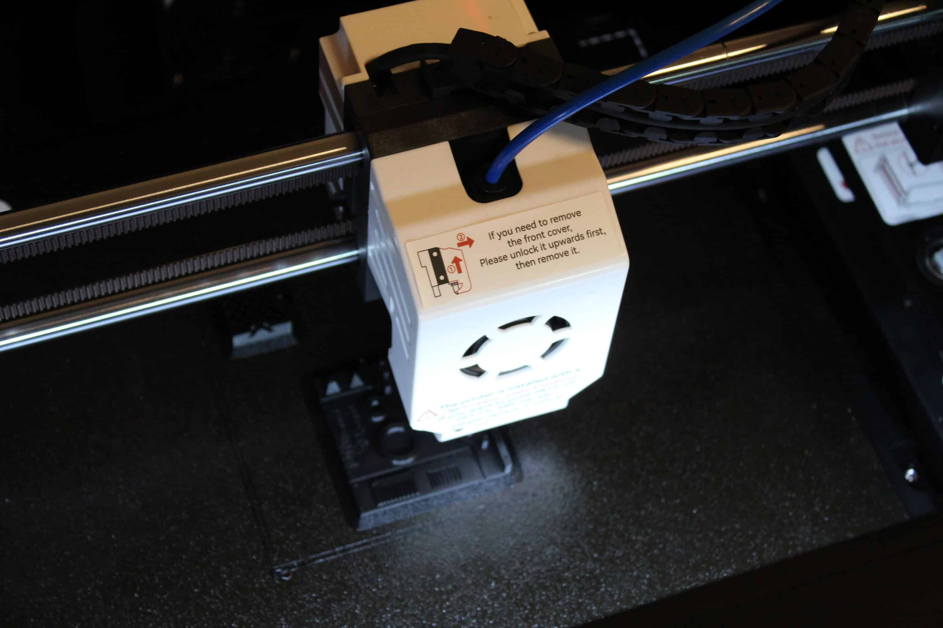 Eine Erkennung, ob Filament wirklich gedruckt wird, gibt es nicht. So ist beispielsweise beim Verschieben des Druckers das Filament verrutscht – er konnte es nicht mehr einziehen. Dennoch „druckt“ er fröhlich vor sich hin. Da wäre eine Erkennung schon sinnvoll. Auch ist einmal das Filament ohne Außeneinwirkung gerissen – ebenfalls den Druck nicht beobachtet; das Teil war leider nur halb fertig. Auch wenn sich ein Teil aufgrund von zu wenig Haftung löst – was tendenziell sehr selten der Fall ist; die Haftung ist super – wird es fröhlich bis zum Ende vor sich her geschoben.