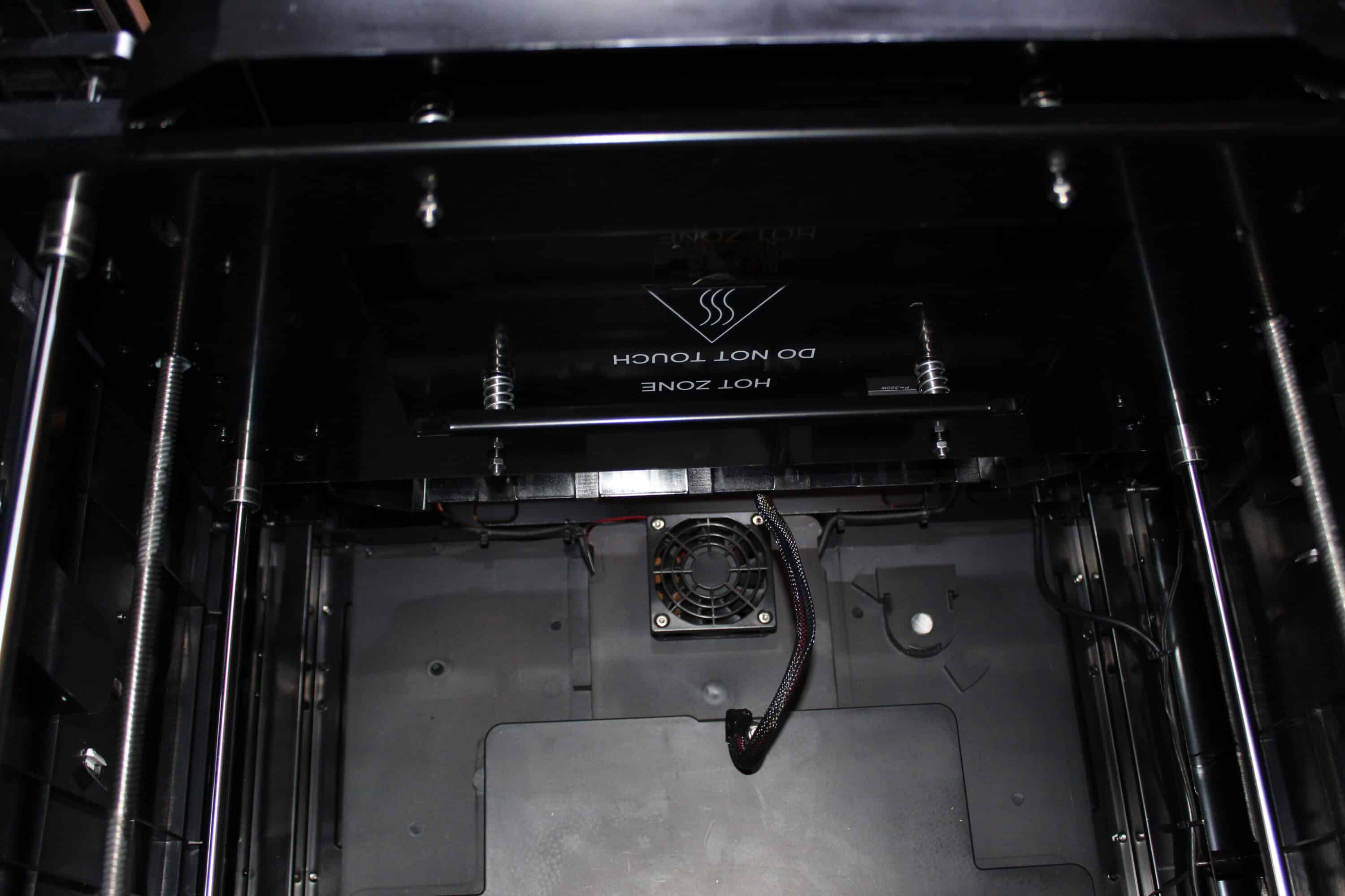 Beheizbar ist hier nicht durch das Druckbett, sondern auch der gesamte Druckraum. Dafür sind drei Lüfter verbaut, sodass die Rahmenbedingungen des Drucks immer identisch sein sollten.
