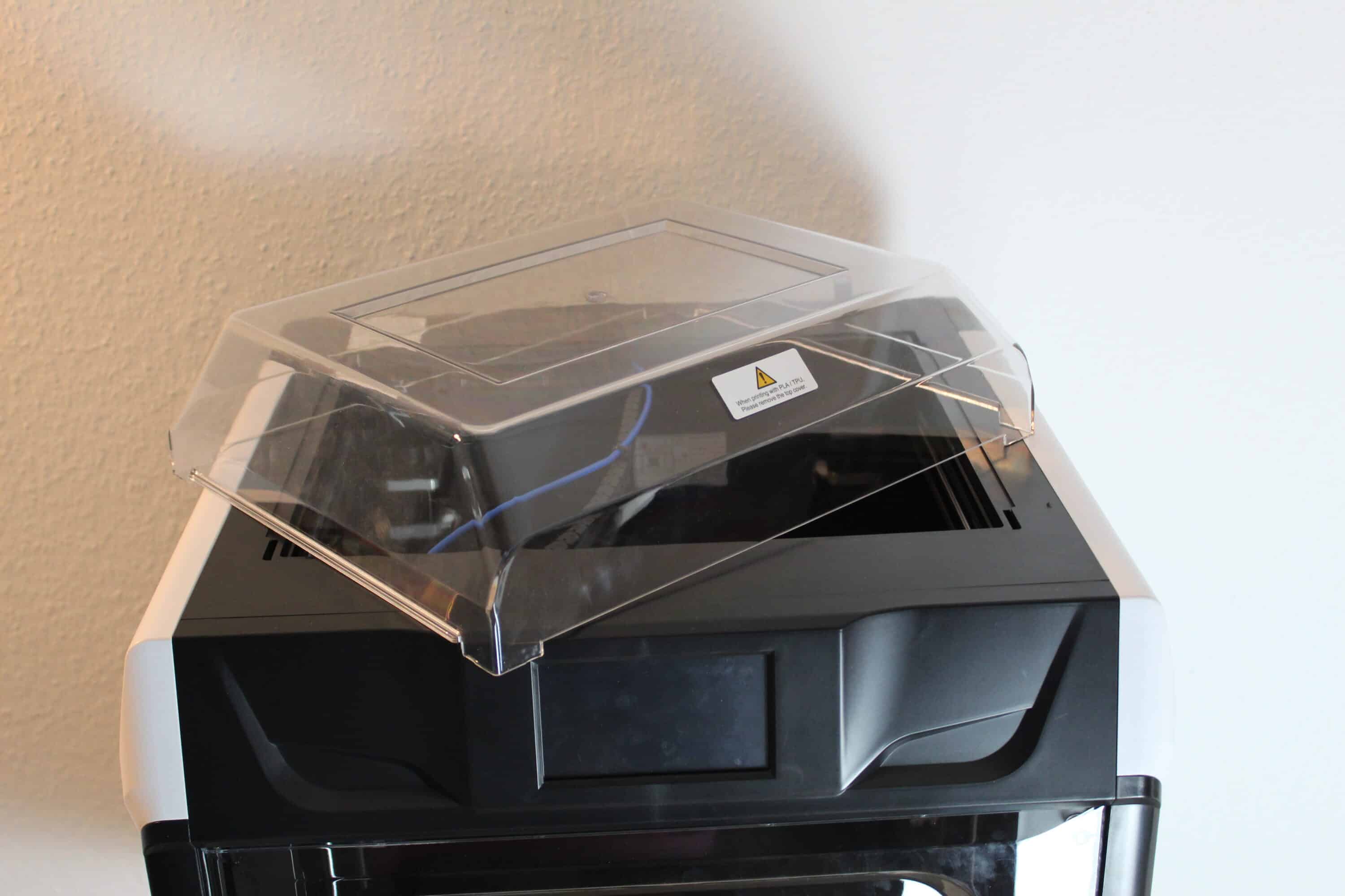 Auffallend ist, dass der QIDI X-Plus 3 einen geschlossenen und beheizten Druckraum besitzt. So kann man diesen über eine Tür aus durchsichtigem Kunststoff begutachten, ebenfalls ist ein erhöhter Deckel aus dem selben Material enthalten. Die Tür besitzt einige Vertiefungen aus Designgründen – dadurch ist der Blick ins Innere teilweise etwas verzerrt. Zusätzlich wackelt die Tür enorm, wenn man diese öffnet. Ehrlicherweise so sehr, dass man eher vermutet, dass irgendwo einen Schraube o.Ä. locker ist – das macht für den Preis einen etwas traurigen Eindruck.