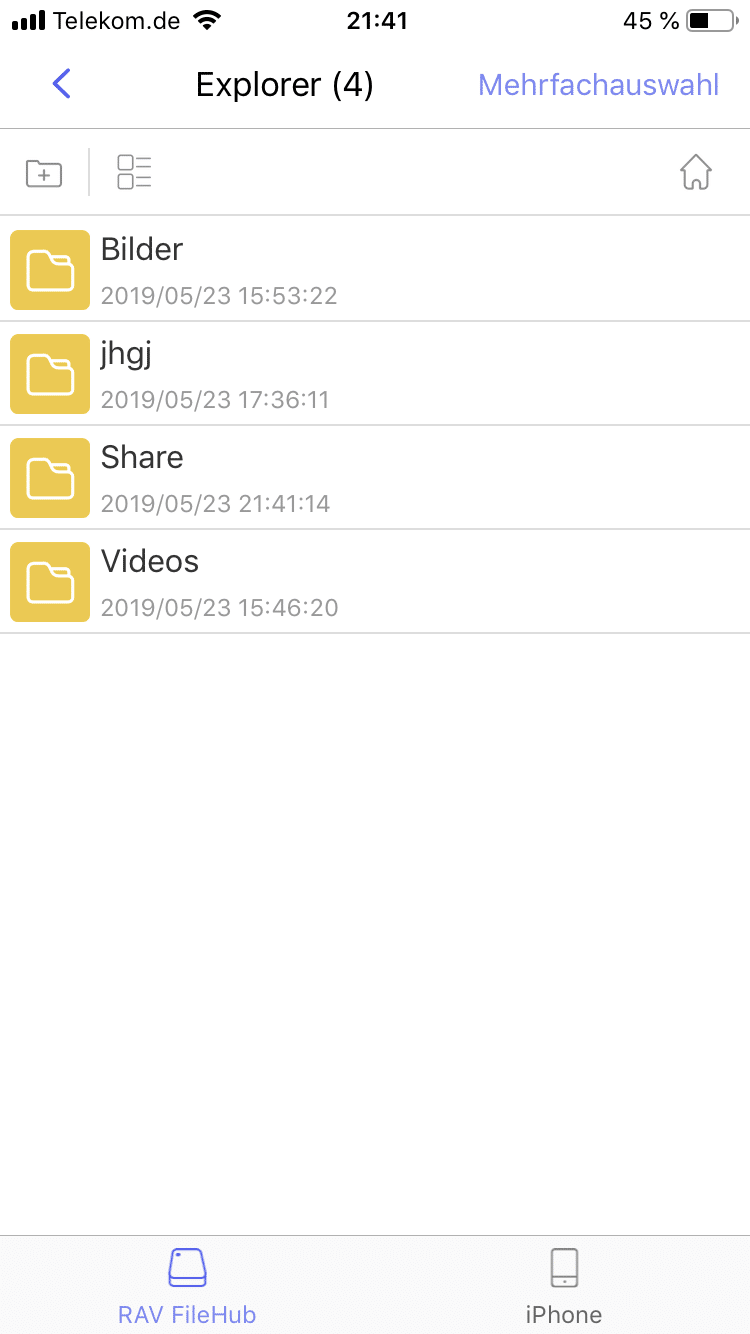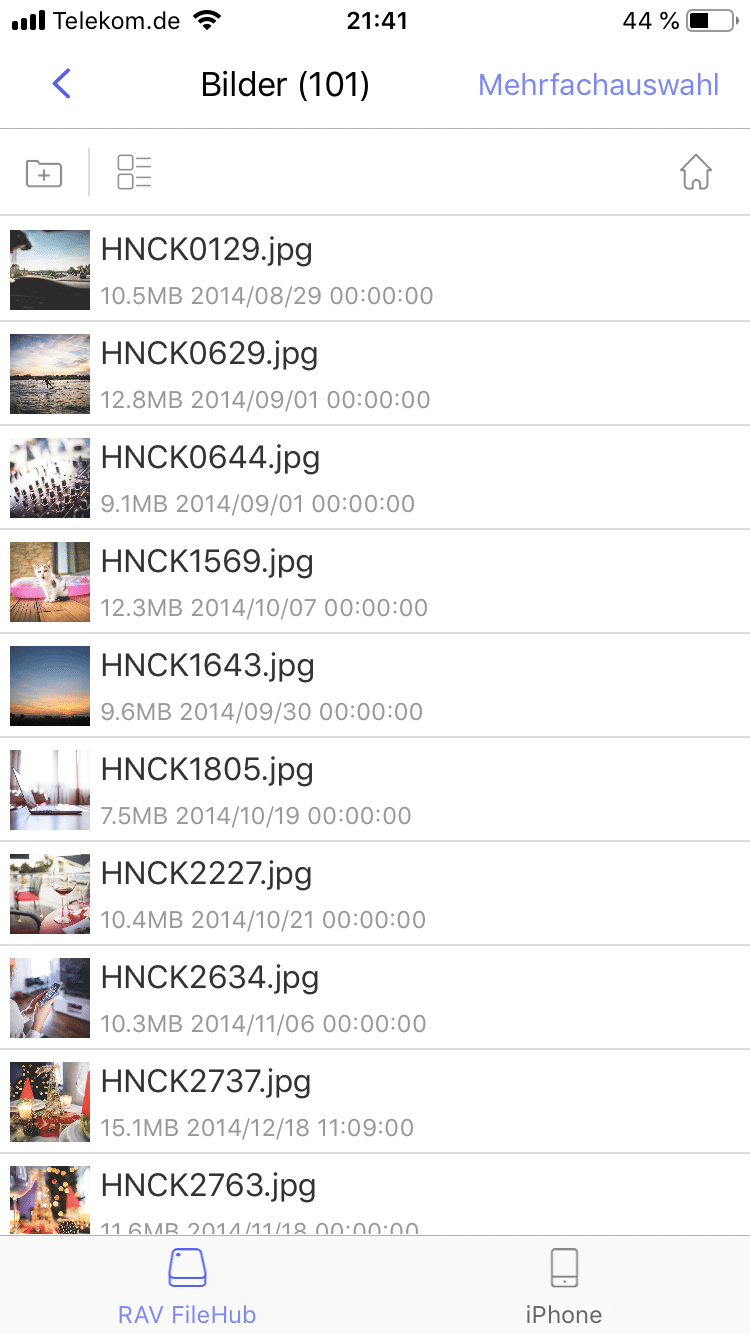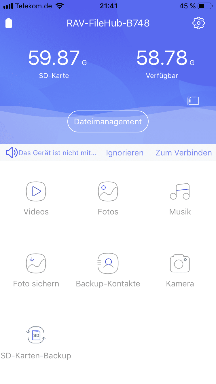Die Bedienung gestaltet sich einfach. Nachdem man den RAVPower FileHub eingestaltet hat, muss man sich nur noch mit dessen WLAN verbinden. Ab jetzt kann das Gerät mit der App (iOS / Android), oder über den Browser gesteuert werden. Hier kann man auf alle Daten zugreifen, die auf der SD-Karte oder dem USB-Laufwerk gespeichert sind. Ausserdem können Bilder, Videos und anderer Dateien über die App auf dem FileHub ohne großen Aufwand gesichert werden.