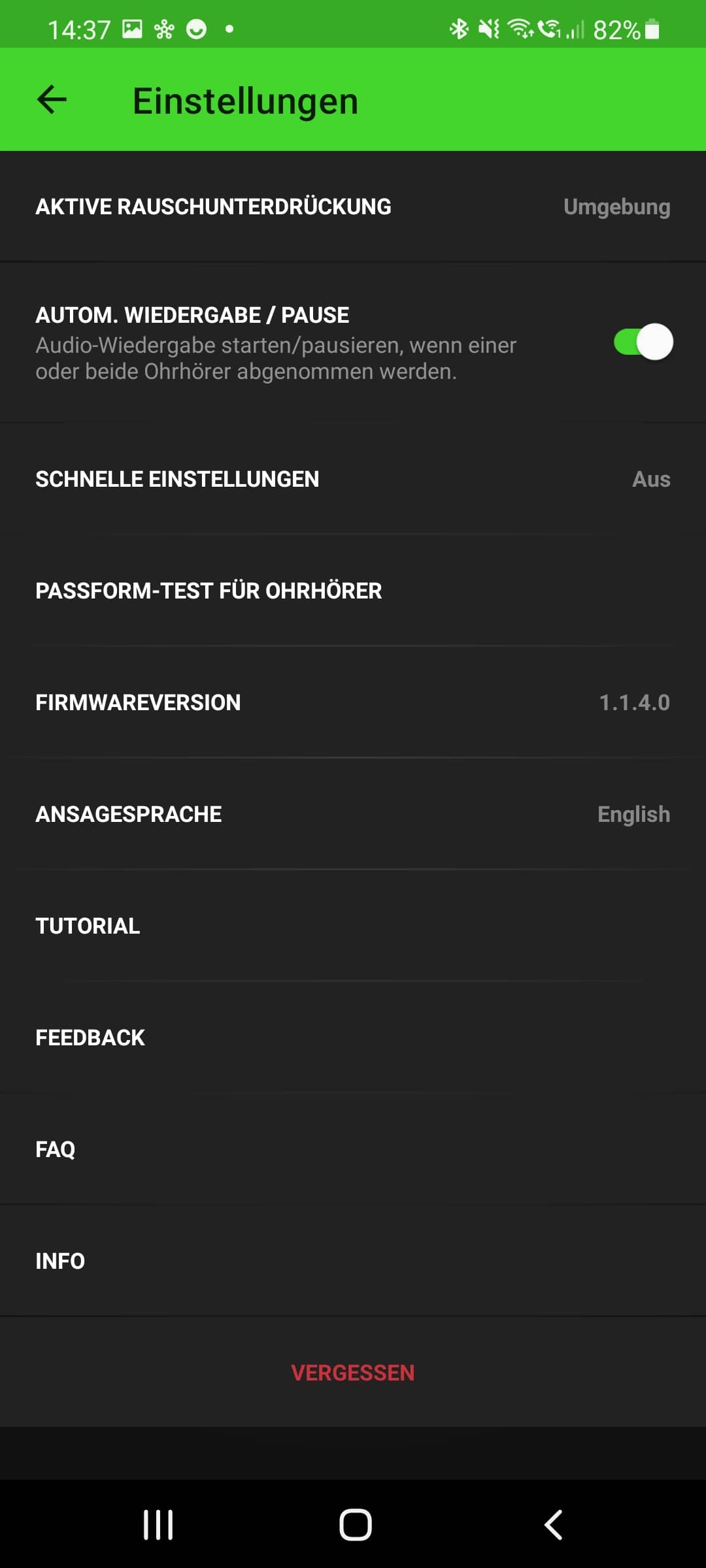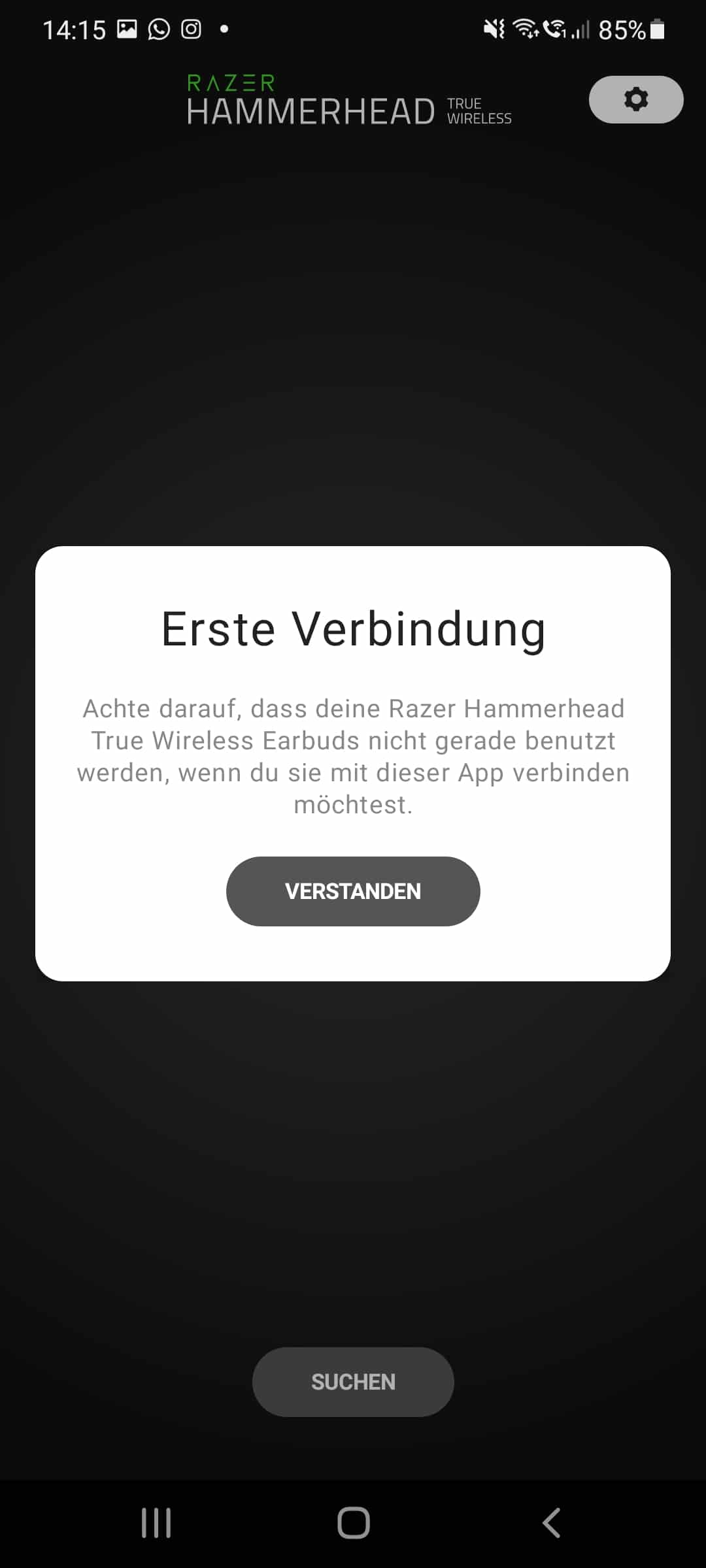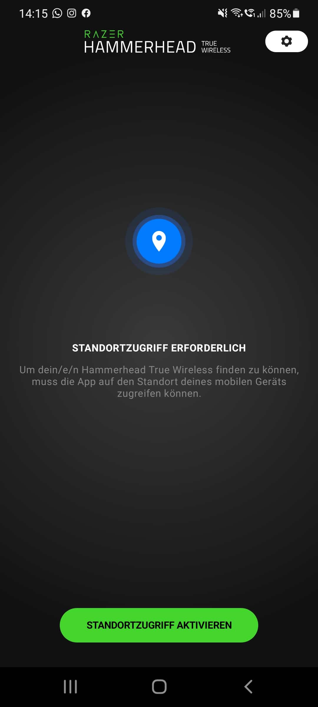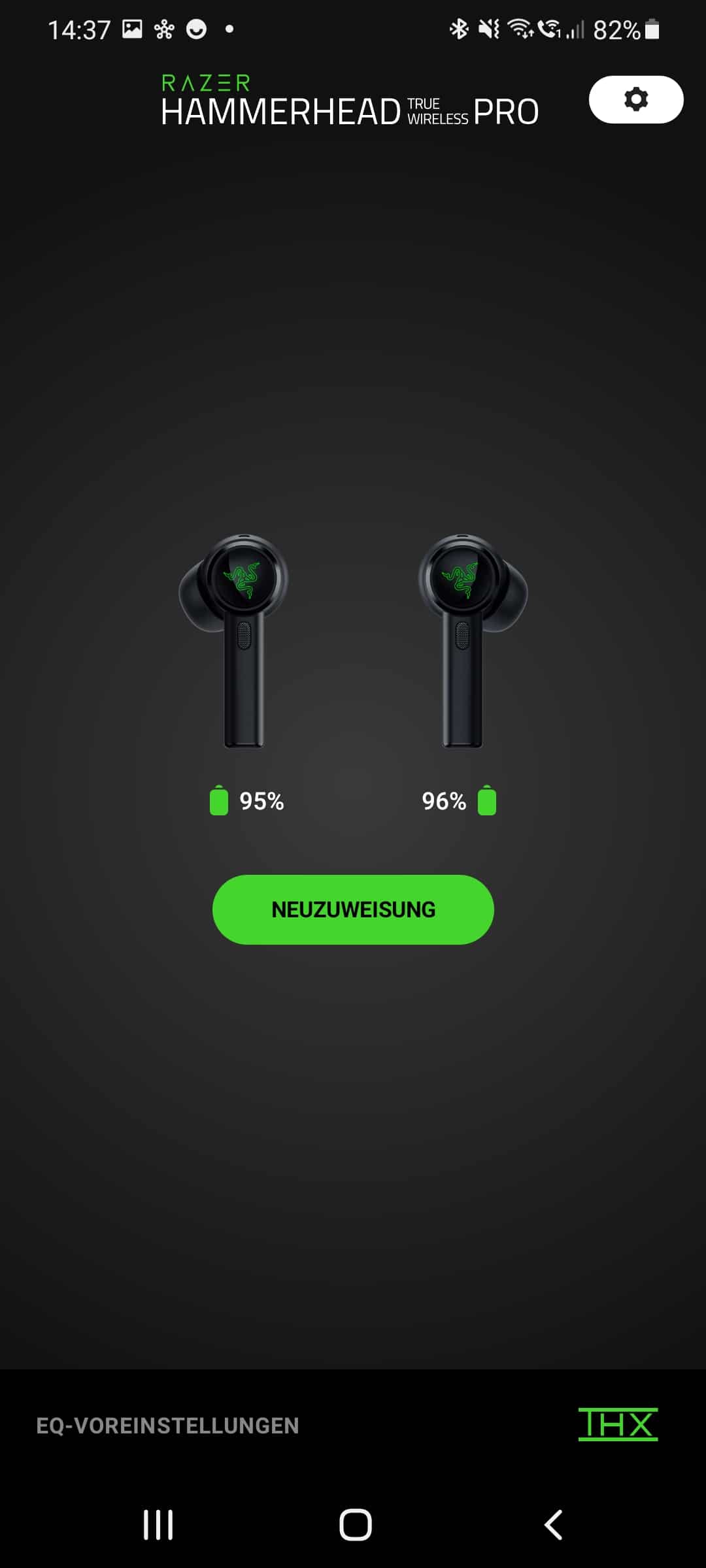 Ansonsten können noch der Game Mode, die Sprache, die Rauschunterdrückung (auch für Umgebung) sowie schnelles Verbinden mit einem Gerät aktiviert bzw. deaktiviert werden. An dieser Stelle sei noch erwähnt, dass die Razer Hammerhead True Wireless Pro Earbuds nur mit einem Gerät gleichzeitig verbunden sein können. Möchte man dieses wechseln, muss man dies manuell tun. Außerdem fordert die App die Berechtigung auf den Standortzugriff, obwohl es keine Funktion gibt, die dies rechtfertigen würde.