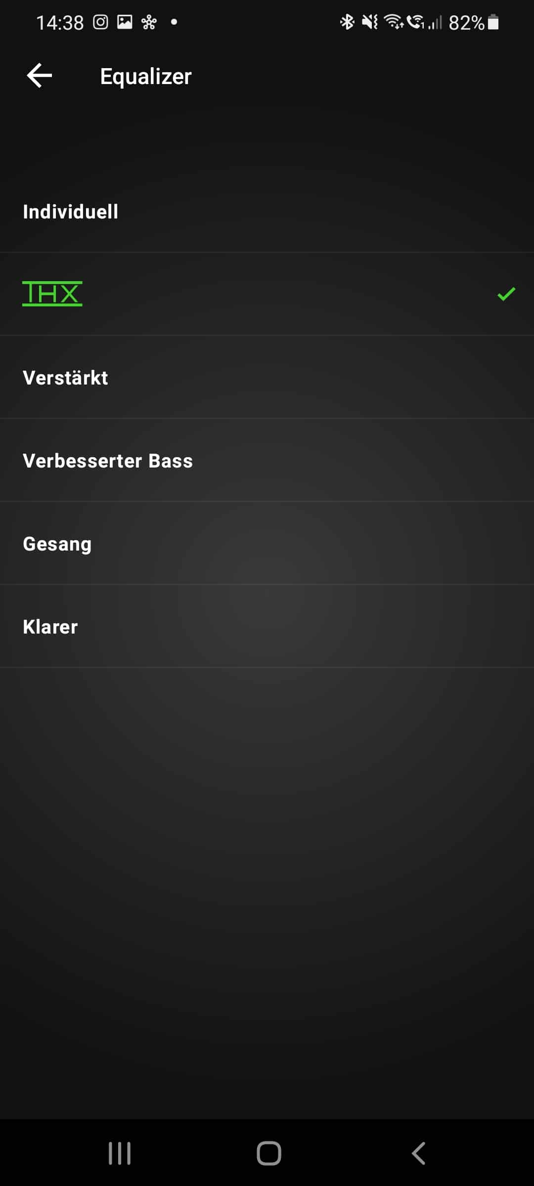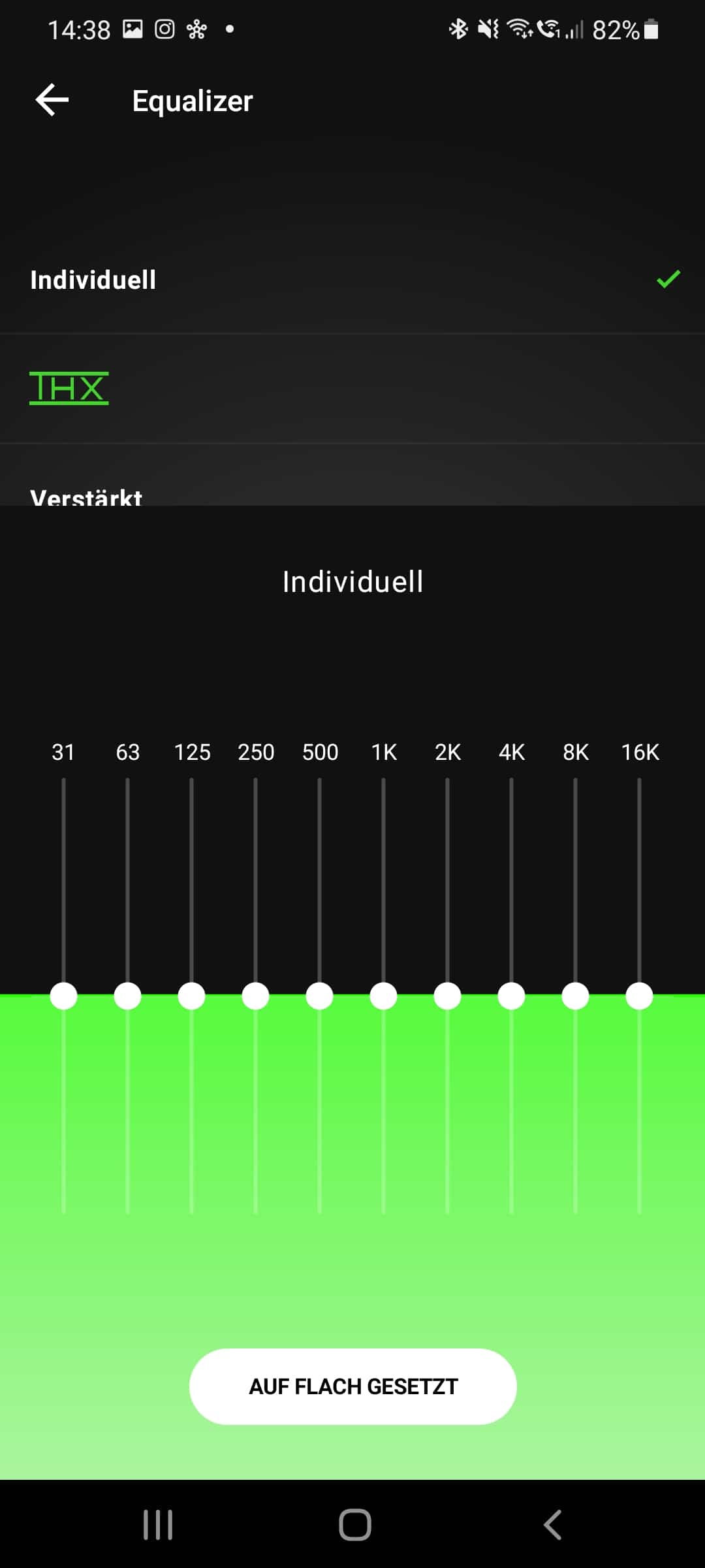 Darüber hinaus bietet die Razer-App auch einen Equalizer, der bereits fertige Profile abbilden kann, aber auch eine Möglichkeit der Individualisierung bietet. Beispielsweise kann auch das THX-Profil ausgewählt werden, welches den besten Klang, selbst bei hoher Lautstärke, garantiert. Insgesamt sind vier weitere Profile vorgespeichert: Gesang, Klarer, Verbesserter Bass und Verstärkt.