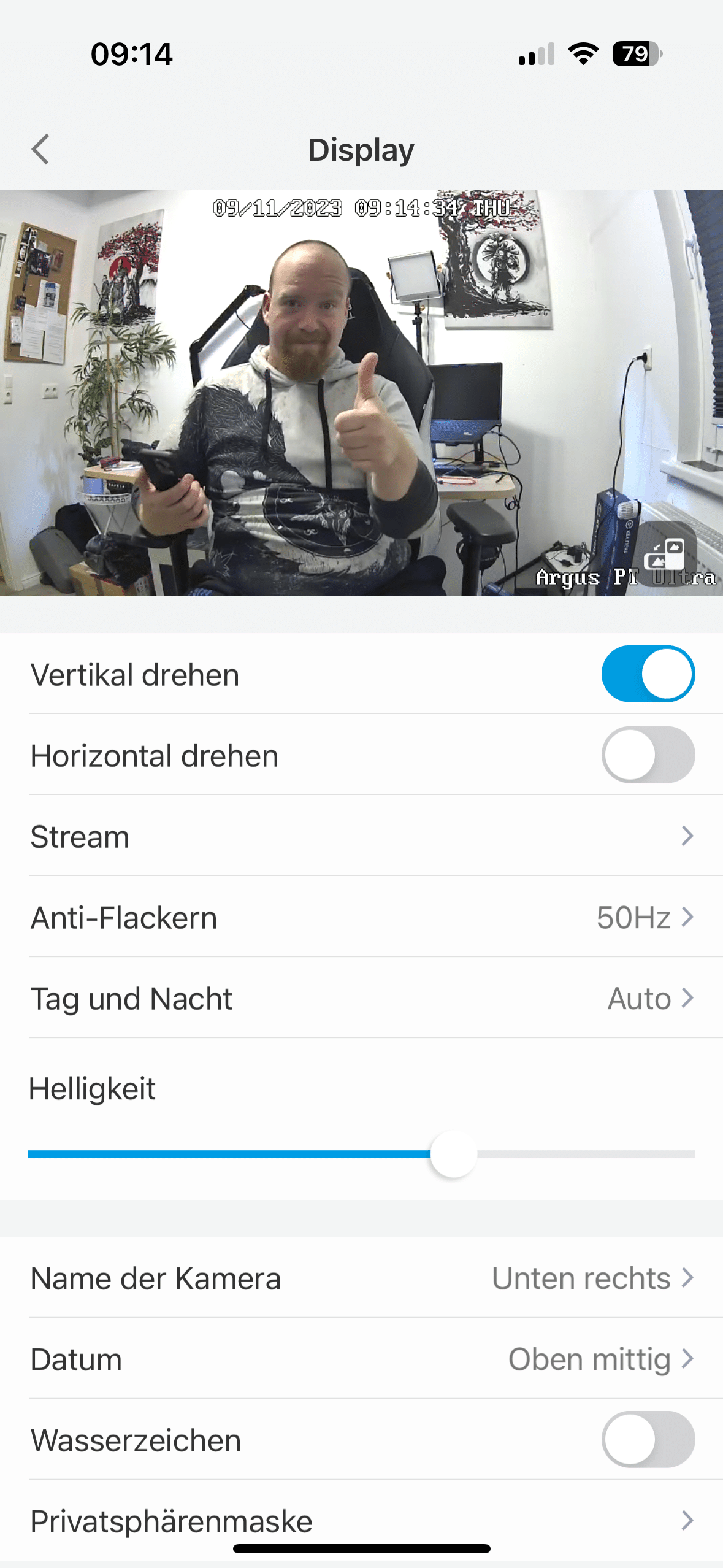 Oberhalb des Vorschaubildes hast du die Möglichkeit, Einstellungen an der Kamera vorzunehmen. Darin lässt sich beispielsweise die Anzeige vertikal oder horizontal drehen, die Helligkeit anpassen oder die Laustärke von Alarmsirene und Gegensprechanlage anpassen.