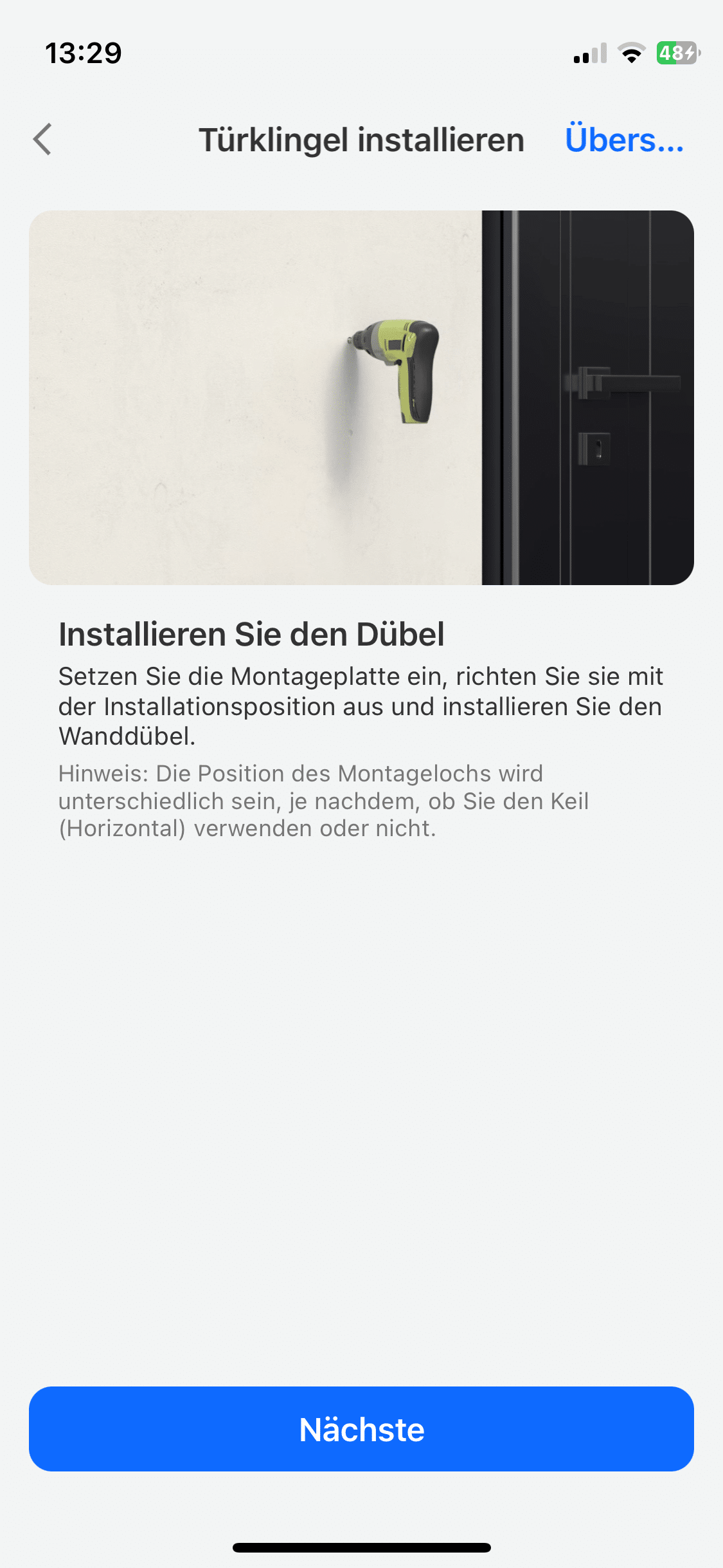 Etwas schade finde ich, dass die Winkelplatte nicht die Standardplatte ersetzt. Wer also die Unterlegscheibe nutzen möchte, muss zusätzlich noch die Standardhalterung aufsetzen, was die Videotürklingel noch einmal deutlich tiefer werden lässt. Wenn die Wandhalterung fest ist, solltet ihr die Klingel noch nicht gleich befestigen. Zuvor solltet ihr nämlich erstmal den Akku vollständig aufzuladen